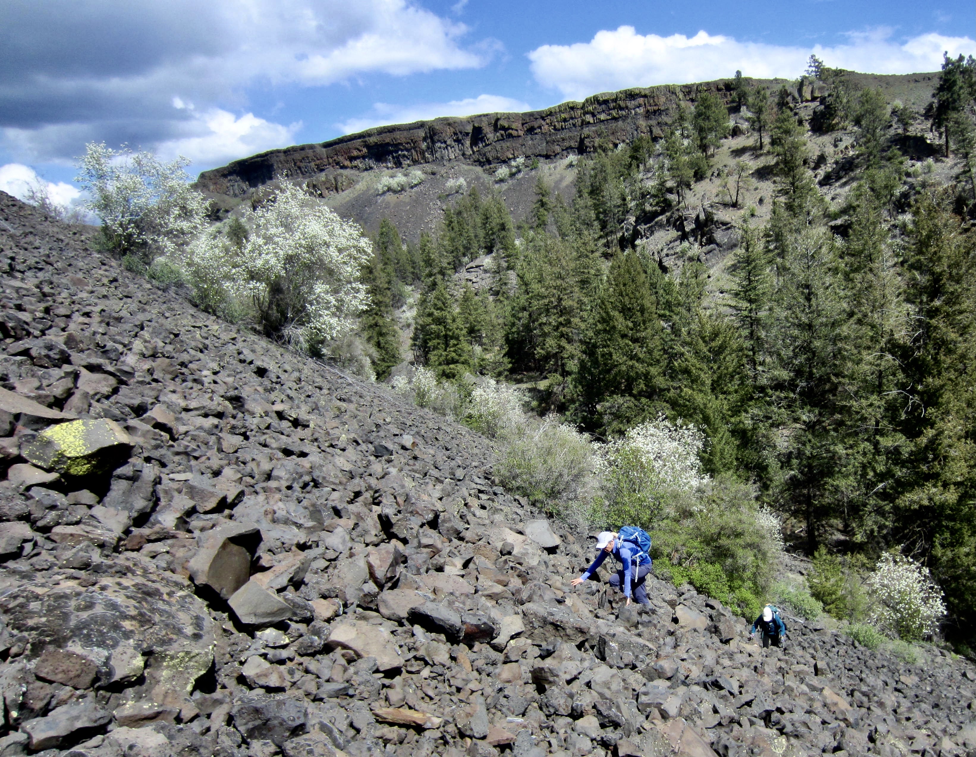 For a lunch spot, we hiked up to a gentle rib that separates Northrup Lake from the upper reaches of Northrup Canyon. This gave us a good view of the basalt cliffs across the canyon. During our hike in, Fay had made some casual comments about wanting to get onto the plateau above the canyon rim. Now, these casual comments were being worked into a serious plan of attack. Our final strategy involved dropping into the canyon invert, scrambling up a talus slope below the cliffs, then traversing leftward (southwesterly) along the cliff base until finding some sort of weakness that would allow us to gain the plateau.