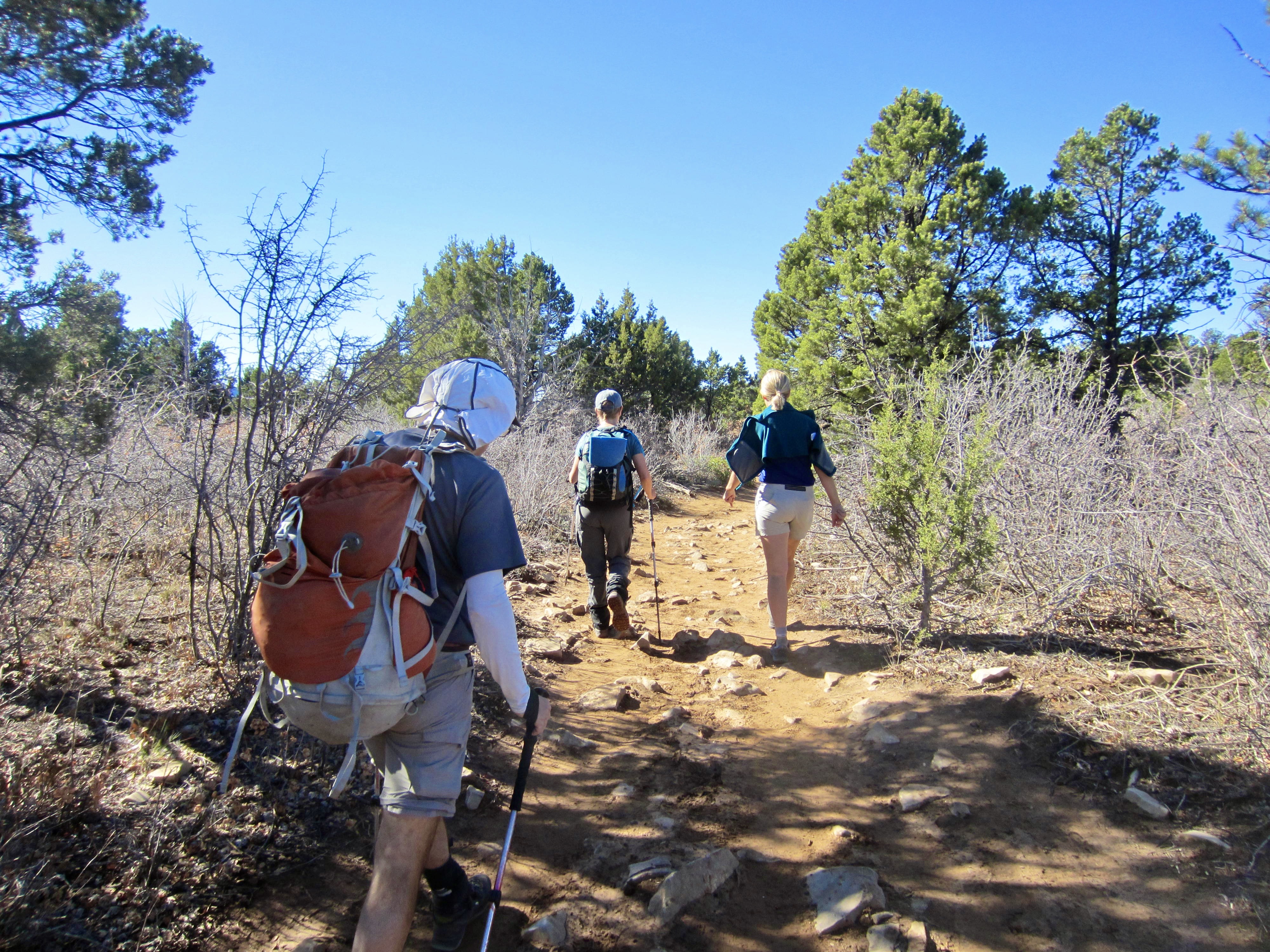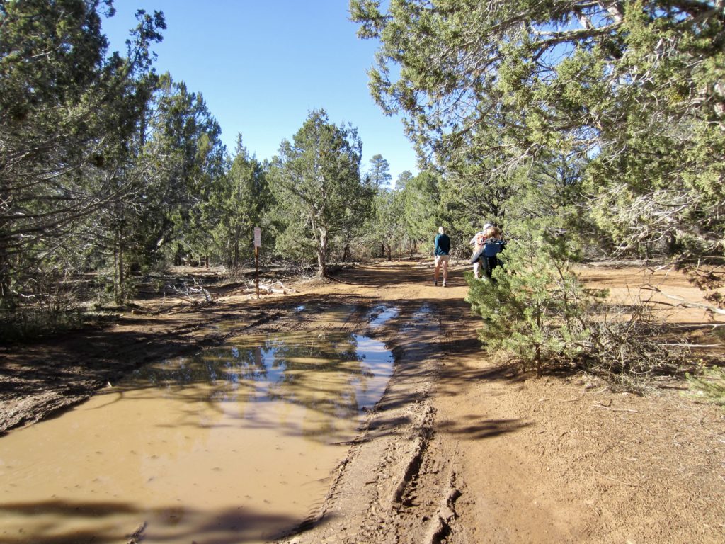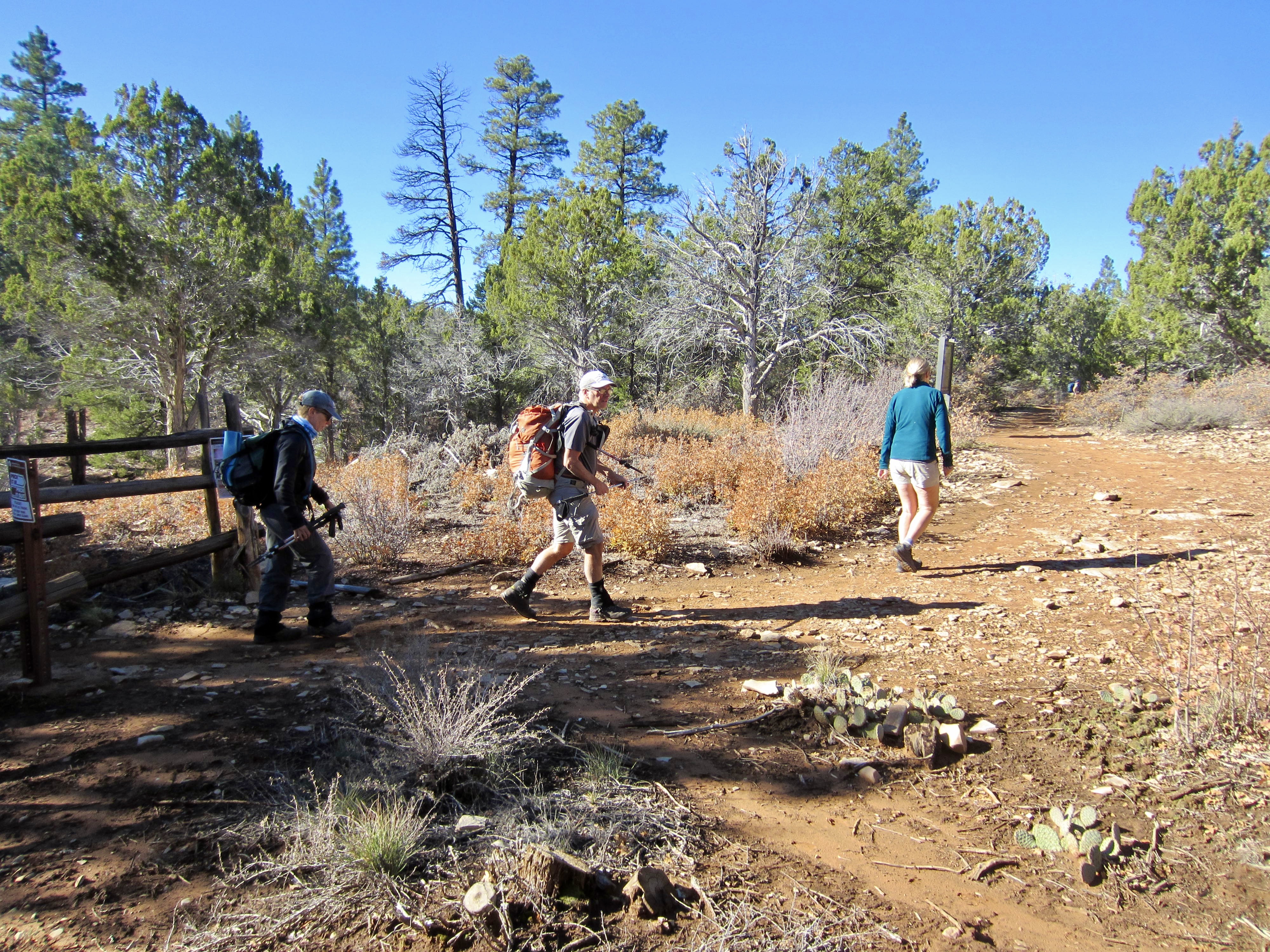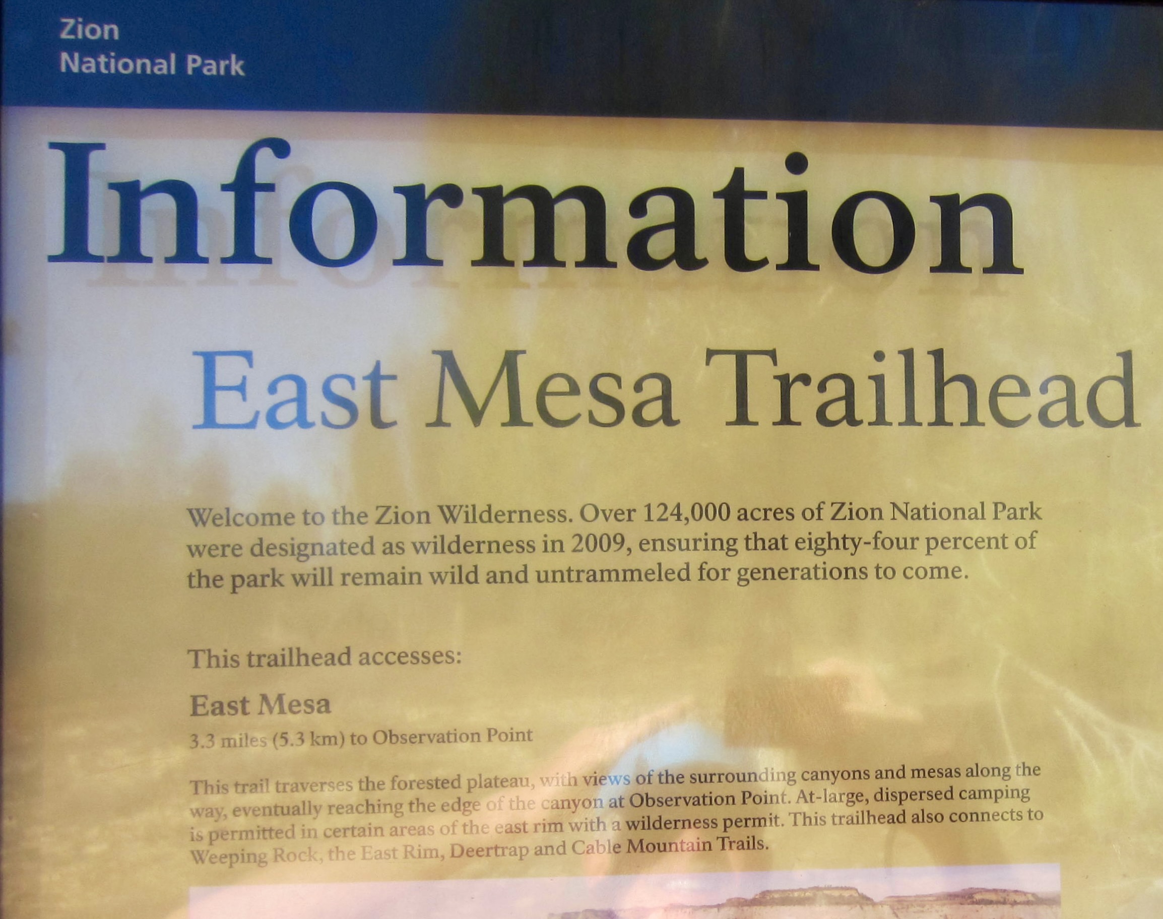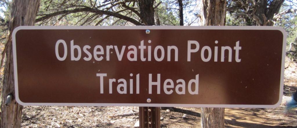 From our parking spot, we walked along a short road segment to the park boundary, marked by a gated fence. Several signs identify this as both the Observation Point Trailhead and East Mesa Trailhead. The easy-going trail took us southwestward across open forest and scrubland on East Mesa for 3 miles, making gentle ups and downs with no net elevation gain.