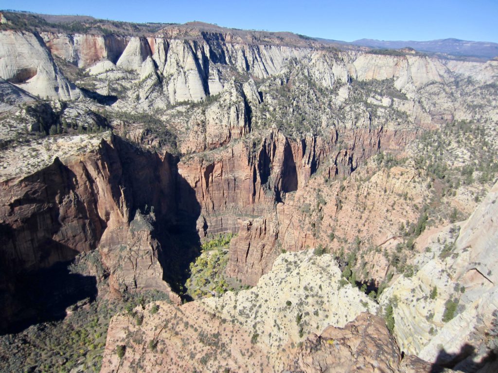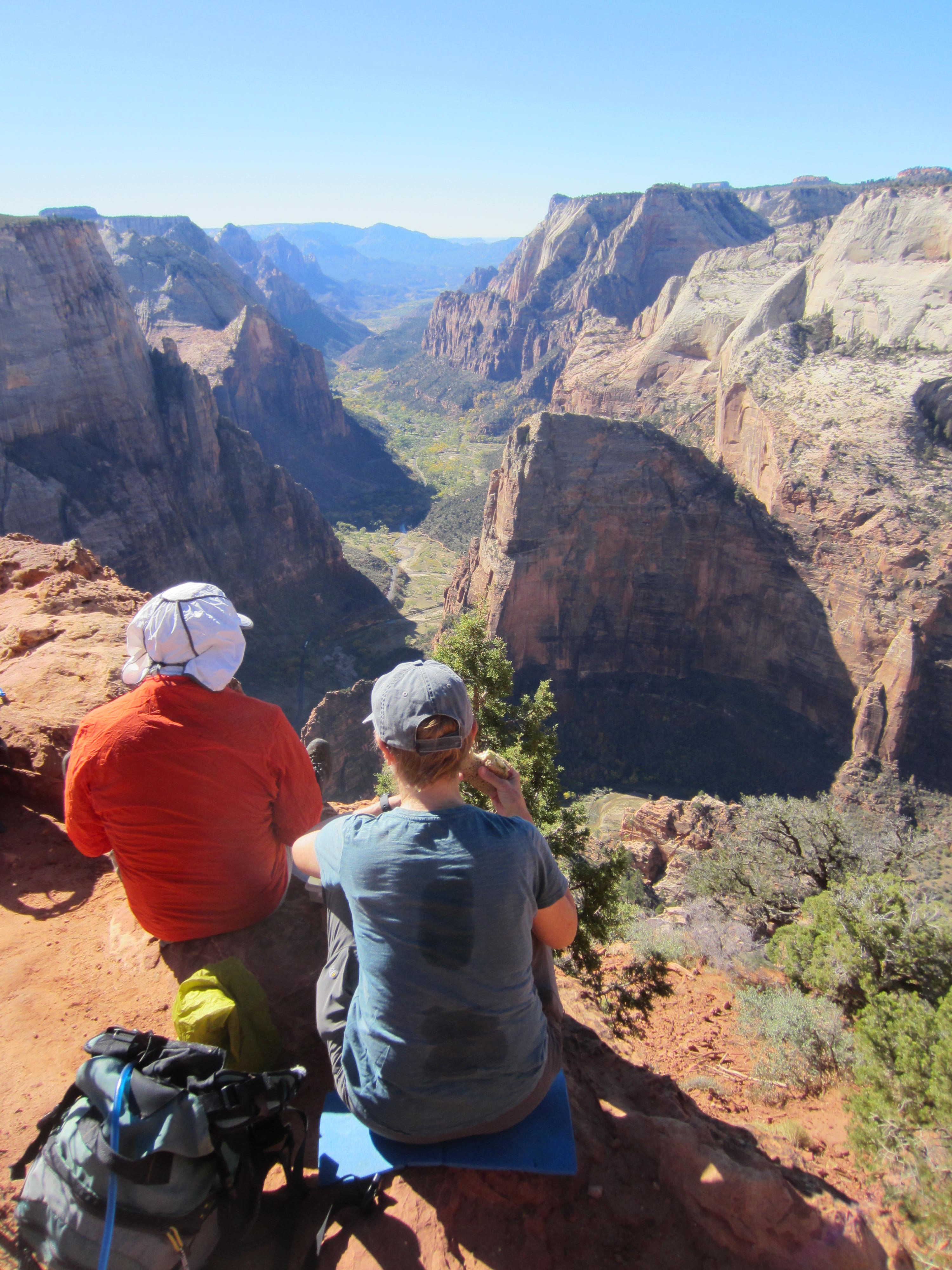 Upon arriving at a trail junction, we took a short spur trail out to Observation Point (1.3 hours + 300 feet from TH). This marvelous vantage affords great views in multiple directions: southward through the North Fork Virgin River valley; northward to Zion Narrows; straight down into Zion Canyon; and across the canyon to the West Rim. Using Steve’s monocular, we could see a cluster of hikers atop Angel’s Landing—located 1 mile away, at an elevation 700 feet below us.