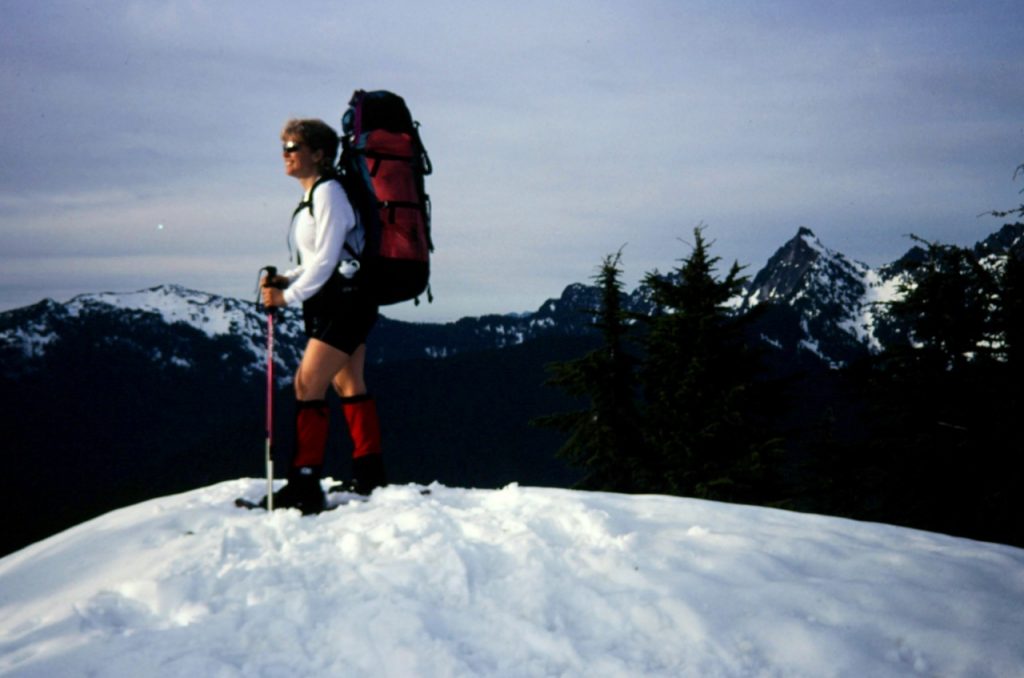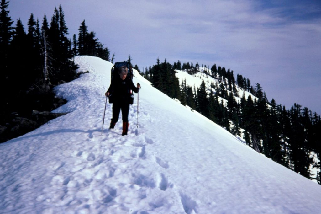 From the pass, we donned snowshoes and proceeded up the east ridge of Pratt Mountain. This ridge is easily ascended through light forest and requires only one short detour around a rock outcrop. The snow was soft and would have been difficult without snowshoes. We stomped out a bench on the summit (4.0 hours from TH), pitched our tent, and enjoyed the views of Mt. Rainier and the Alpine Lakes area. The weather was pleasantly warm all night, and calm too, except for a windy spell around midnight.
