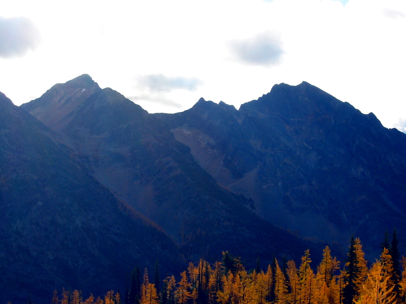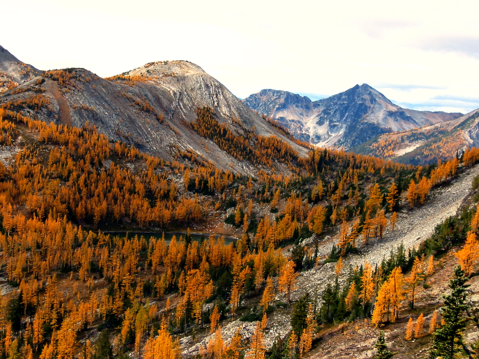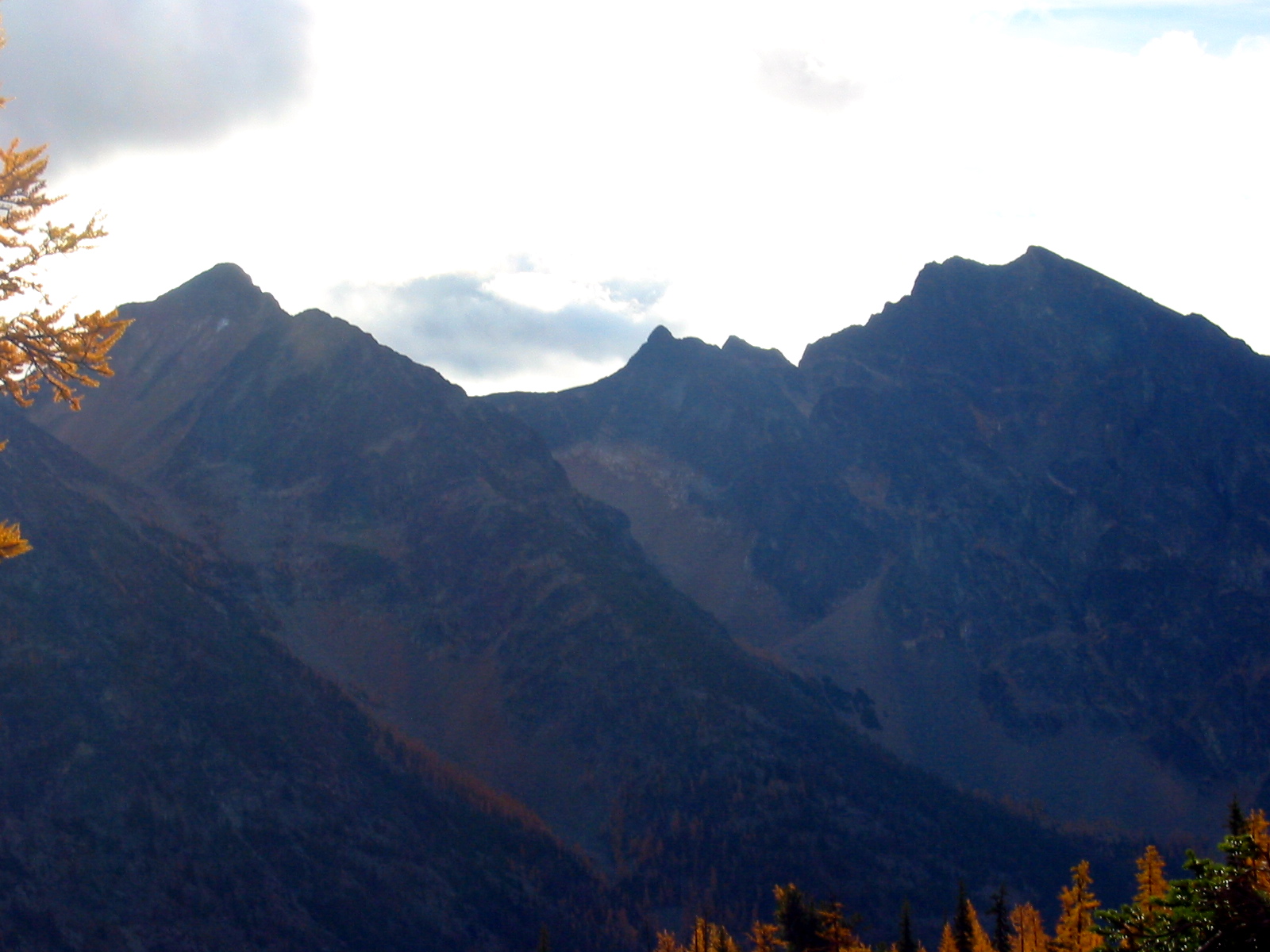 October weather in the mountains can run the gamut from miserable to glorious, even within the span of a weekend.  My plans for this year’s annual Golden Larch Trip were beset by a forecast that leaned more toward the former than the latter.  Nonetheless, Kevin, Janet, and Mike eagerly joined me for a trek into the central Pasayten Wilderness on October’s opening weekend.  In fact, Janet and Mike hiked in a day ahead of Kevin and me to get some extra time for sidetrips.  This turned out to be a good strategic move, because we later decided to shorten the trip by one day on account of worsening weather.