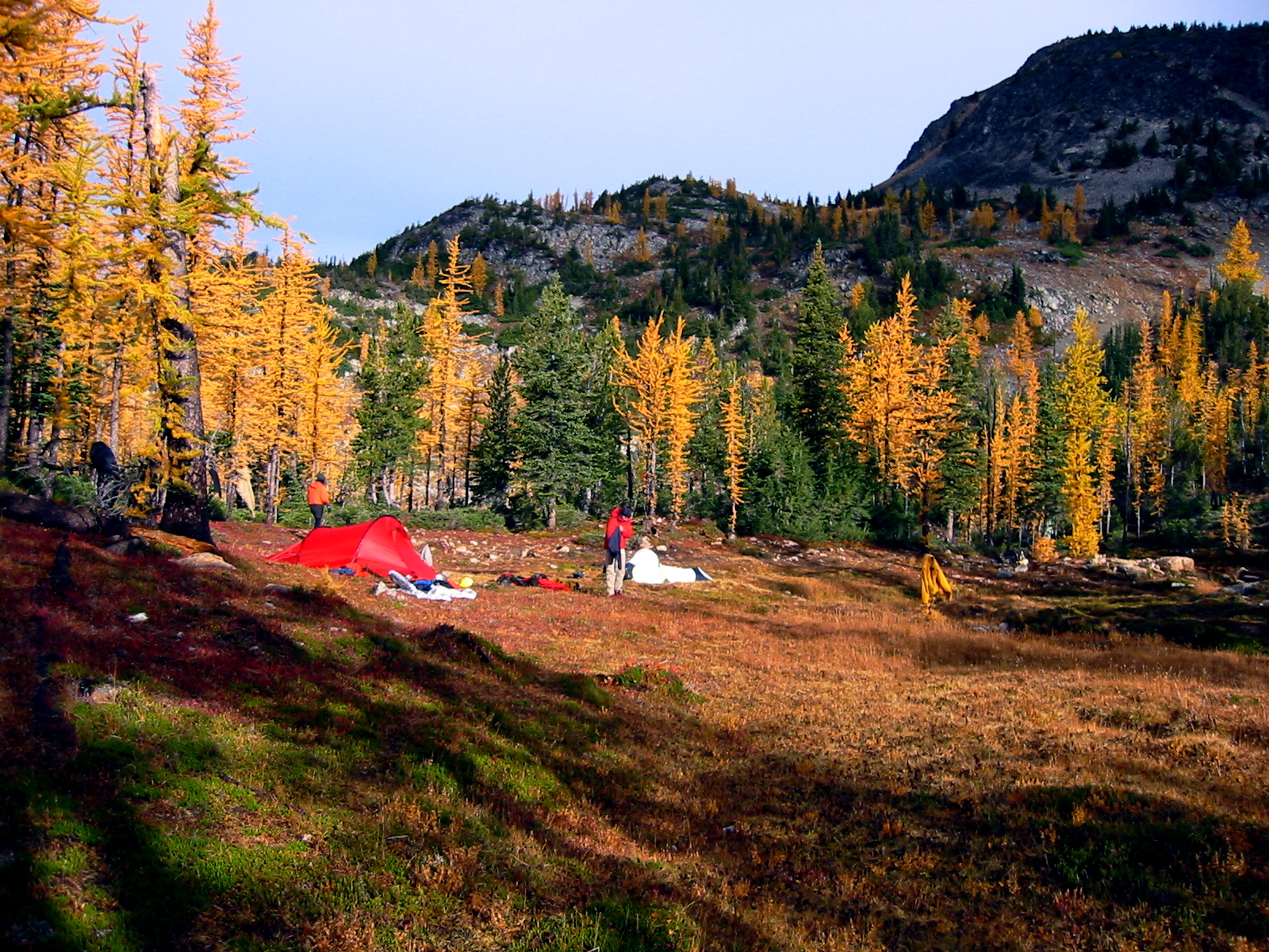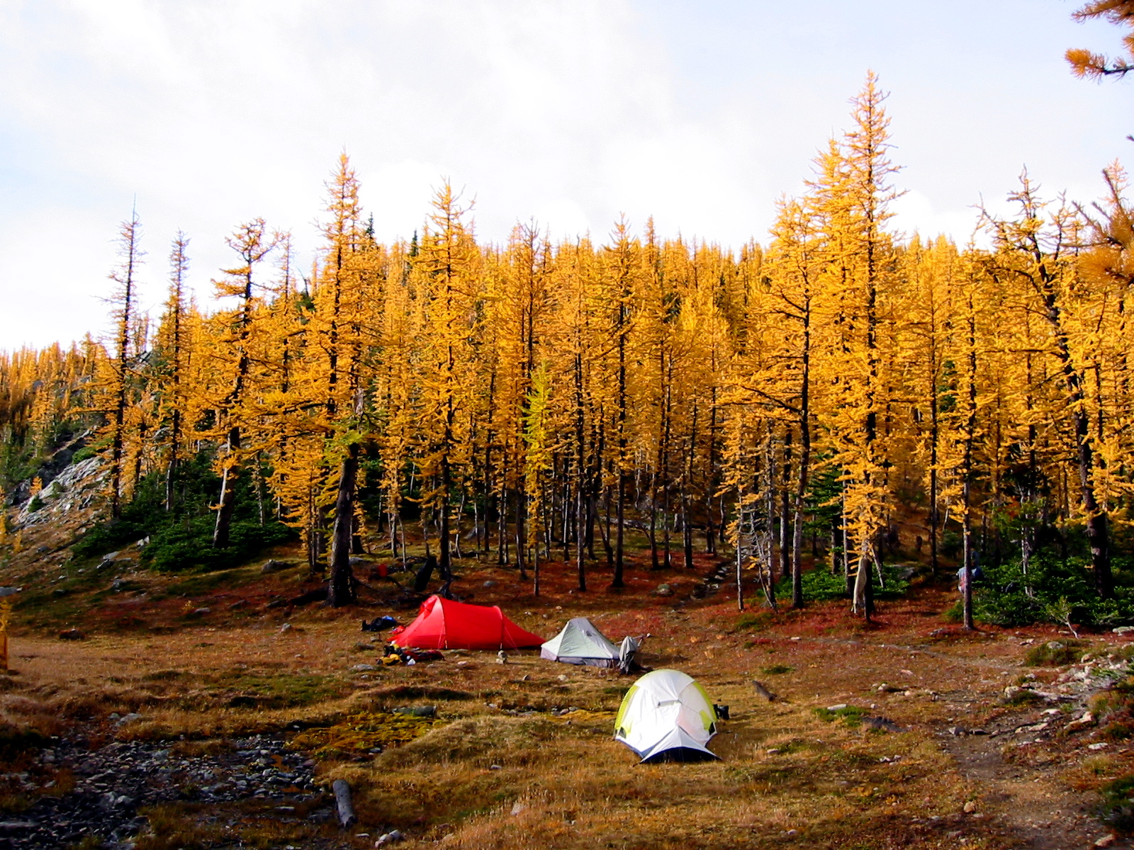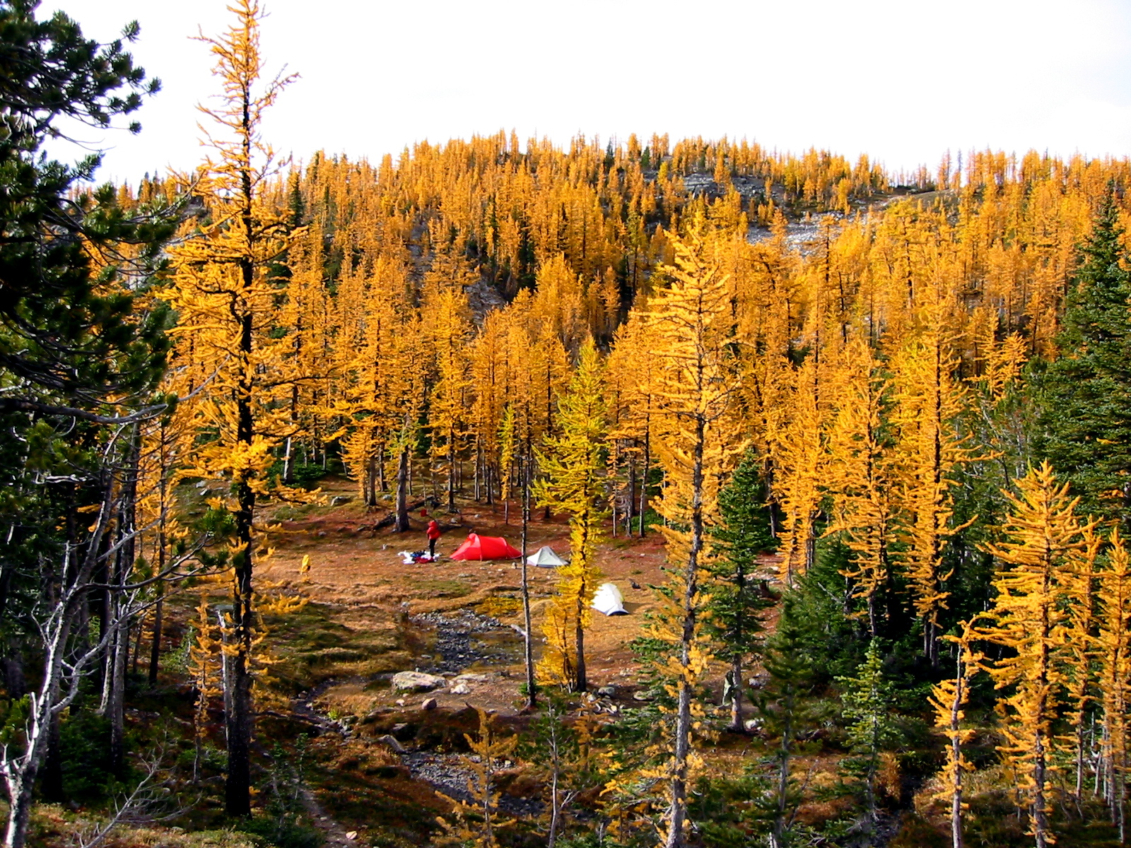 The wind and rain persisted throughout the night, but by morning it was fairly quiet and dry, with sunbreaks that illuminated the golden larch trees around camp.
