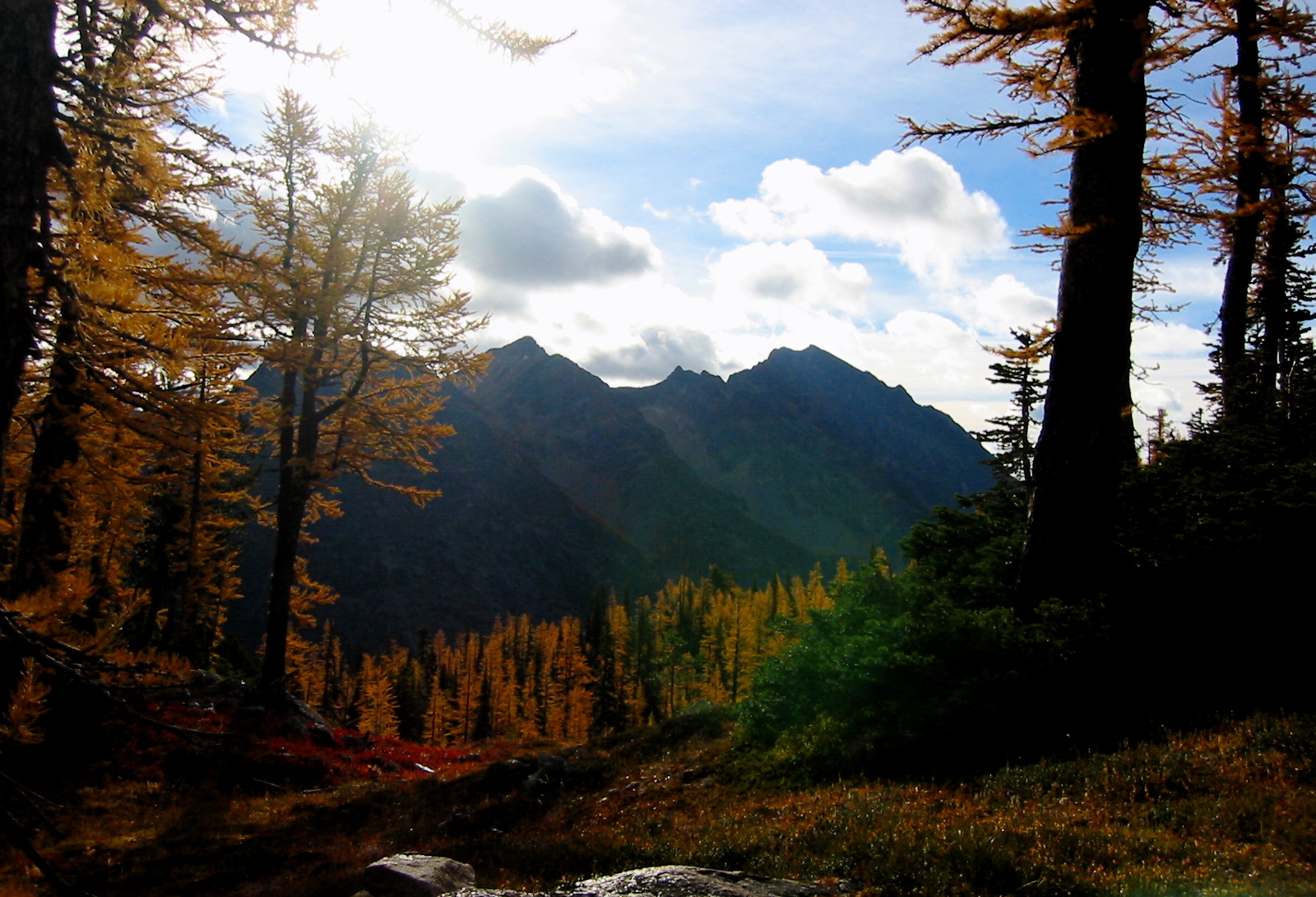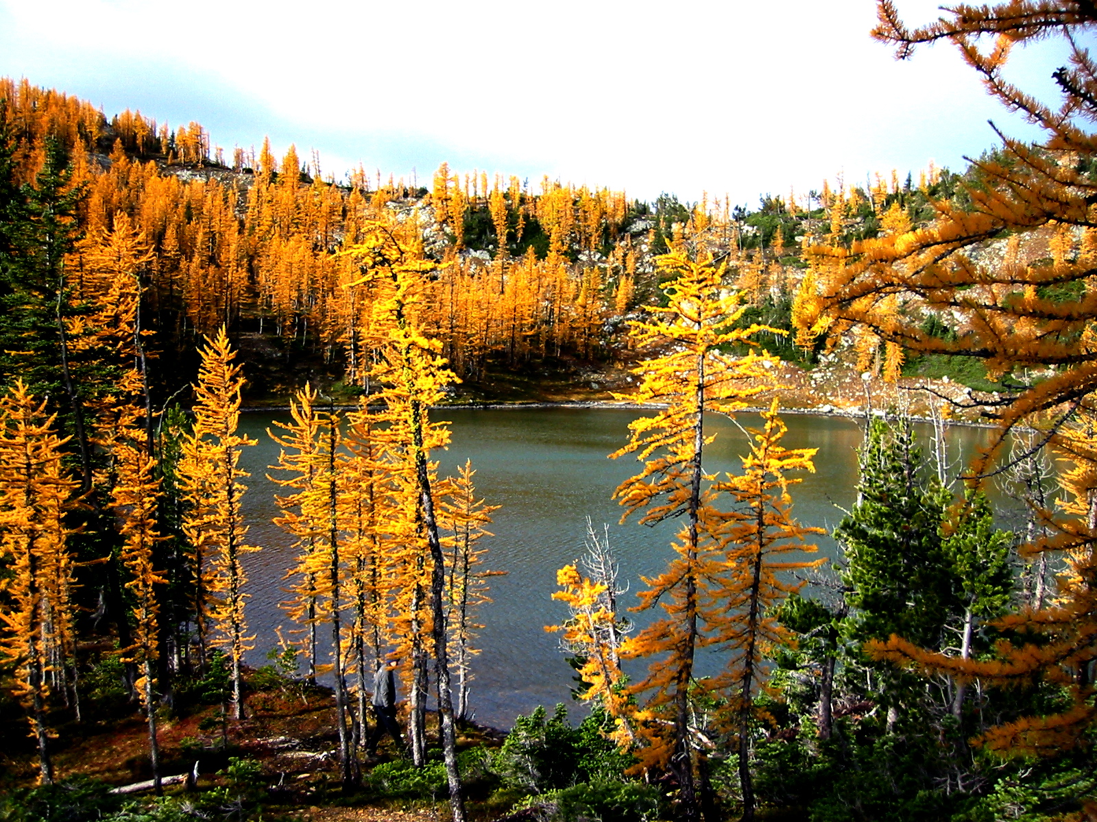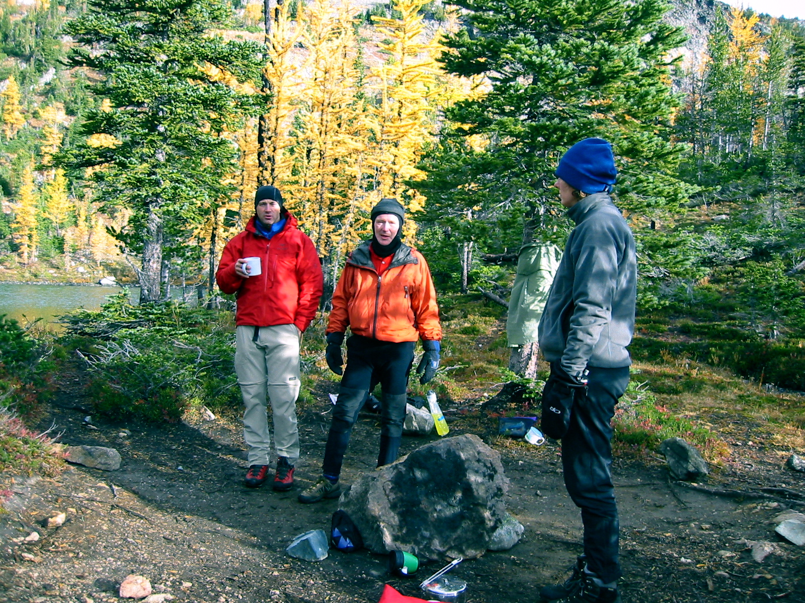 The wind and rain persisted throughout the night, but by morning it was fairly quiet and dry, with sunbreaks that illuminated the golden larch trees around camp.