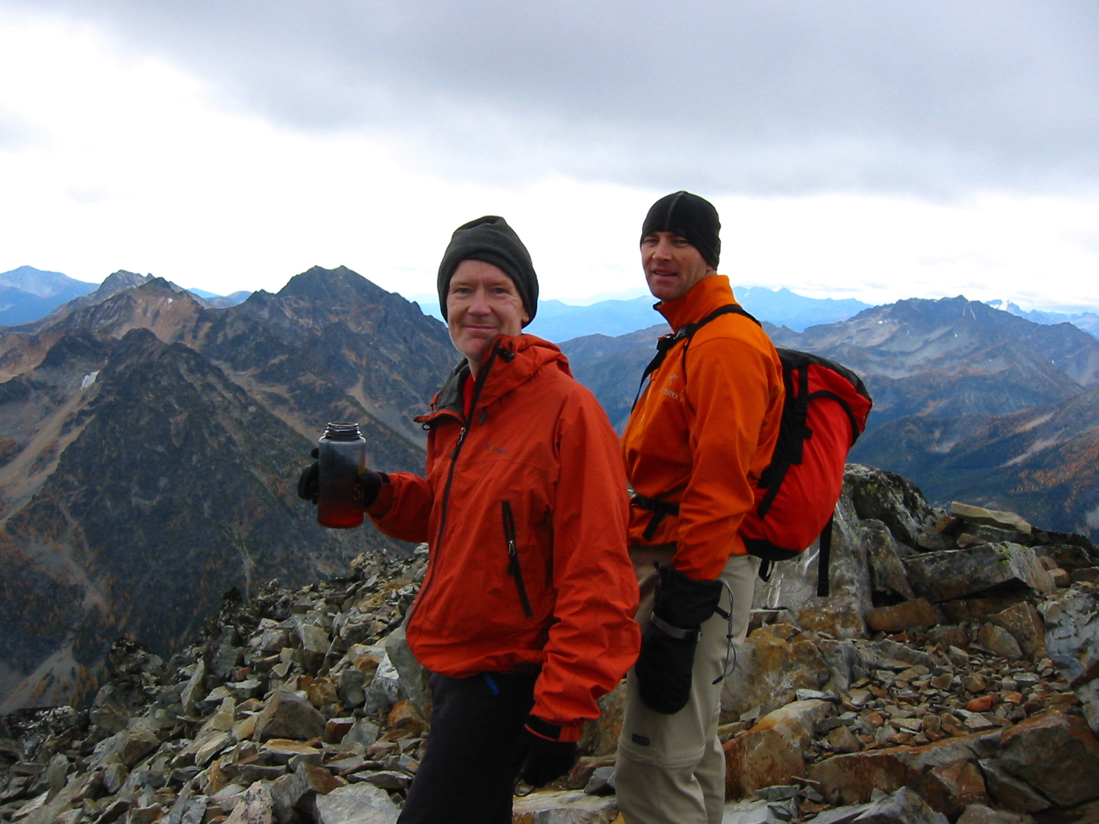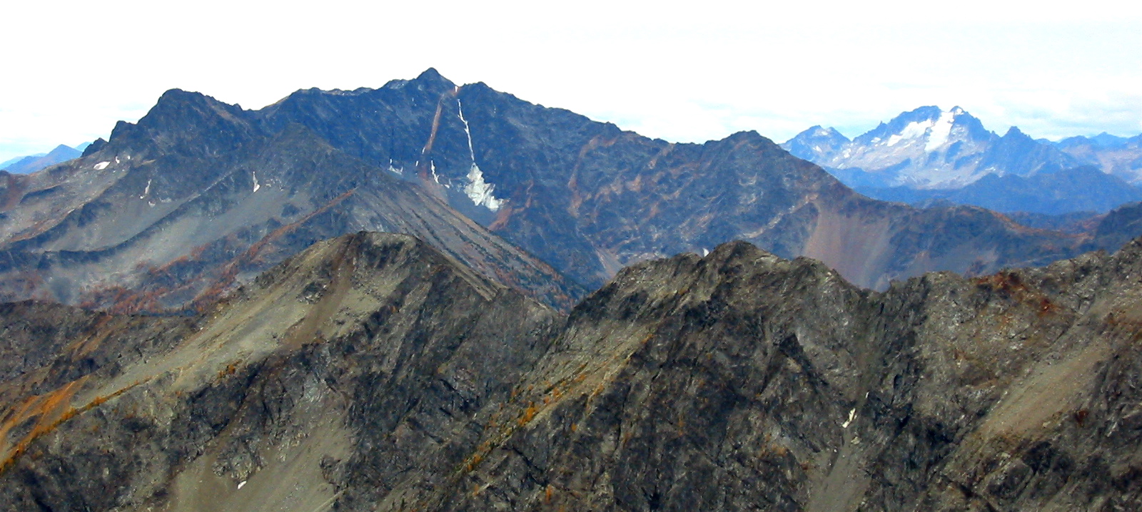 We topped out in mid-morning (1.2 hours from camp) and spent 30 minutes on the unexpectedly calm summit.  The high, broken cloud cover allowed views as far east as Remmel Mountain and as far west as Jack Mountain;  farther west, however, the sky was ominously dark.