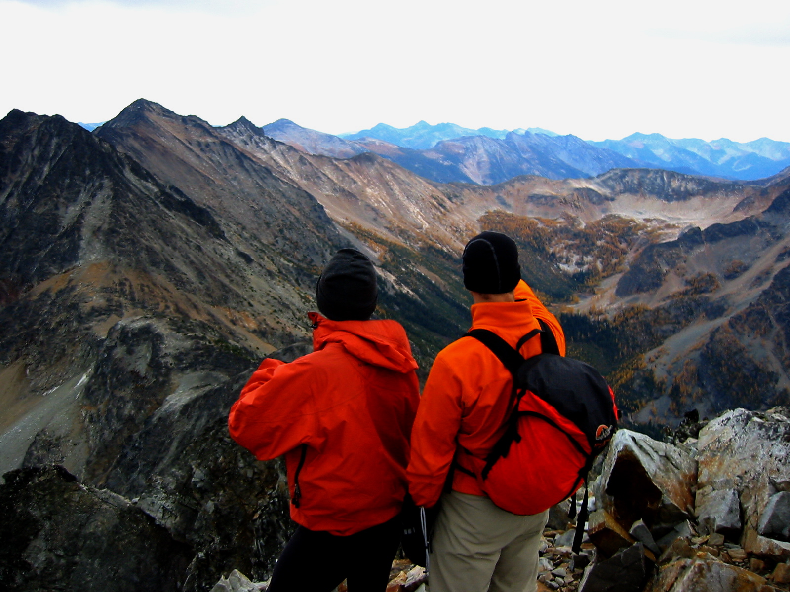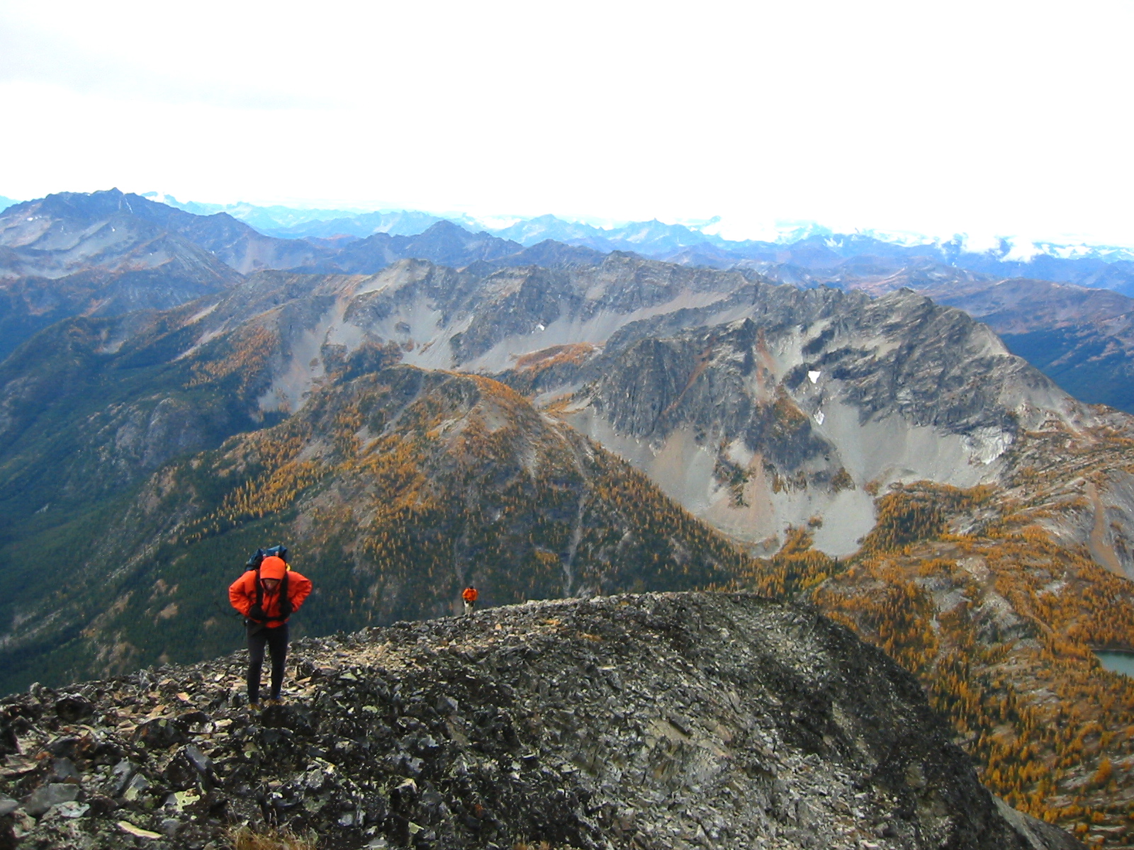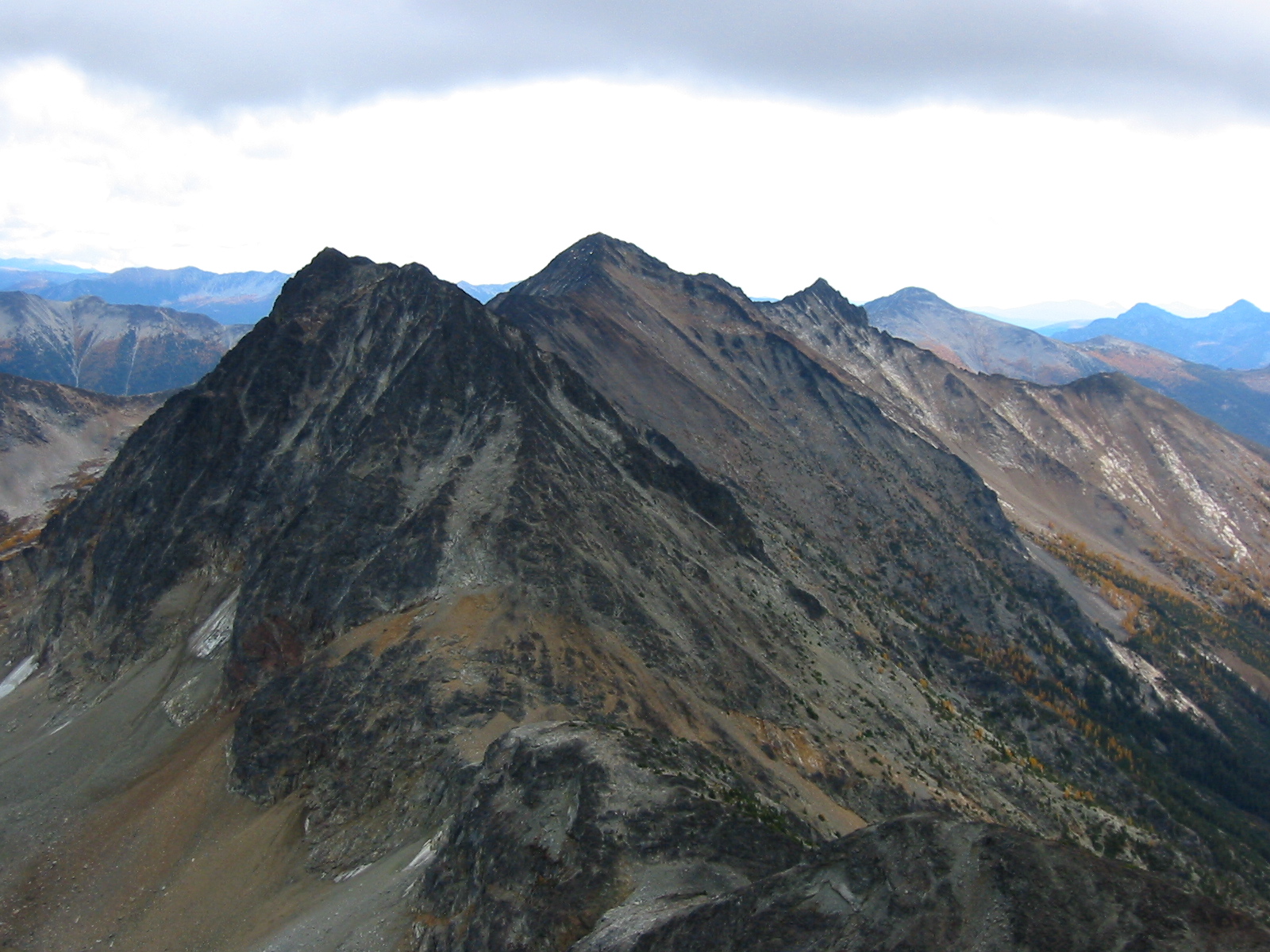 Mt. Rolo’s north ridge begins as a pleasant cross-country stroll through larch forests above the pass, then it transitions into a Class 2-3 scramble along a rocky crest.  This turned out to be a very fun and satisfying route, which Mike proclaimed as the best of his four recent climbs in the area.  We spent a short time on the summit (0.9 hours from pass) admiring the local peaks and valleys and beautiful larch groves.  The air seemed to portend more foul weather, so we didn’t linger.