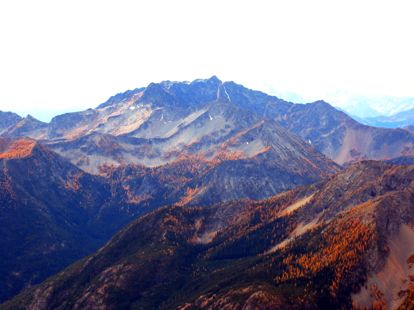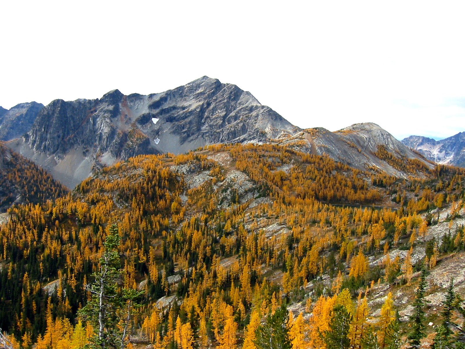 Osceola Peak stands above a forest of golden larch trees in the Pasayten Wilderness
