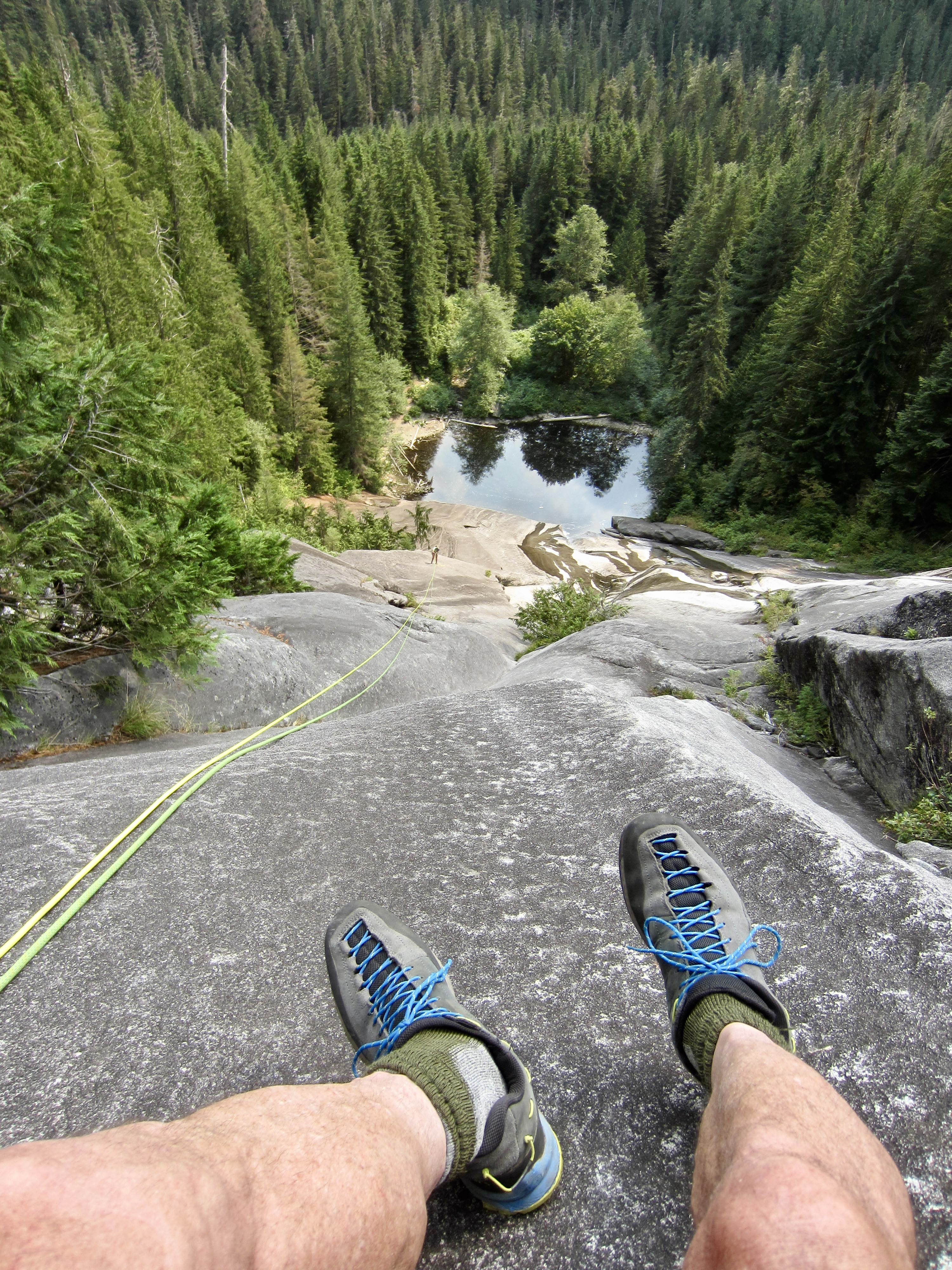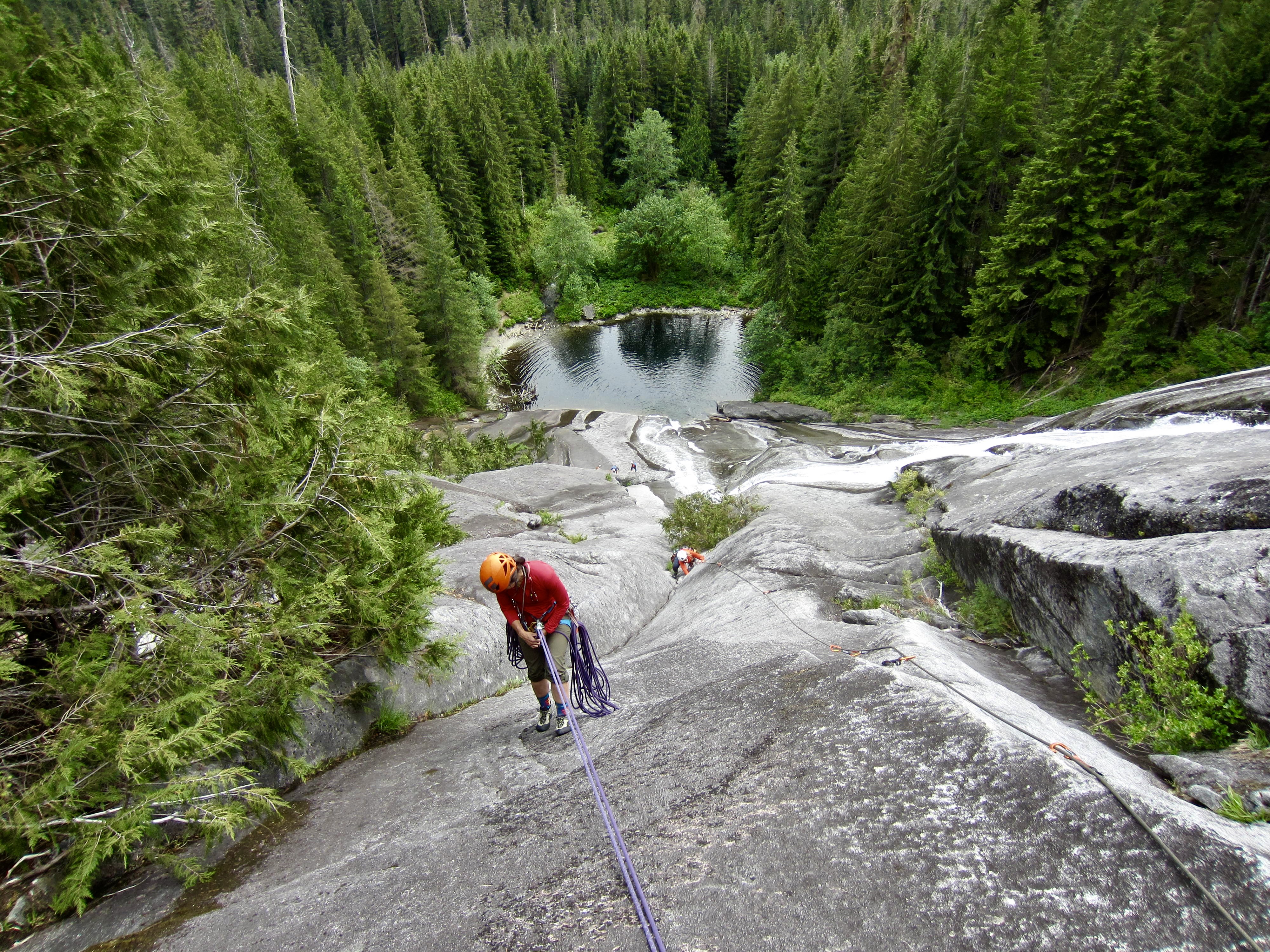 The spacing of these rappel anchors allows you to reach the lakeshore via six single-rope rappels using a 60-meter rope. Alternatively, you can perform three double-rope rappels and one single-rope rappel to reach the lakeshore. In either case, it is feasible to skip the final rappel and simply walk down the lowest portion of slab, as Kellie and I did.