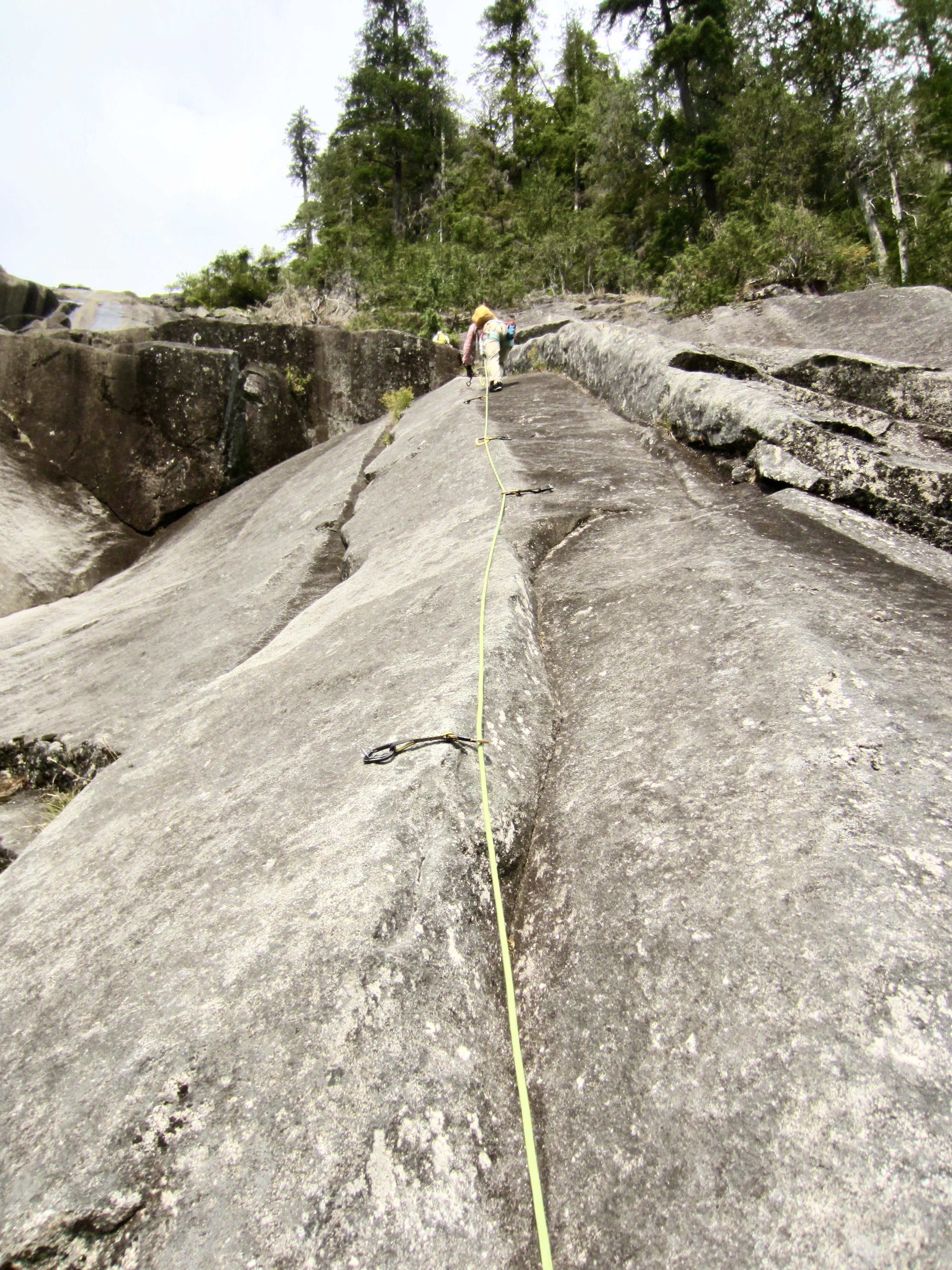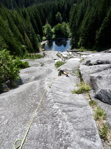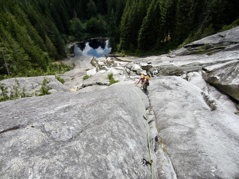 The official starting point for Pitch 1 of Poppy’s Peril is a belay station located at the bottom of an obvious crease about 75 feet up the slab, so it is necessary to make a diagonally leftward traverse up to the anchors. I regard this traverse to be “Pitch 0” of the climb. It really isn’t as difficult as it first appears, but there might be one or more water streaks that must be crossed along the way, especially in early season. Thankfully, it was recently retrofitted with two bolts on the traverse. Whether you clip the bolts or not, be careful. The day Kellie and I were here, a climber slipped on the traverse and took a 10-foot slide toward the lake!