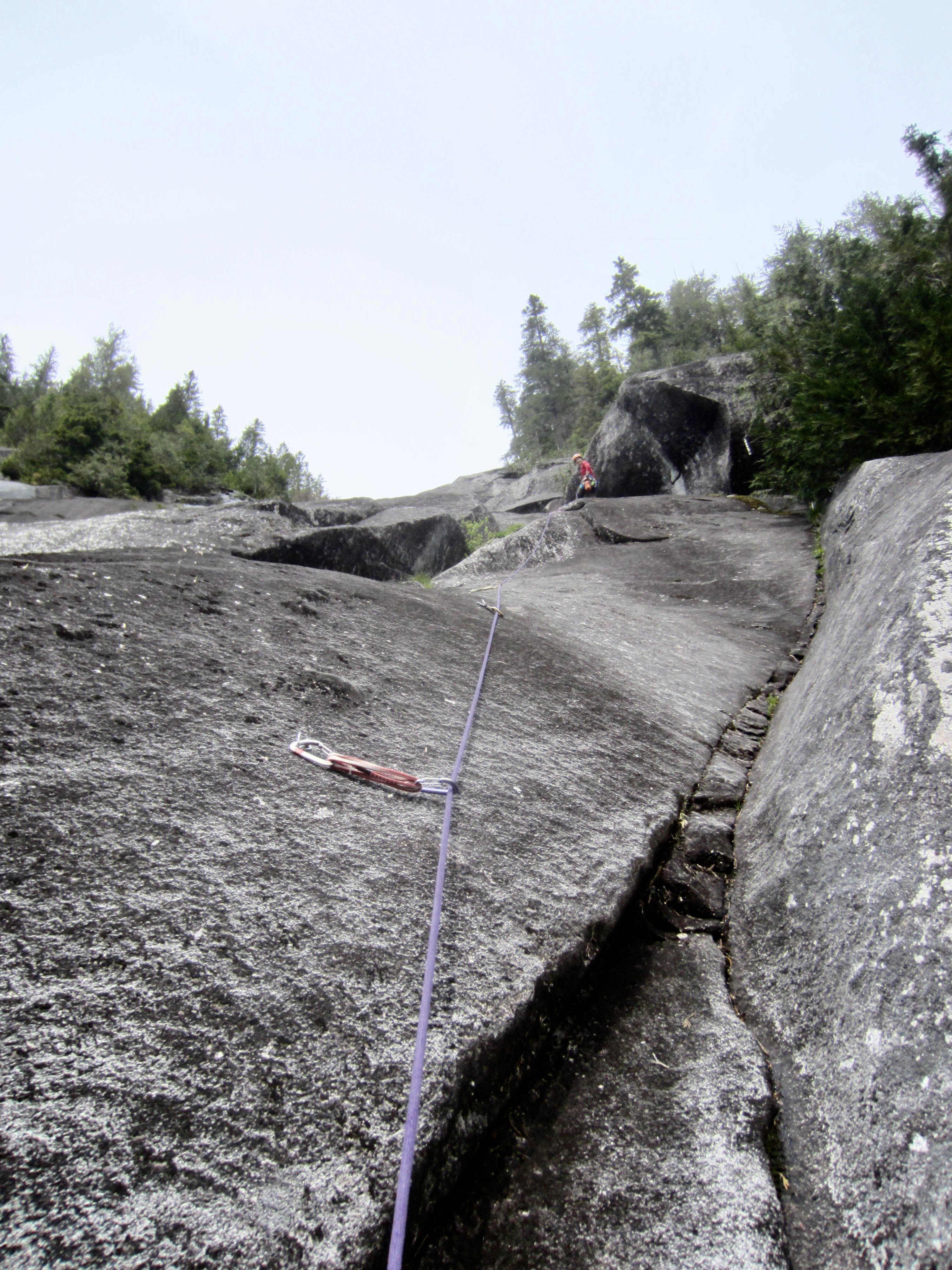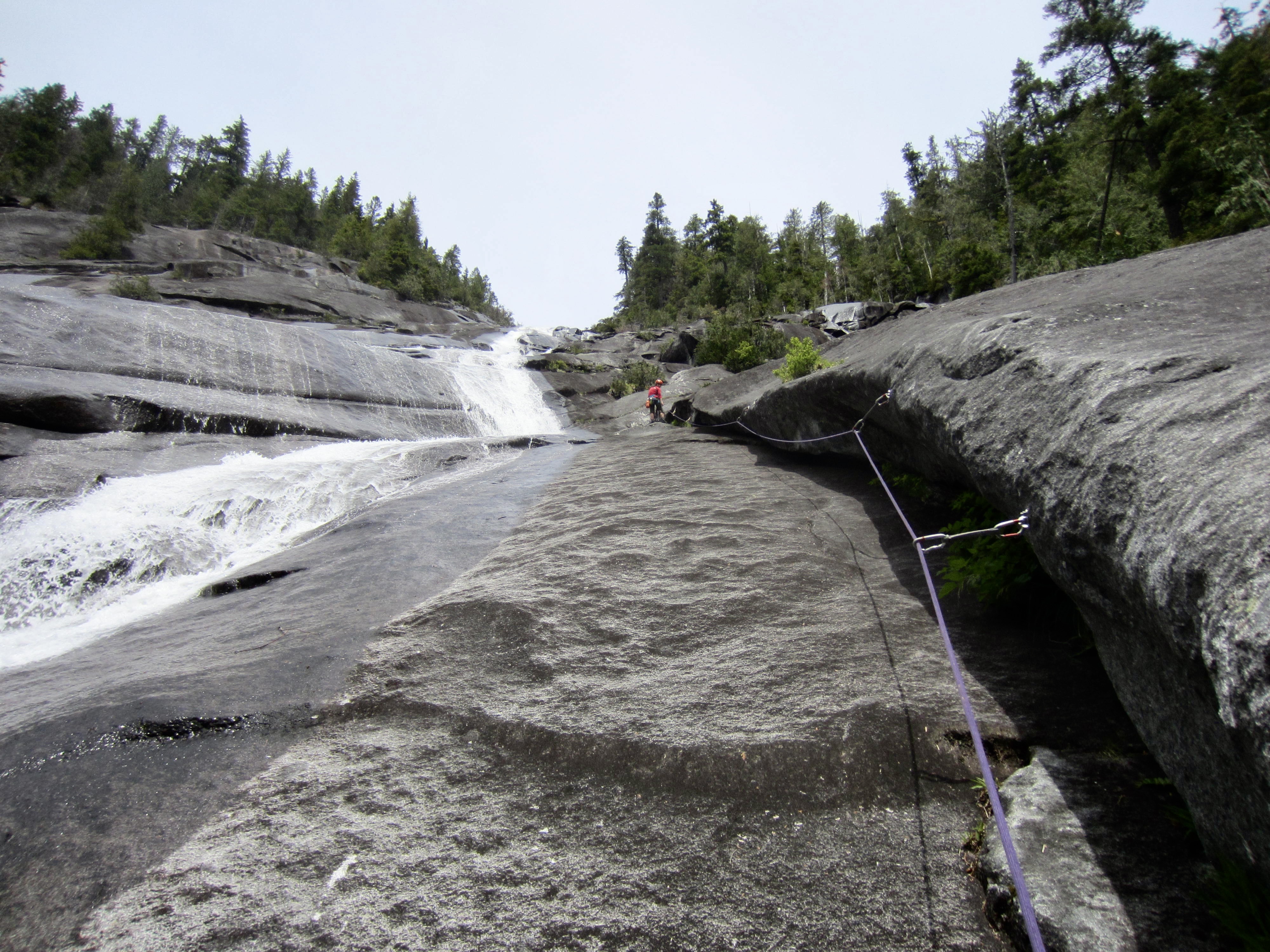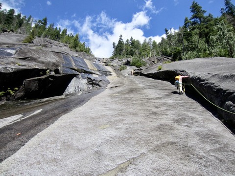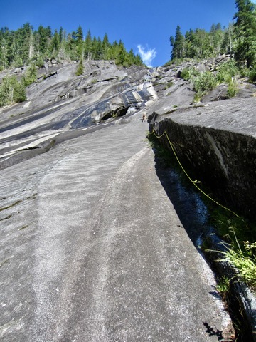 Pitches 1 and 2 follow a low-angle dihedral that runs parallel to the waterslide. There are numerous bolts in place on the right-hand lip of this dihedral. These two pitches are rated at Class 5.2 and 5.6, respectively, but both ratings felt overstated to me; I would estimate them to be closer to 5.0 and 5.4.