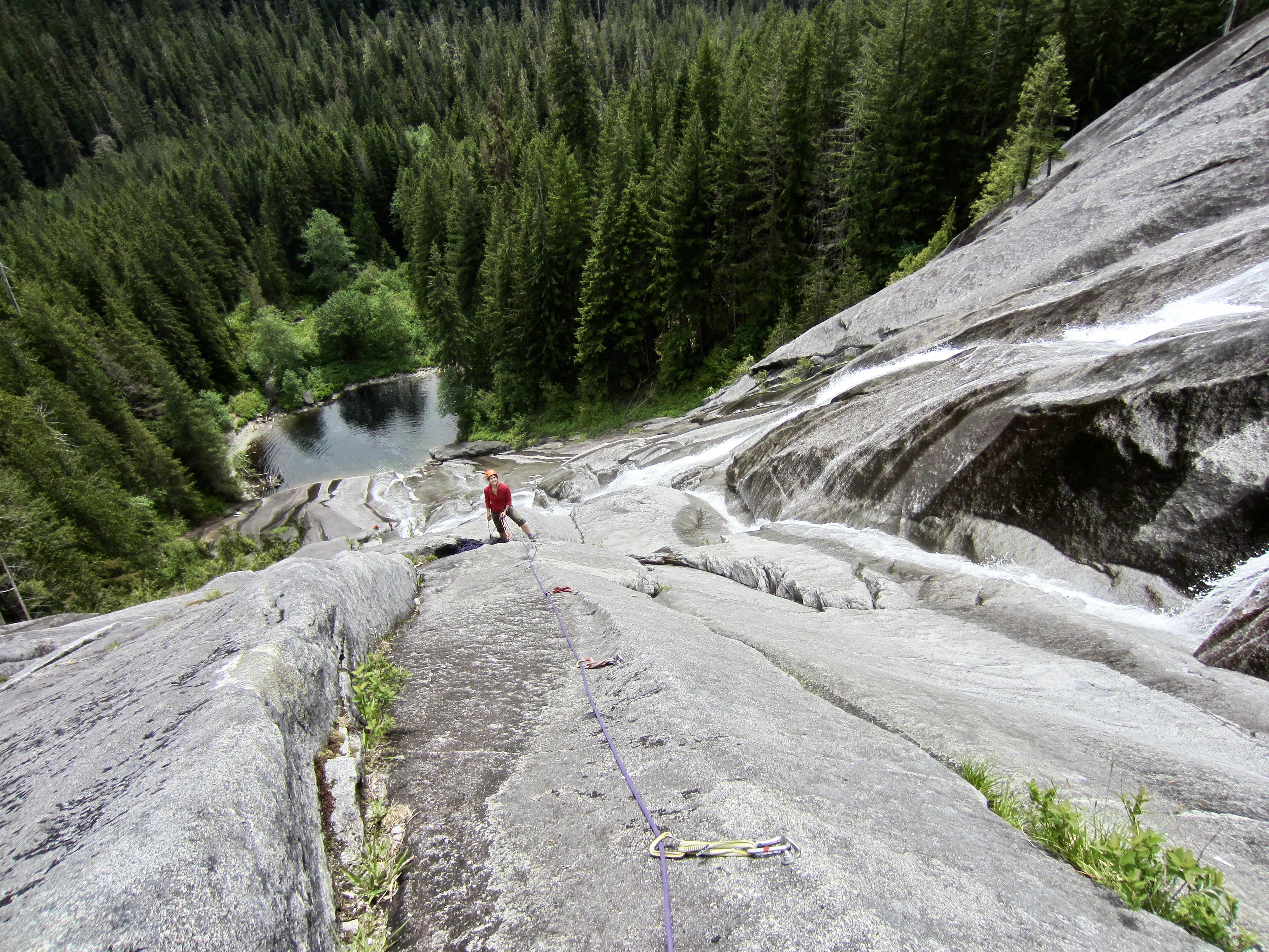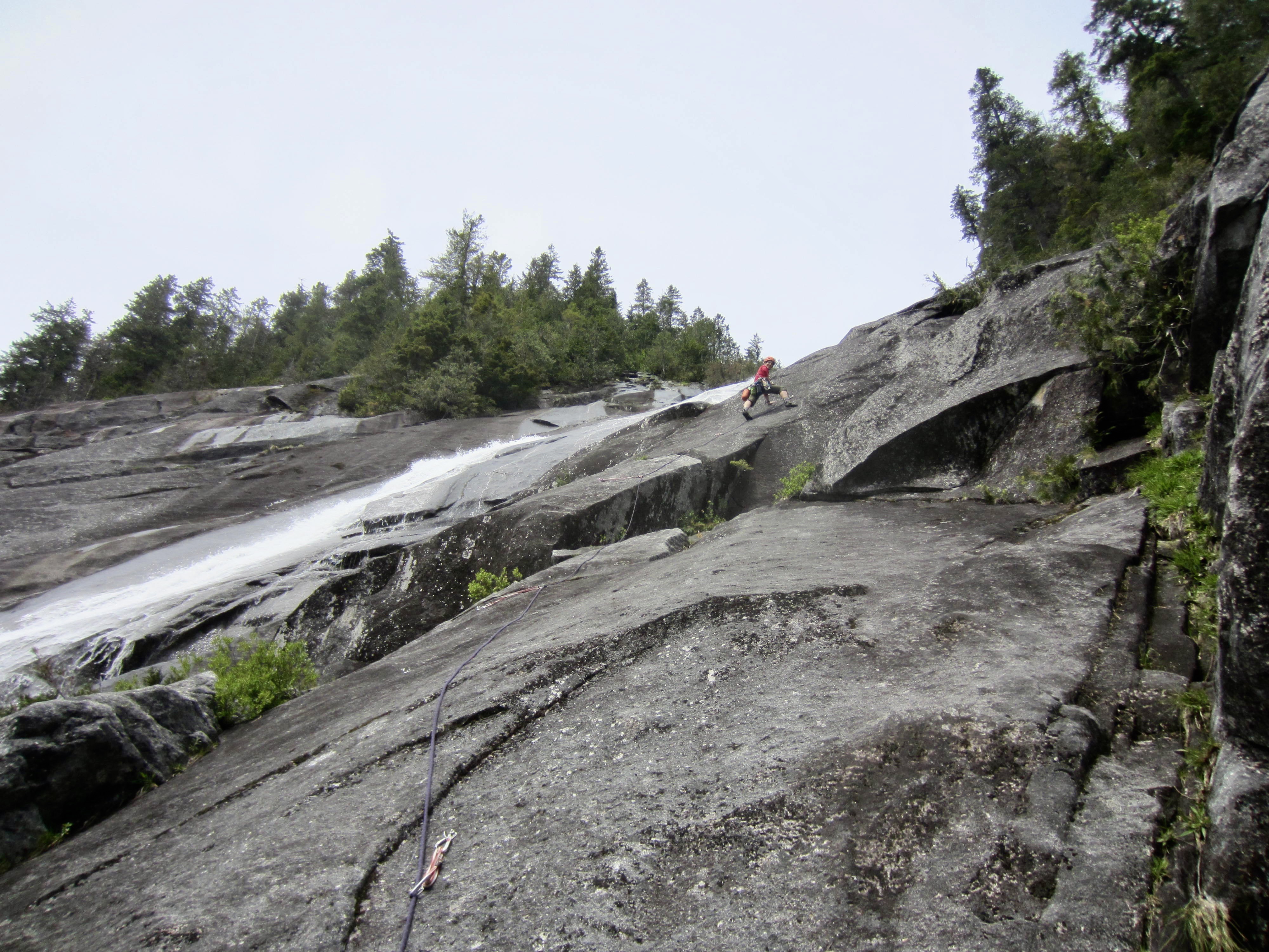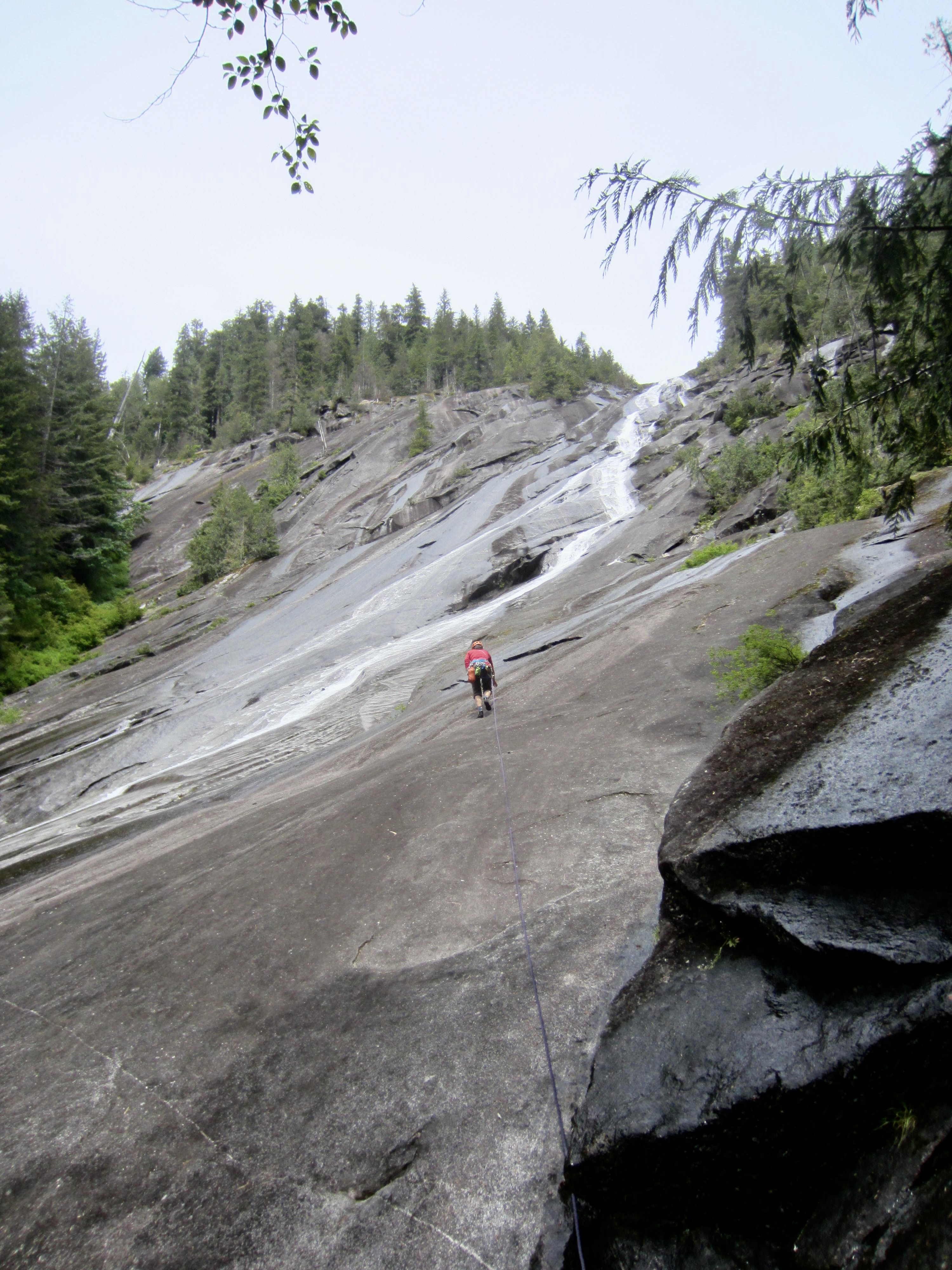 Pitches 1 and 2 follow a low-angle dihedral that runs parallel to the waterslide. There are numerous bolts in place on the right-hand lip of this dihedral. These two pitches are rated at Class 5.2 and 5.6, respectively, but both ratings felt overstated to me; I would estimate them to be closer to 5.0 and 5.4.