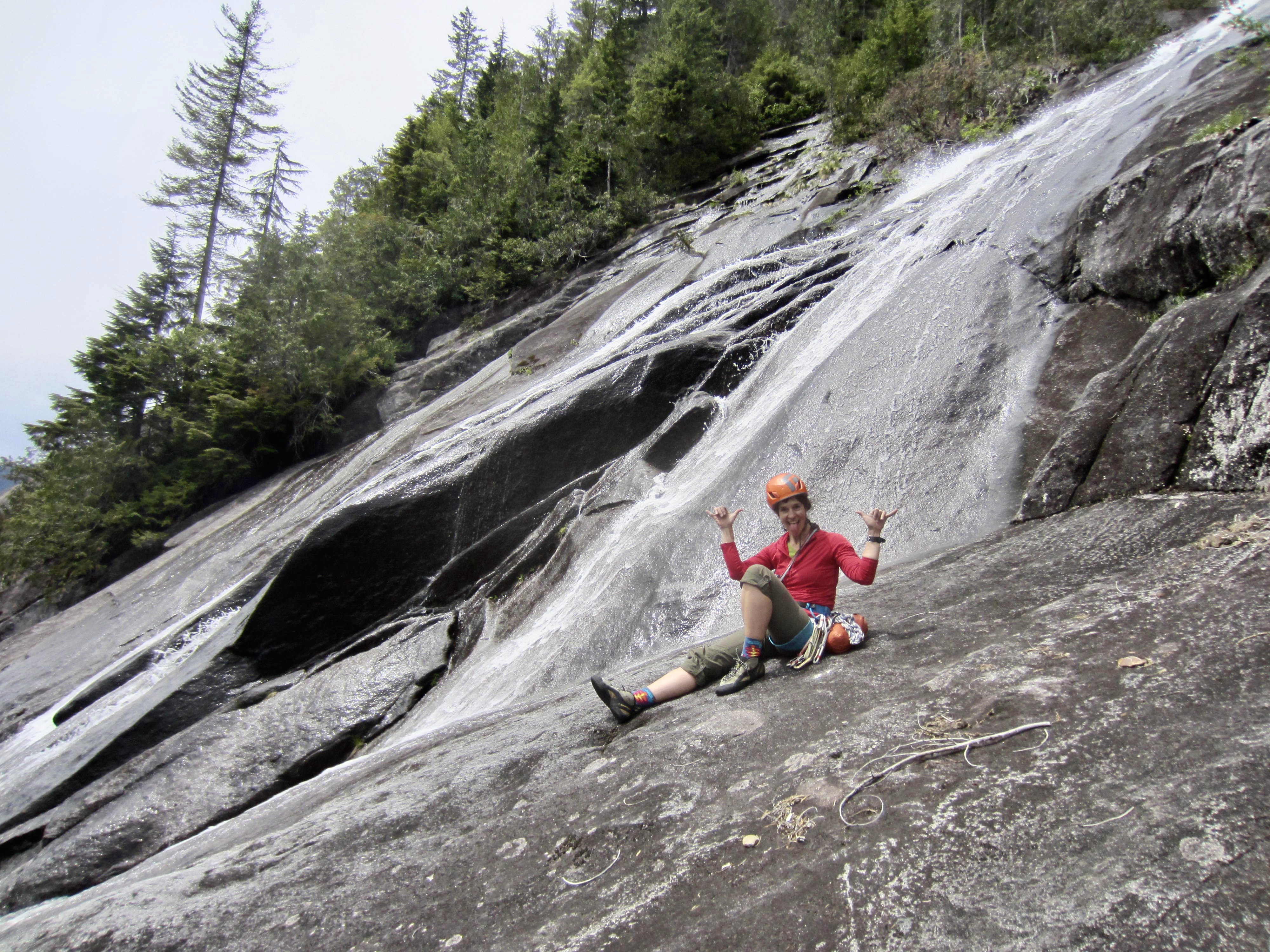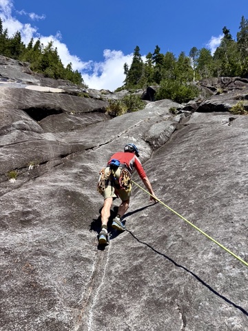 The dramatic setting and solid rock of Otter Falls Slab has attracted a handful of trad climbers over past decades. Then, in 2023, a multi-pitch sport-climbing route called Poppy’s Peril was established closely right of the waterslide. This new route comprises five pitches of delightful friction climbing, with a reported difficulty ranging from Class 5.2 to 5.8. Every pitch is well-protected with modern stainless-steel hardware, and every pitch ends at a two-bolt anchor station. Given its spectacular location, moderate rating, and generous bolting, Poppy’s Peril offers an exceptionally fun and unique backcountry sport-climb suitable for a broad range of abilities.