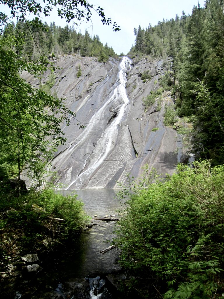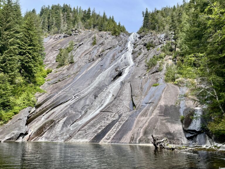Otter Falls is a popular hiking destination located in the Taylor River Valley northeast of North Bend. These falls consist of a long, braided waterslide that flows over a large granite slab with a total vertical drop of about 600 feet. At the bottom of this granite slab is a cute little pond called Lipsy Lake, which can be reached by a 4-mile hike on the Snoqualmie Lake Trail.