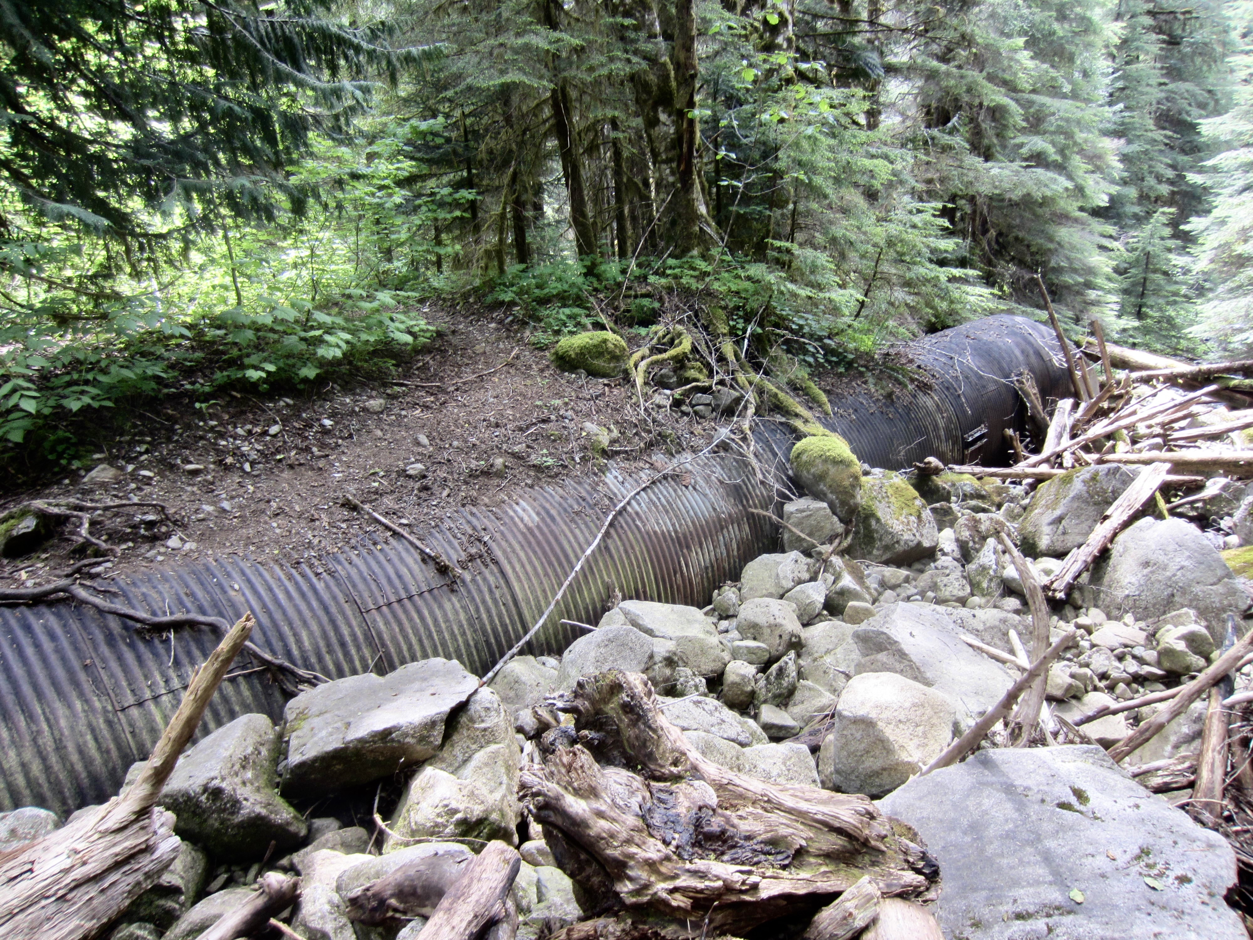 From the parking lot, walk around the vehicle gate and immediately cross the Taylor River on a large concrete vehicular bridge. Once across the bridge, head up the river valley on the Snoqualmie Lake Trail, which follows an abandoned road that ascends at a very gentle gradient. Distances from the trailhead to key waypoints along the approach trail are noted below.