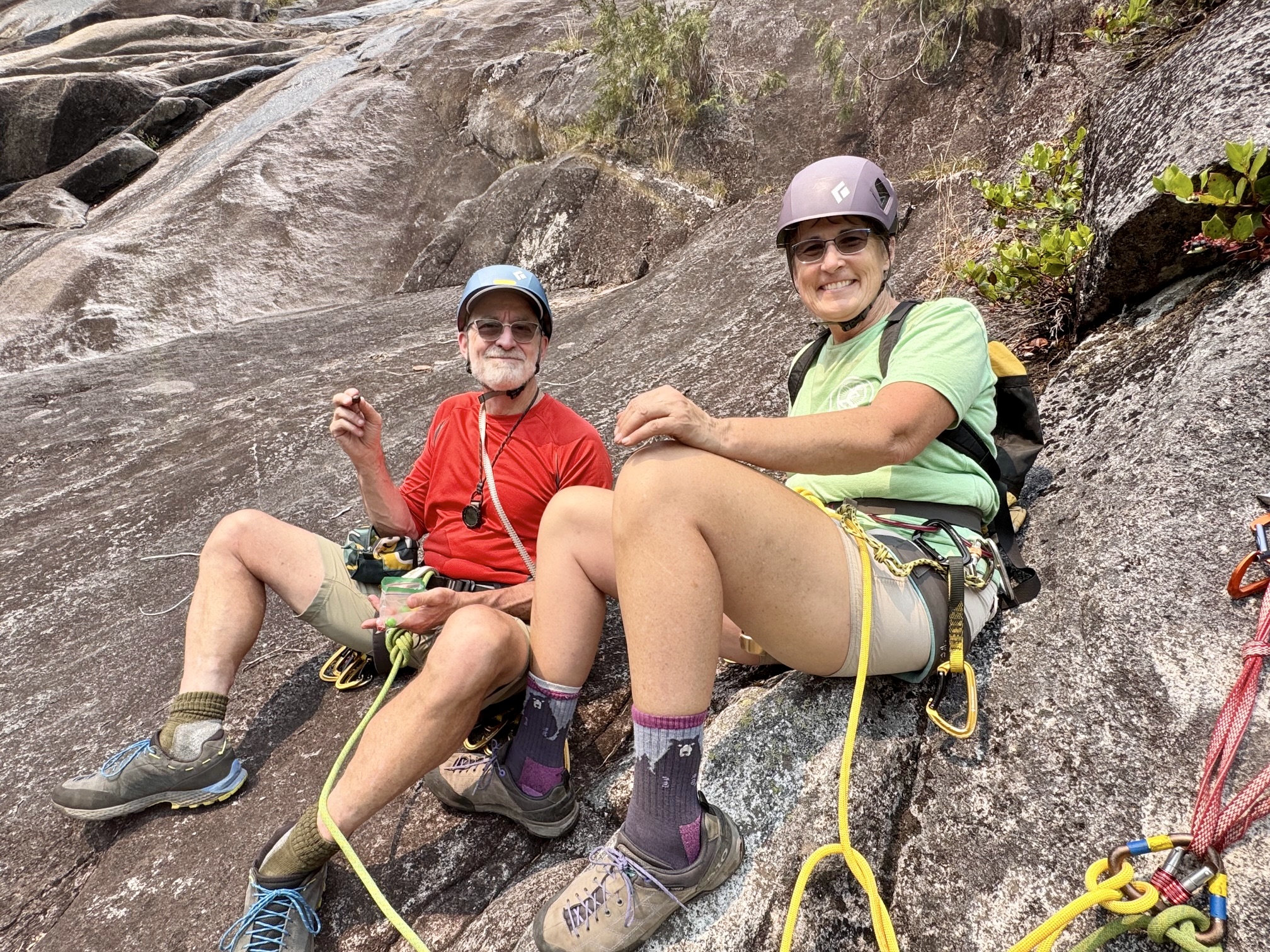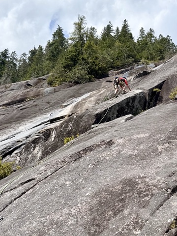 Kellie wore conventional rock shoes on our 2024 climb, whereas Eileen, Yoko, and I wore technical approach shoes (mine were La Sportiva TX Guide shoes, reviewed here). In the end, we were all happy with our footwear choices. The fine-grained granite provided adequate friction for our shoes, even where the slab was wet.