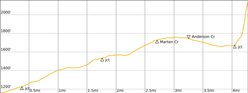 - 3.25 miles: Cross Anderson Creek by rock-hopping. This creek can be identified by a 2-foot-diameter culvert that has washed out of the streambed.