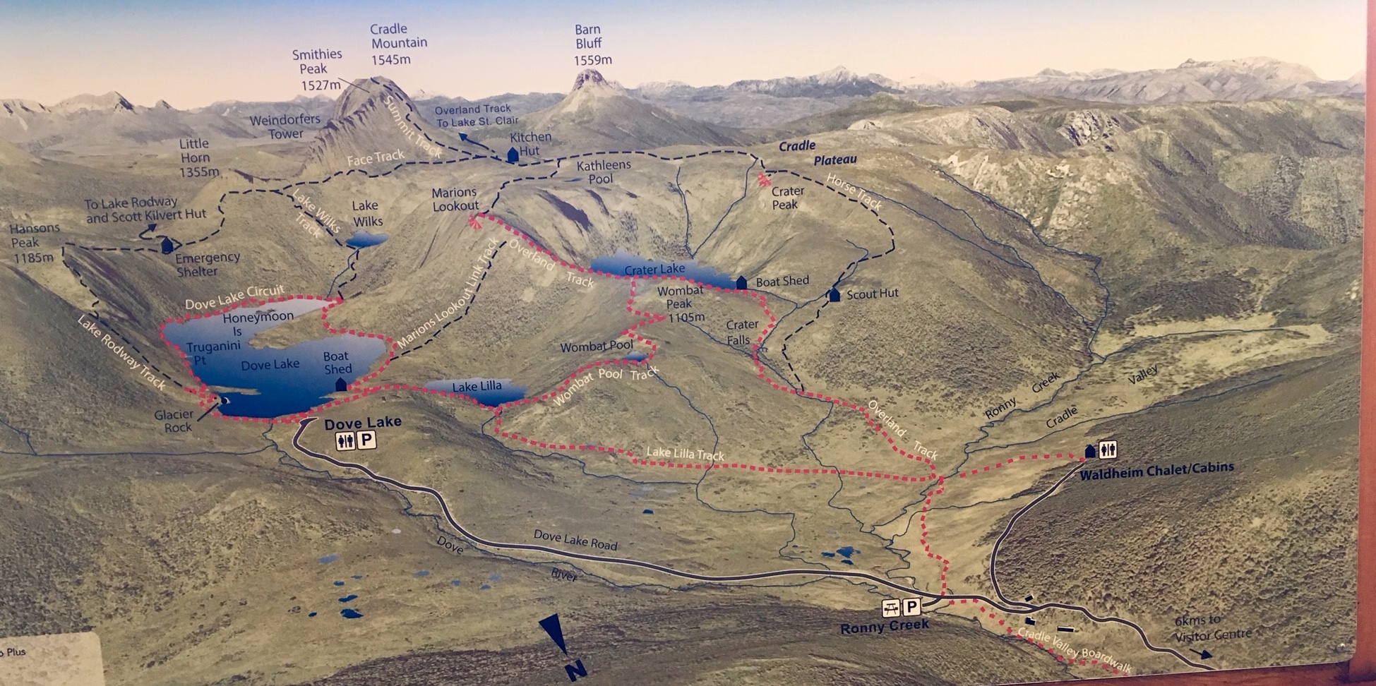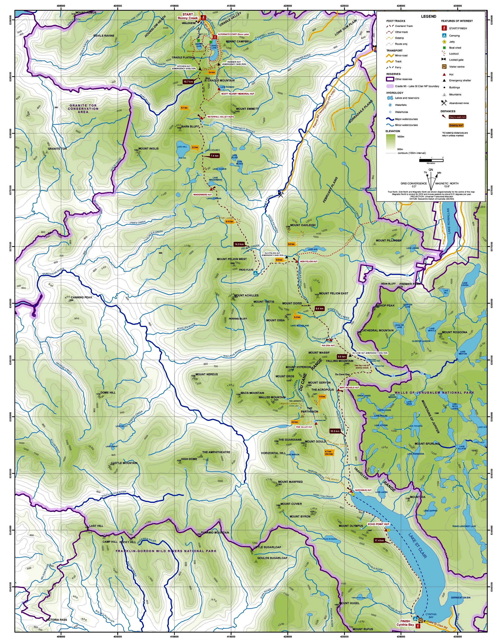 Way Points: Cradle Valley & Ronnie Creek Bridge & Crater Falls & Crater Lake & Marions Lookout & Cradle Plateau & Kitchen Hut & Little Plateau Tarns & Benson Peak Emergency Shelter & Waterfall Valley Hut & Waterfall Valley & Lake Holmes & Lake Will Plateau & Lake Windermere & Windermere Hut & Lake Curran & Forth Valley Lookout & Pine Forest Moor & Pelion Creek & Frog Flats & Forth River Bridge & Pelion Plains & Pelion Hut & Douglas Creek & Pelion Gap & Pinestone Creek Bridge & Kia Ora Hut & Kia Ora Creek & DuCane Hut & DuCane Gap & Bert Nichols Hut & Stony Creek & Bowling Green & Narcissus River Suspension Bridge & Narcissus Hut & Narcissus Bay Jetty (trail hike via Overland Track);  Lake St. Clair & Cynthia Bay Jetty (boat ride via Lake St. Clair Ferry)