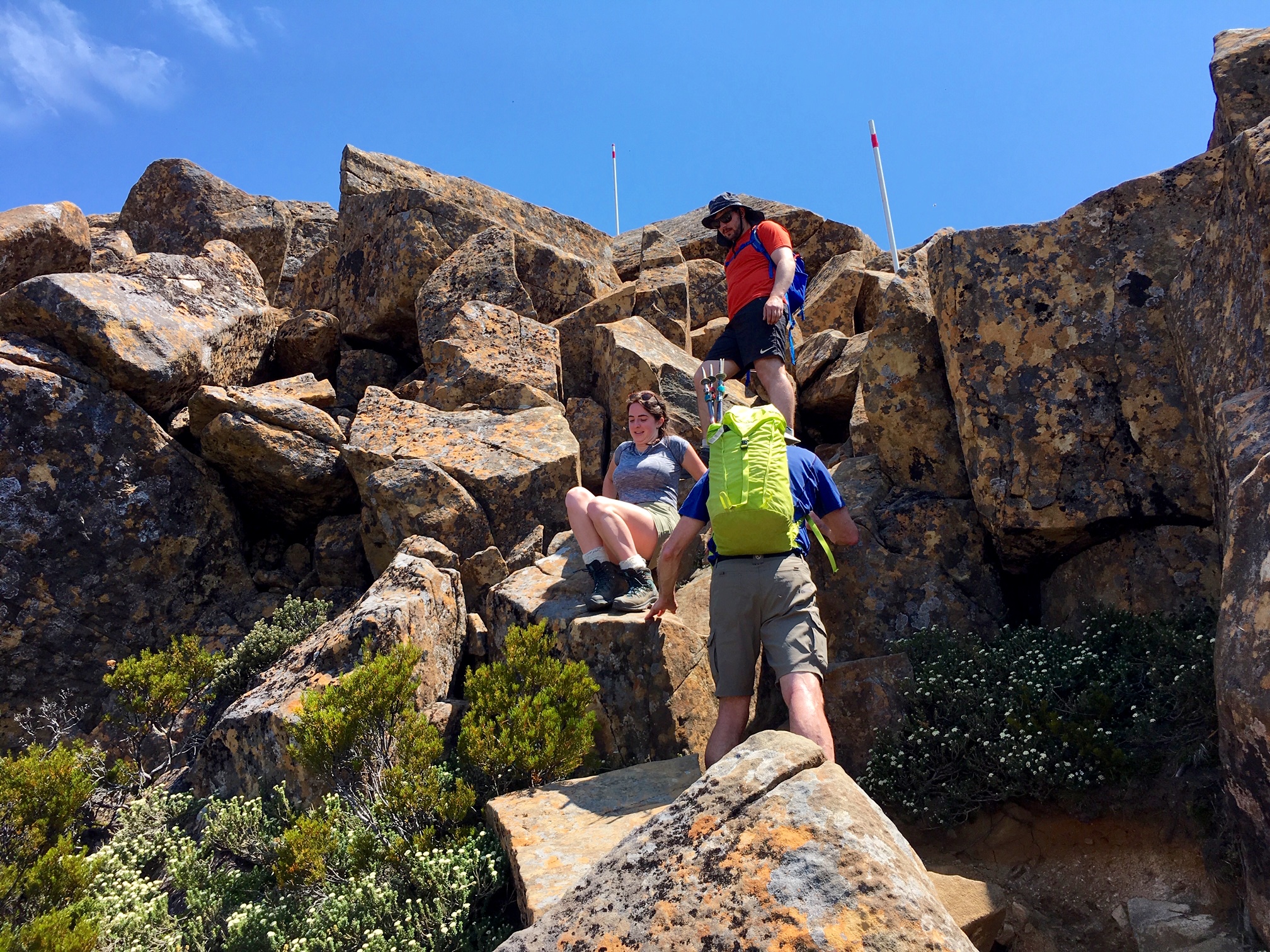 While travelling from north to south, the first peak you come to is also the most famous peak in Tasmania:  Cradle Mountain (5069 feet / 1545 meters).  The ascent is a fun and athletic Class 2-3 rock scramble on huge boulders.  Due to its fame and proximity to the trailhead, expect to be joined by 50 to 100 other eager ascensionists on any summer day.