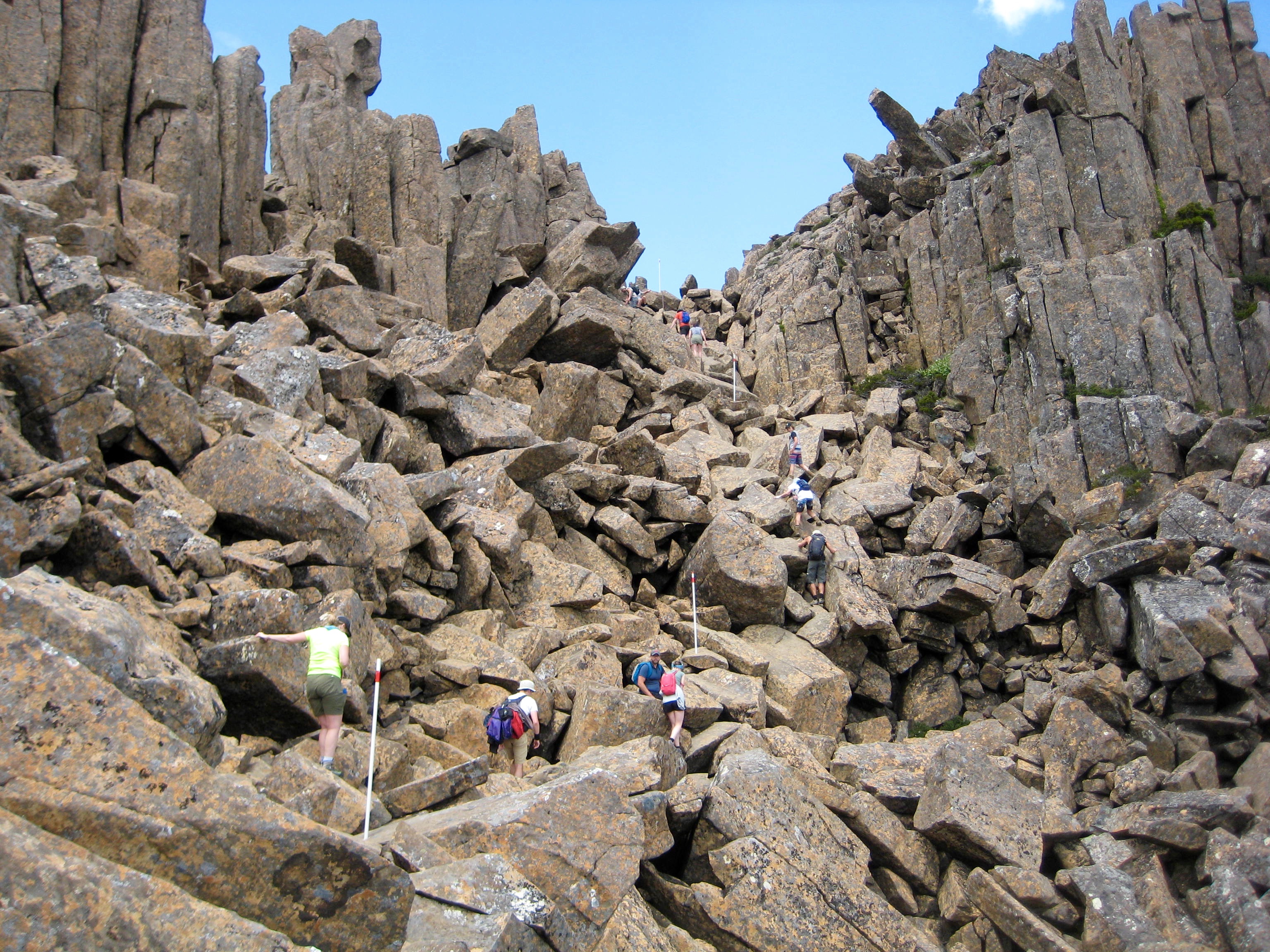 The highest—and by far the most interesting—rock consists of dolerite, which constitutes all of the alpine peaks and ridges in this region.  You might logically assume that dolerite was named after some old geologist named Dole, but in fact the name comes from the Greek word for “difficult to interpret or describe.”  I was actually relieved to discover this meaning after having had so much trouble identifying the type of rock I was seeing.