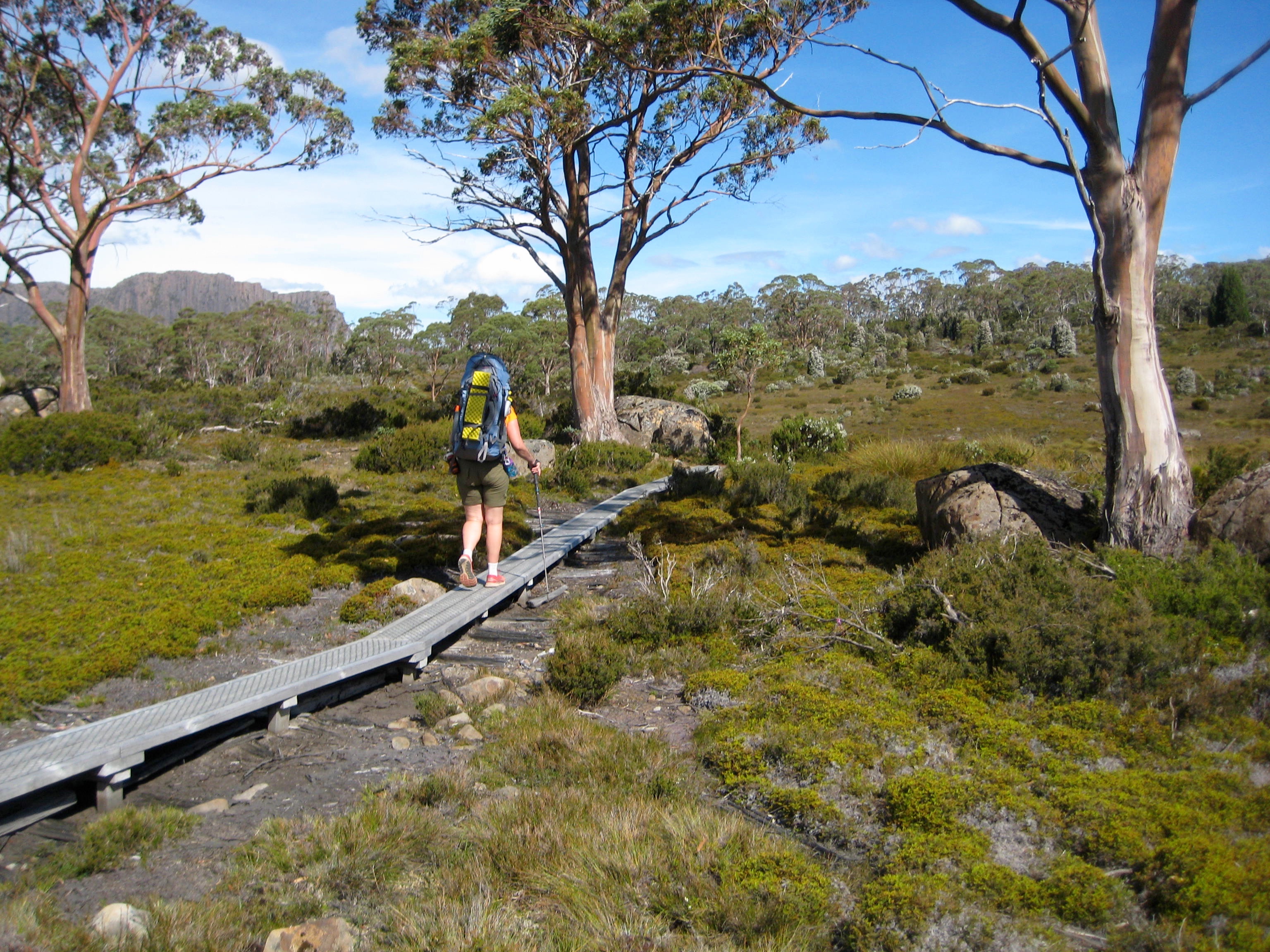 The Overland Track is a long, continuous trail located within Cradle Mountain – Lake St. Clair National Park in northwestern Tasmania.  It is not only the most famous trail on this island but also one of the most famous trails in all of Australia.  Like many long trails, the Overland Track formed incrementally, over a period of many decades, and as its popularity grew, usage exceeded capacity.  There was a time when several hundred hikers would start out on this trail every day of the summer, travelling either southbound or northbound.