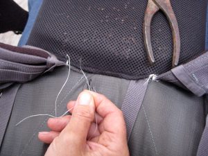 While doing a preliminary backpack weigh-in at the campground, I experienced a heart-stopping moment when the seam holding my pack’s shoulder straps partially tore out. I was horrified at the thought of having a total seam failure in the middle of the Picket Range! However, I was able to borrow a needle from a nearby campsite, and Eileen used dental floss to implement some emergency repairs. Thanks to her stitchery—and nine days of delicate handling on my part—I was able to get my pack through the trip.