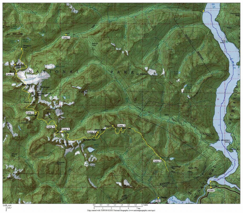 Campsites: Little Beaver Creek Trail at MP-12 & Perfect Pass & Pickell Pass & Picket Pass & McMillan Tarn & Rhino Butte summit & Torrent Bench & Stetattle Arm