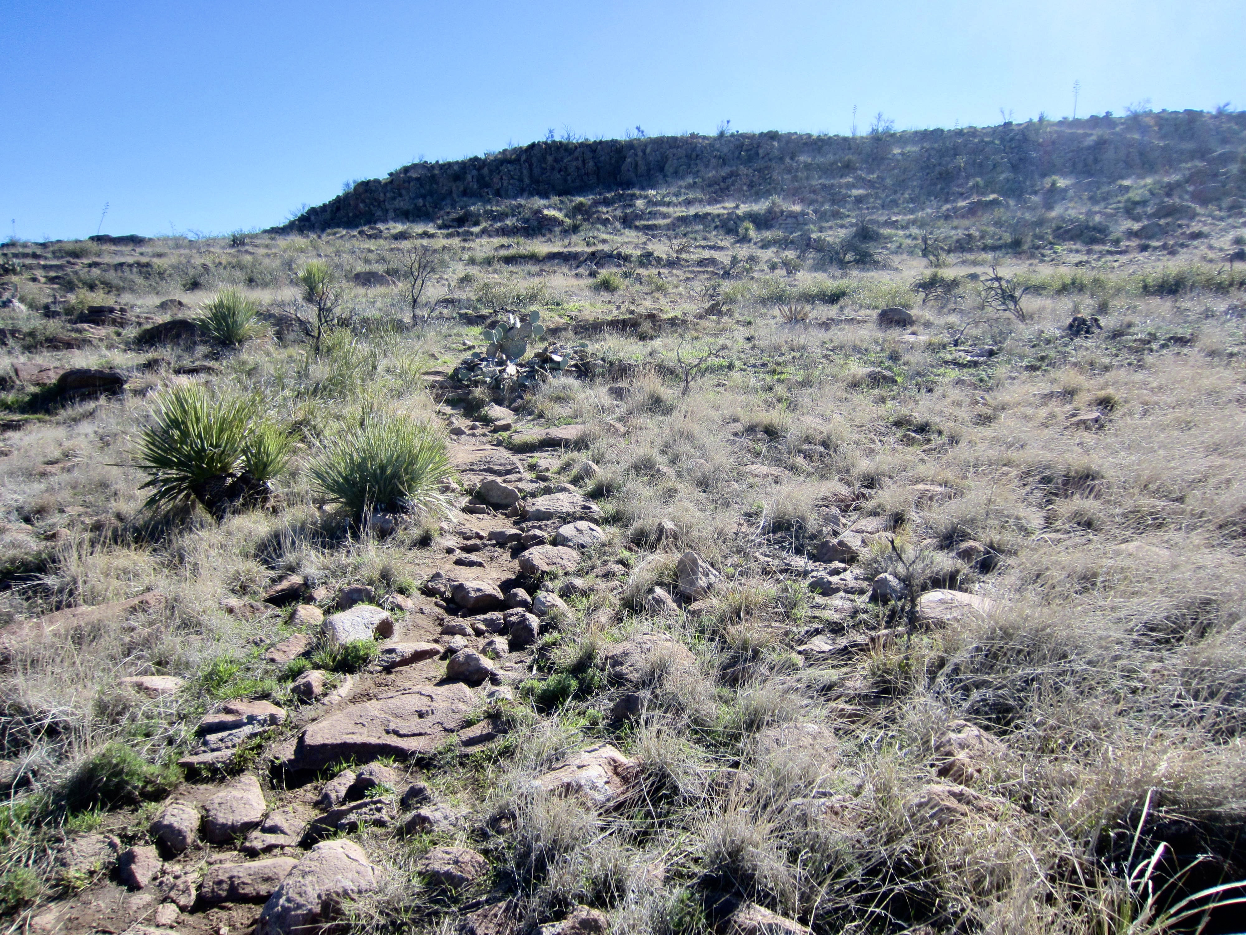 After gaining 500 feet, the steep trail angles rightward and goes through an obvious gap at the head of the gully. This gap opens onto a sloping mesa with a rubble-strewn but well-traveled trail. The final 200 feet of ascent is an easy stroll up the mesa toward the broad summit mound.
