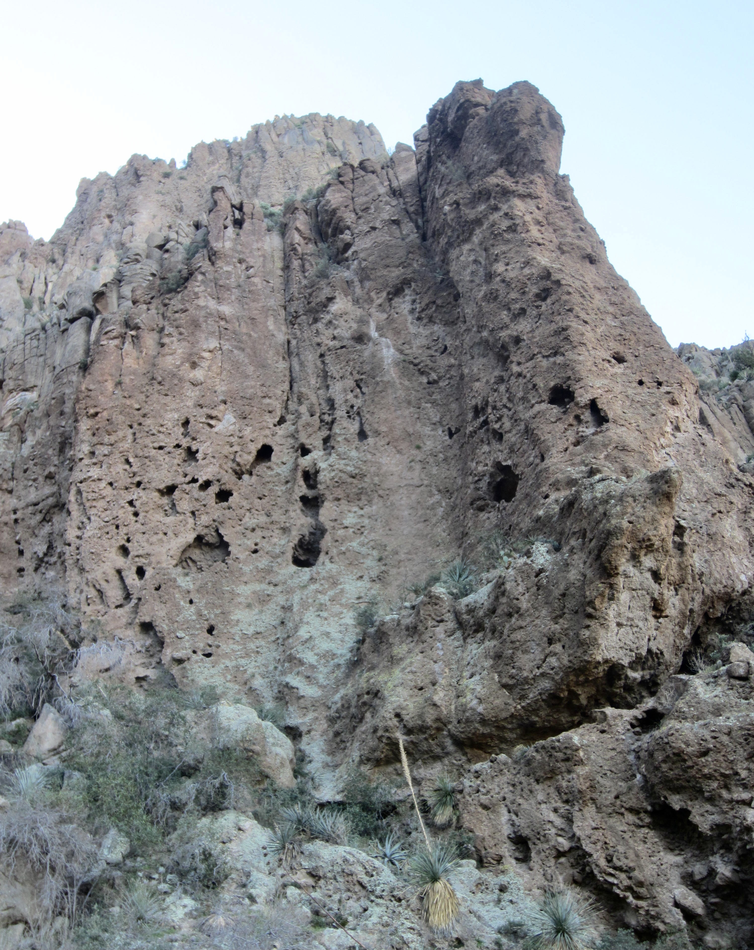 The rightward traverse led me into a major gully that slices vertically through the entire mountain. Directly ahead was a reddish cliff consisting of volcanic tuff riddled with erosion cavities.  This distinctive cliff serves as a good navigational landmark on both the ascent and descent.
