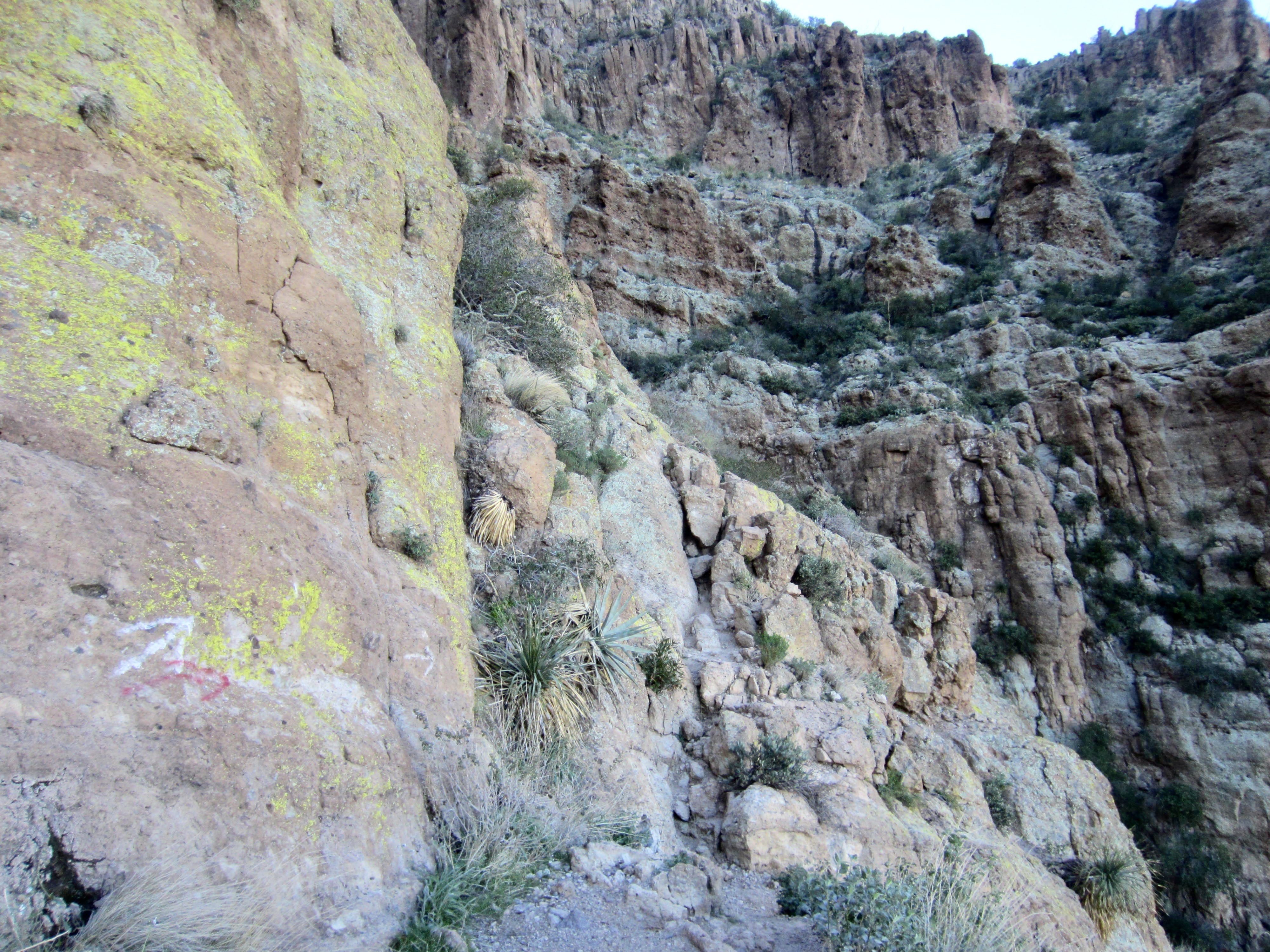 The Picketpost Mountain Trail gains 1000 feet before abruptly making a rightward traverse across a sloping ledge that runs horizontally between two cliff bands.  Navigation gets a bit more difficult through here due to multiple branching paths and small Class 2-3 rock steps. However, there are numerous white arrows, marker ducks, and small cairns to show the way.