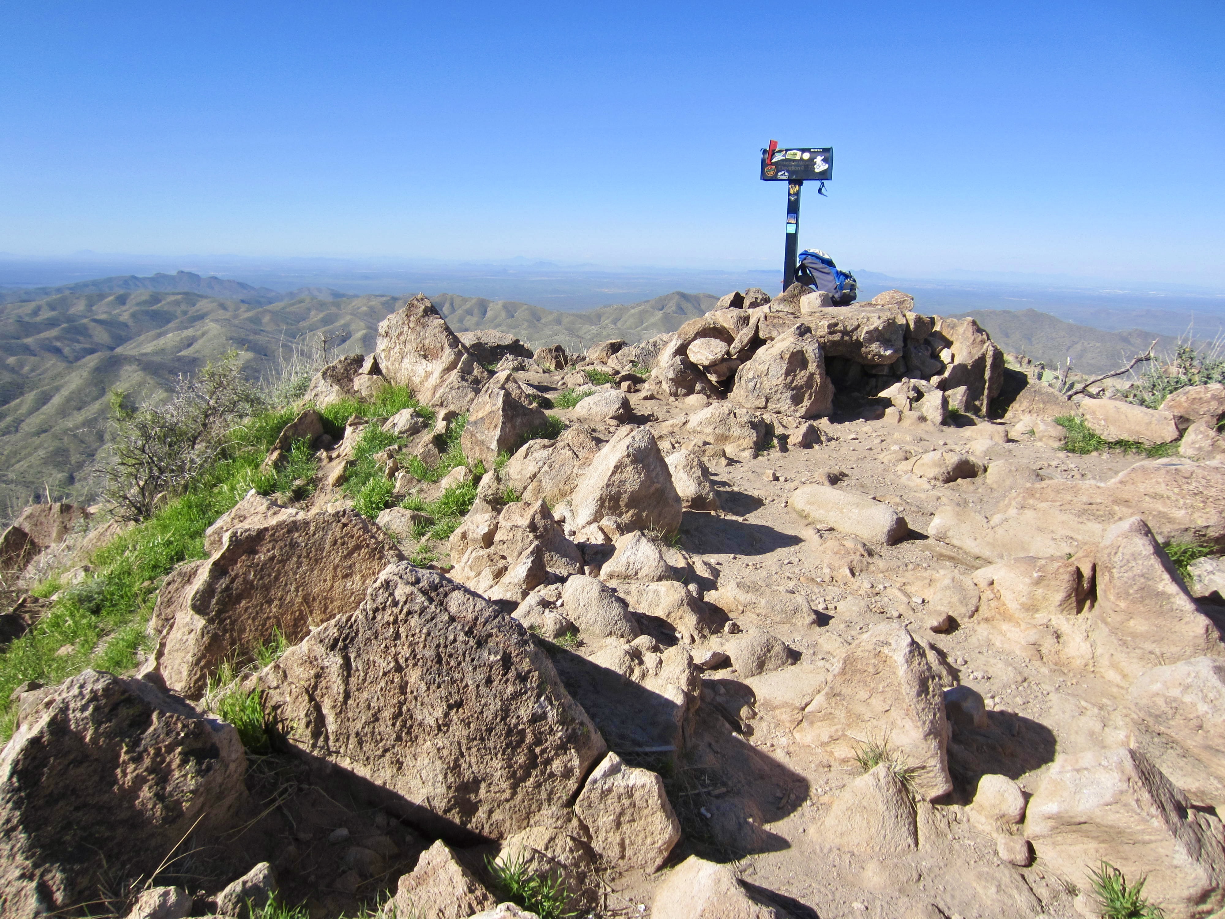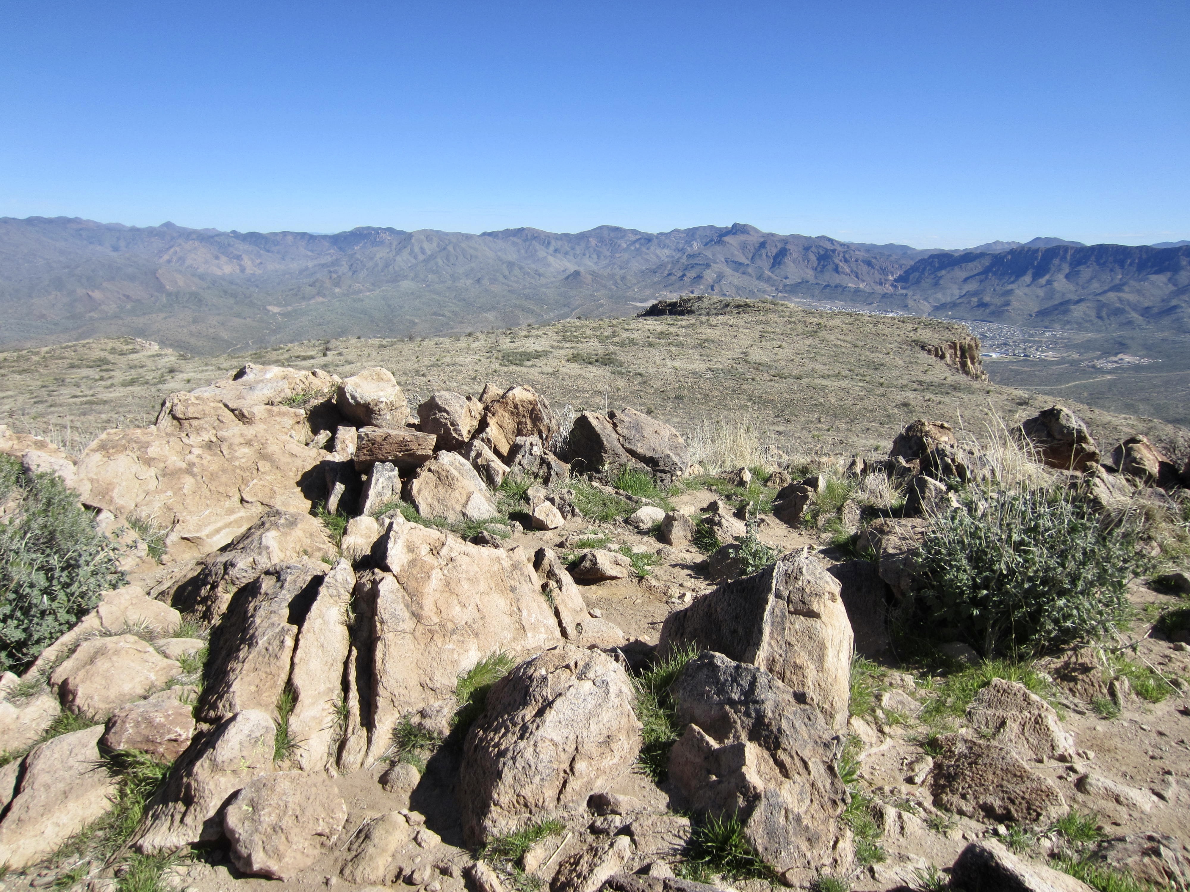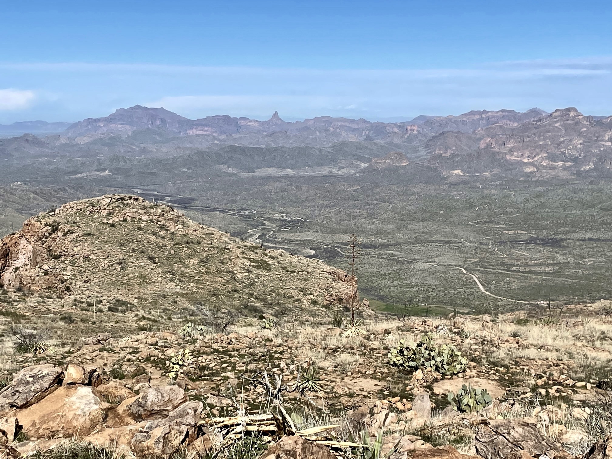 Because of this peak’s isolated position, nearby mountain views are fairly limited.  However, the Superstition Mountains were visible 17 miles to the northwest, and a variety of other sub-ranges could be seen farther away in all directions.