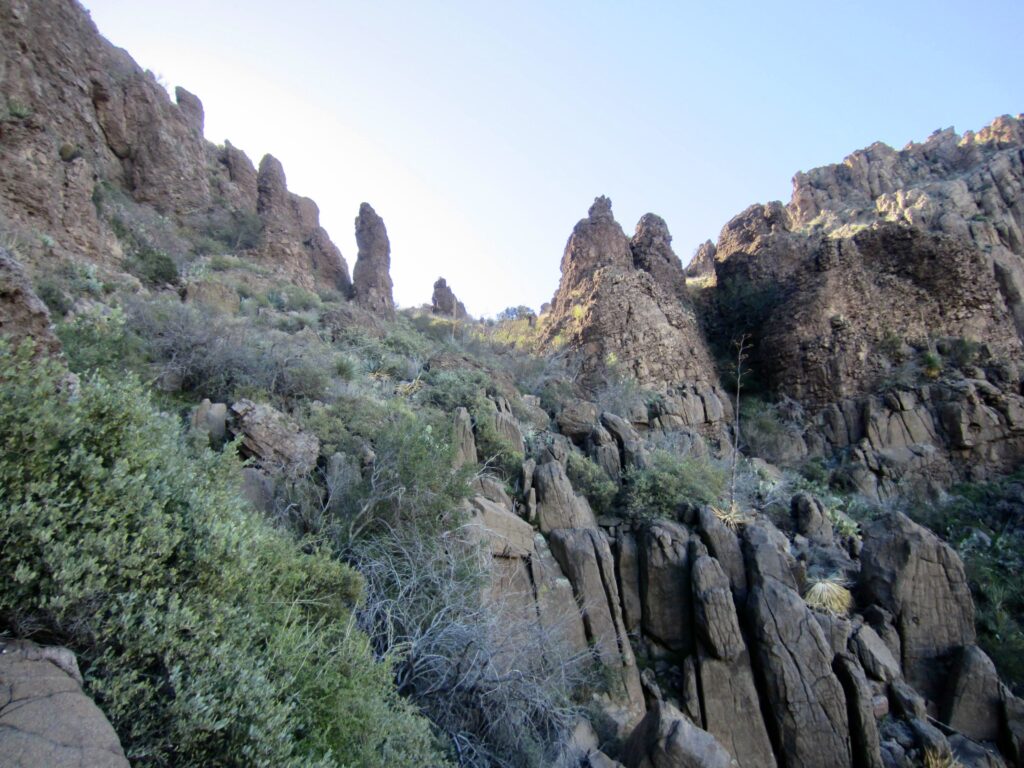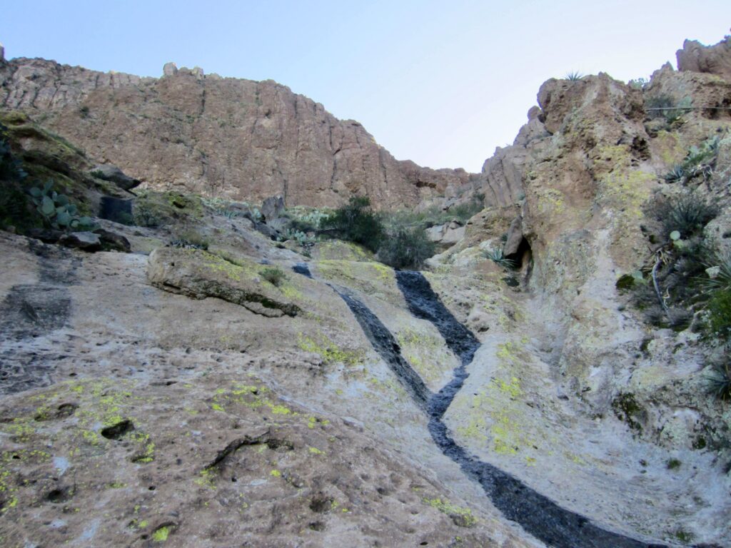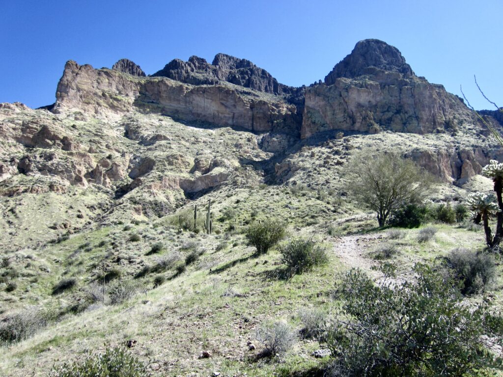 The southbound Arizona Trail immediately crosses Alamo Wash and comes to a junction with the Legends of Superior Trail (LOST). Staying to the right, I continued on the Arizona Trail for another ⅓ mile until reaching a junction marked only with a flexible post embedded in a small cairn. Here, I turned left and followed the well-defined Picketpost Mountain Trail uphill, heading directly toward the mountain’s ochre-colored cliffs of volcanic tuff.