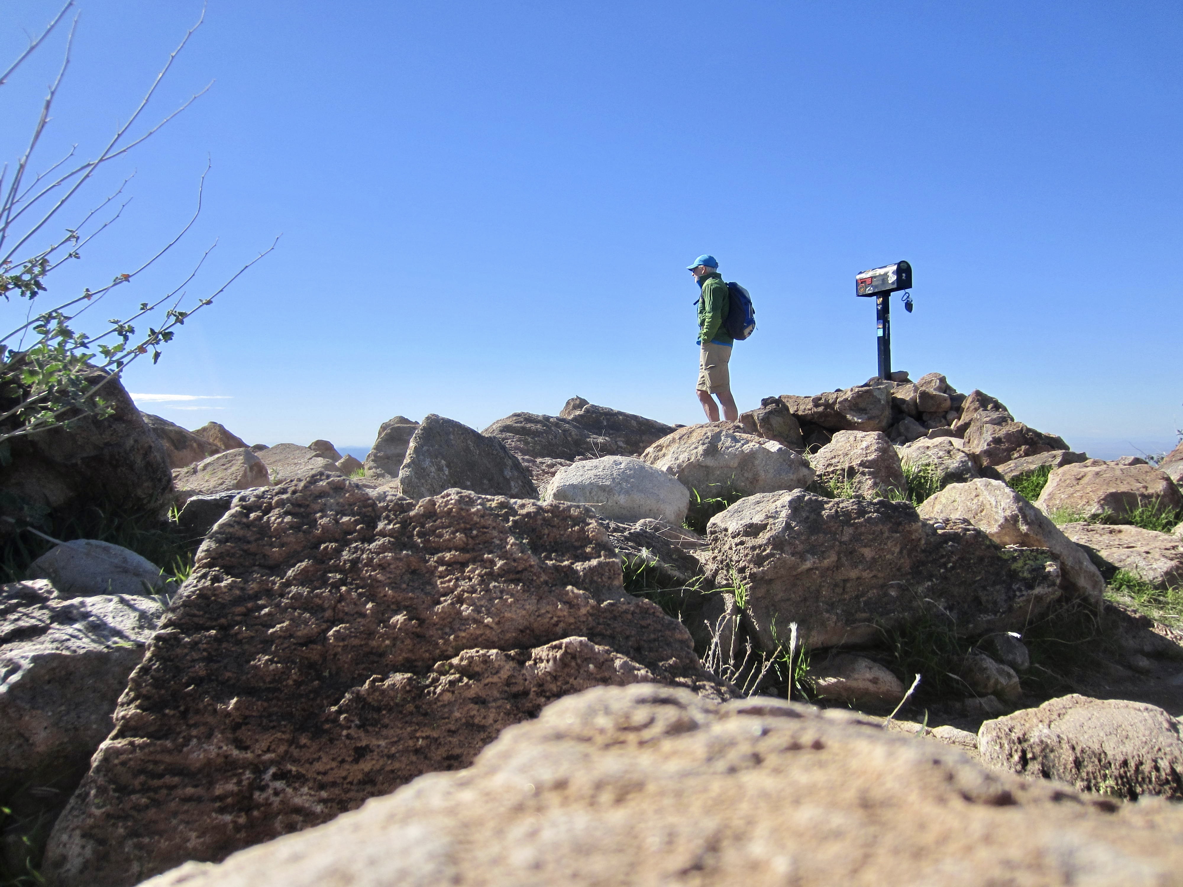 I stepped onto the bouldery summit in late morning (1.7 hours + 2000 feet from TH).  Picketpost Mountain is famously equipped with a summit mailbox containing registers and various trinkets—a tradition that dates back many decades.  The original mailbox eventually rusted out and was replaced by a local hiking group a few years ago.