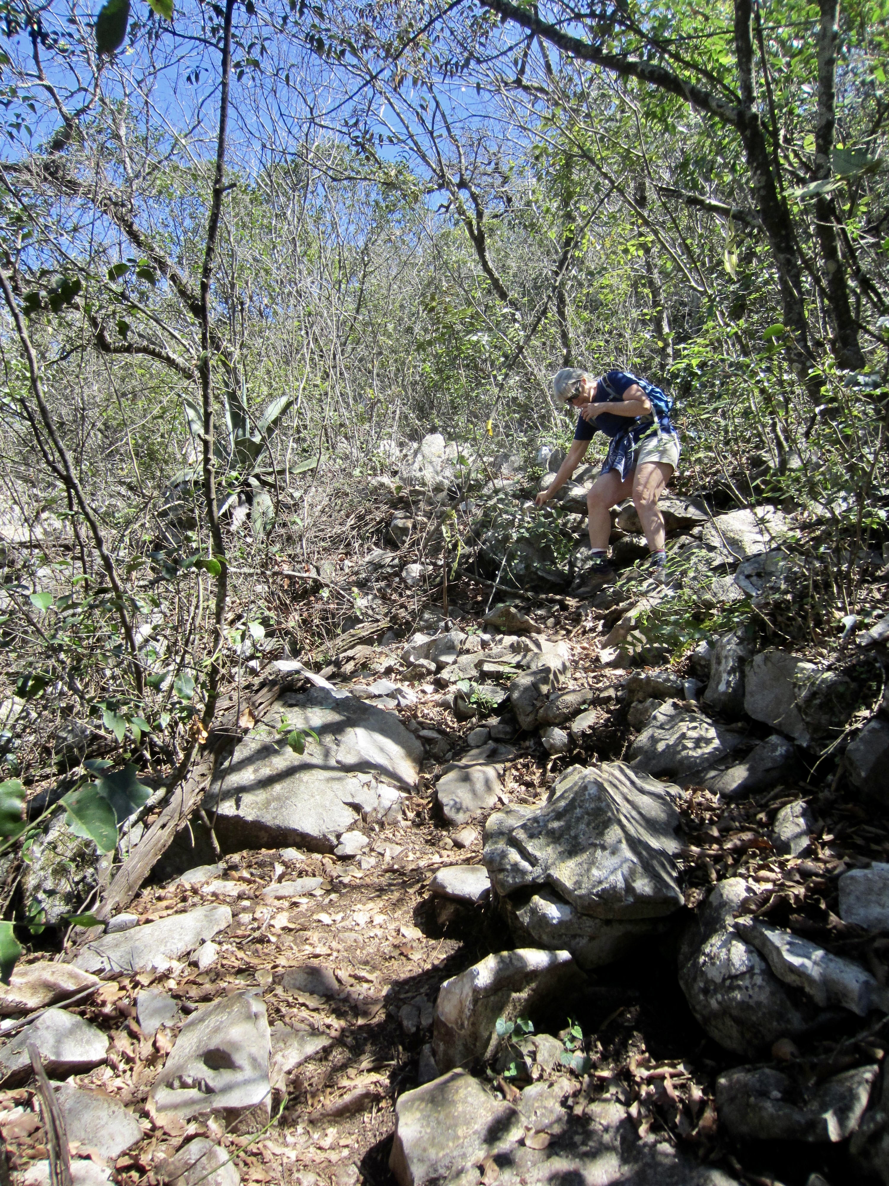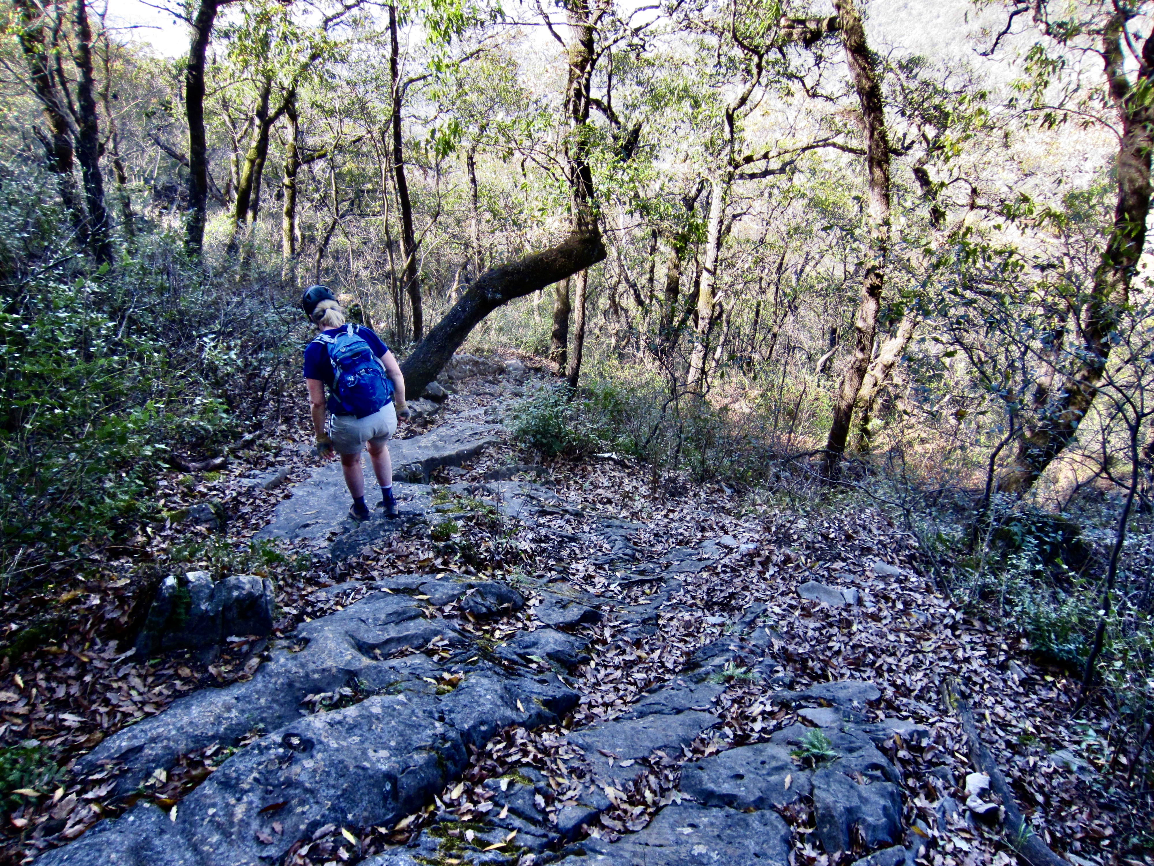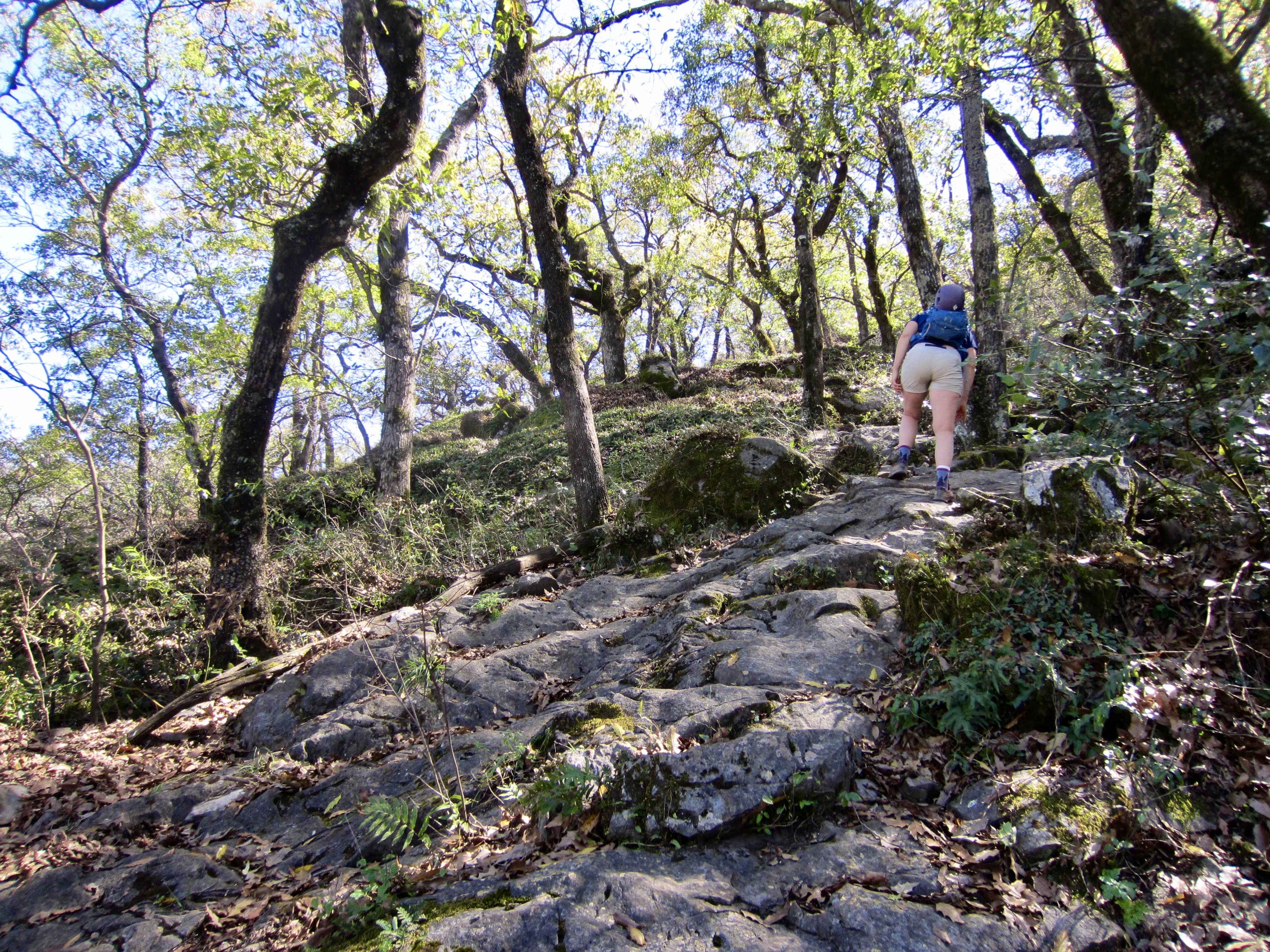 Our progress had been frustratingly slow during the traverse, but now we were gaining elevation rapidly as the steep path curved around oak trees and over limestone slabs. After an hour, however, Eileen waved me ahead due to concerns about our time required to finish the ascent and then make the entire descent.