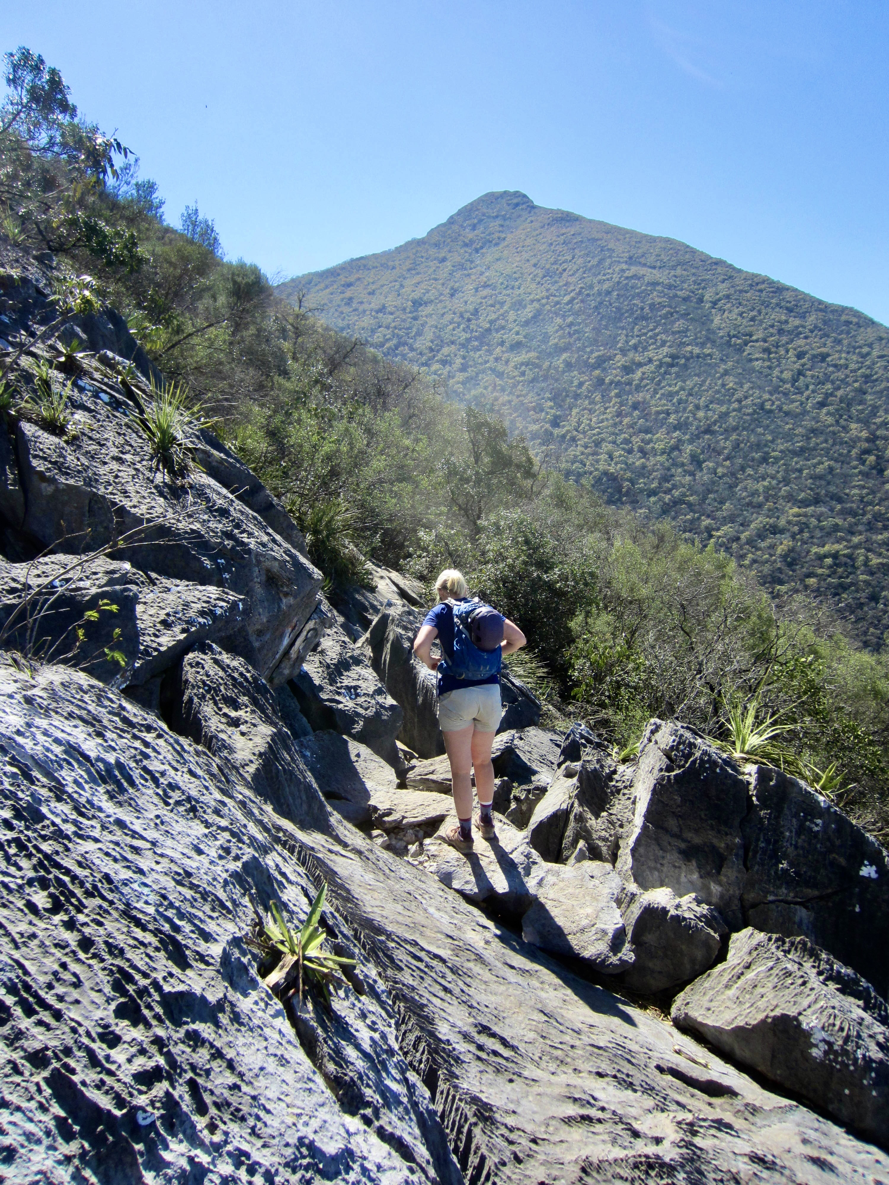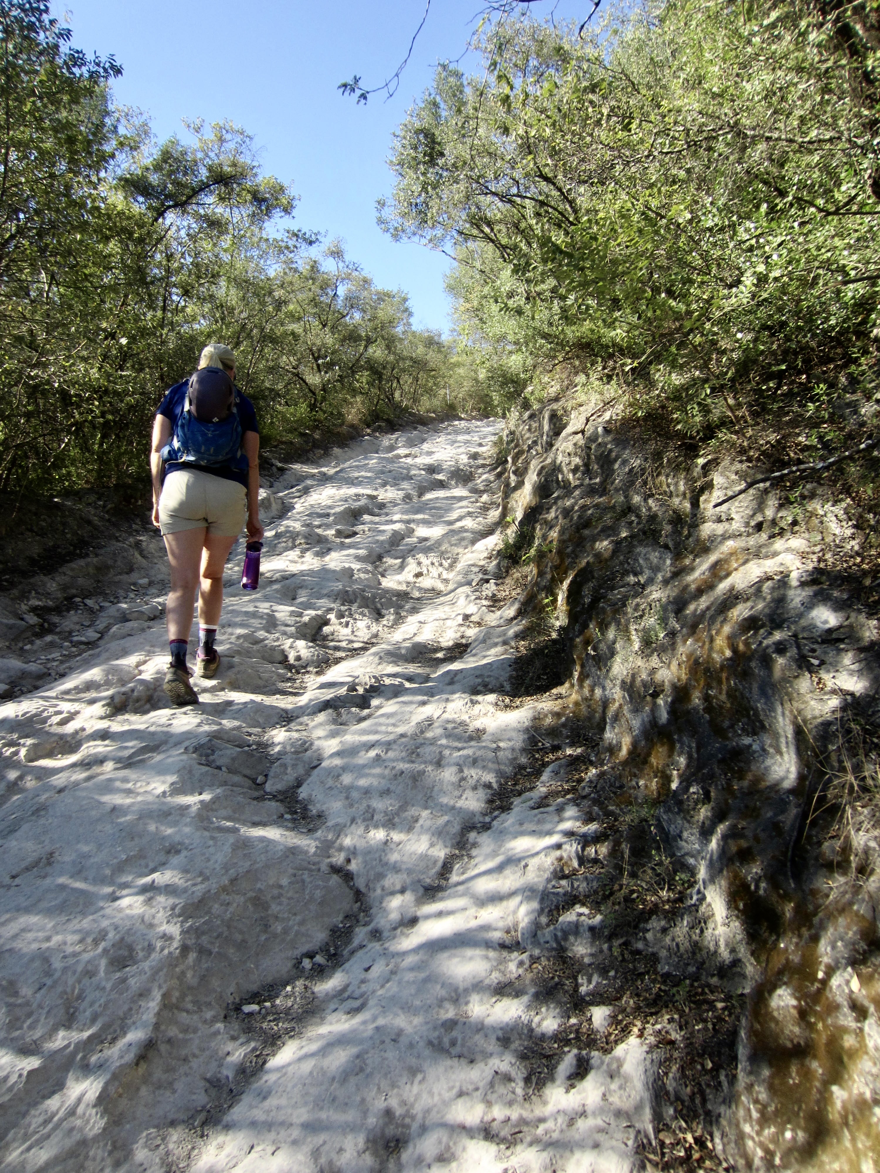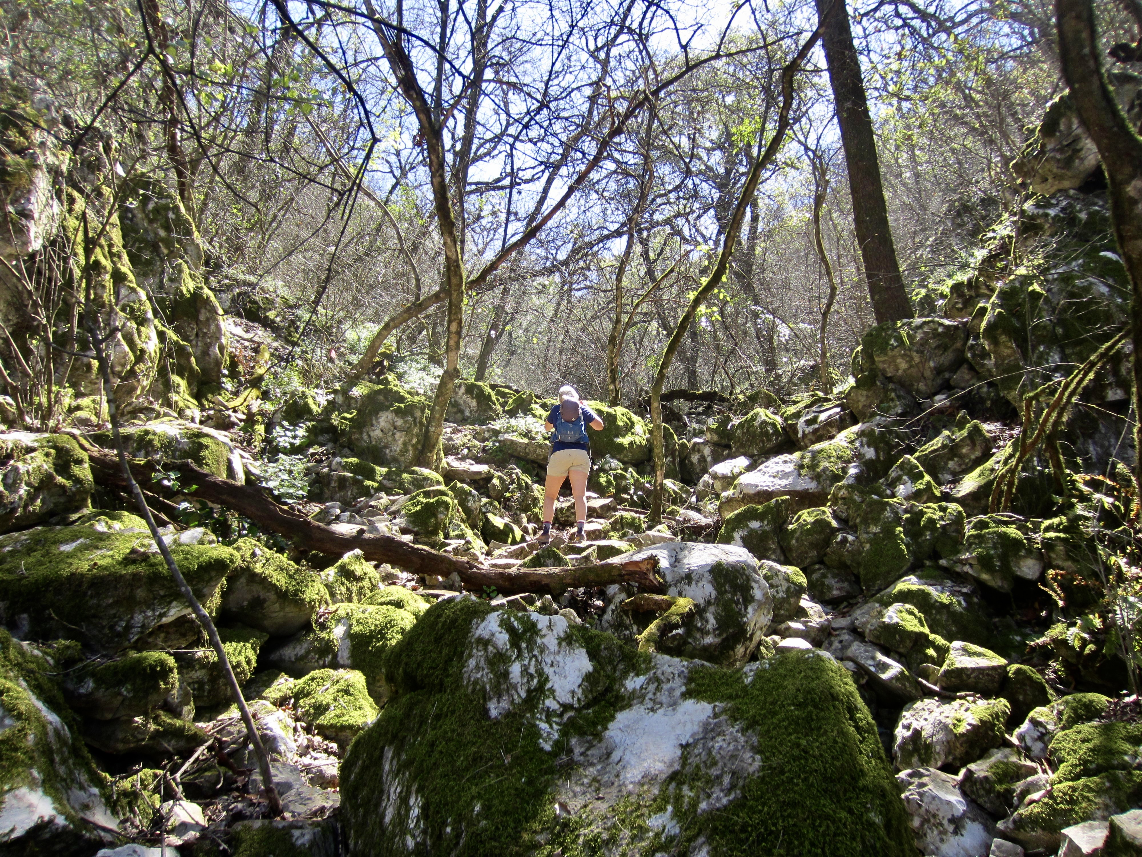 Our progress had been frustratingly slow during the traverse, but now we were gaining elevation rapidly as the steep path curved around oak trees and over limestone slabs. After an hour, however, Eileen waved me ahead due to concerns about our time required to finish the ascent and then make the entire descent.