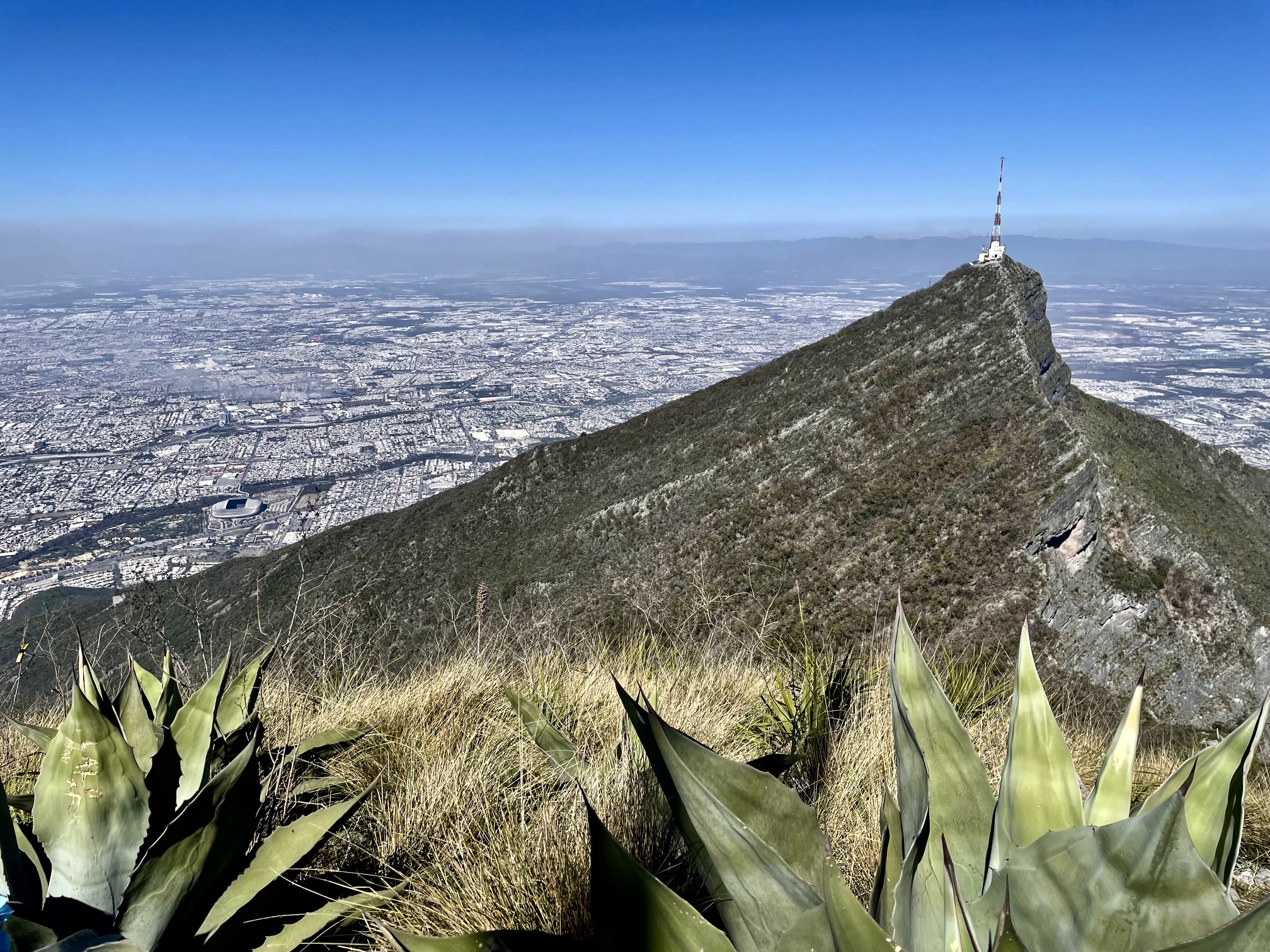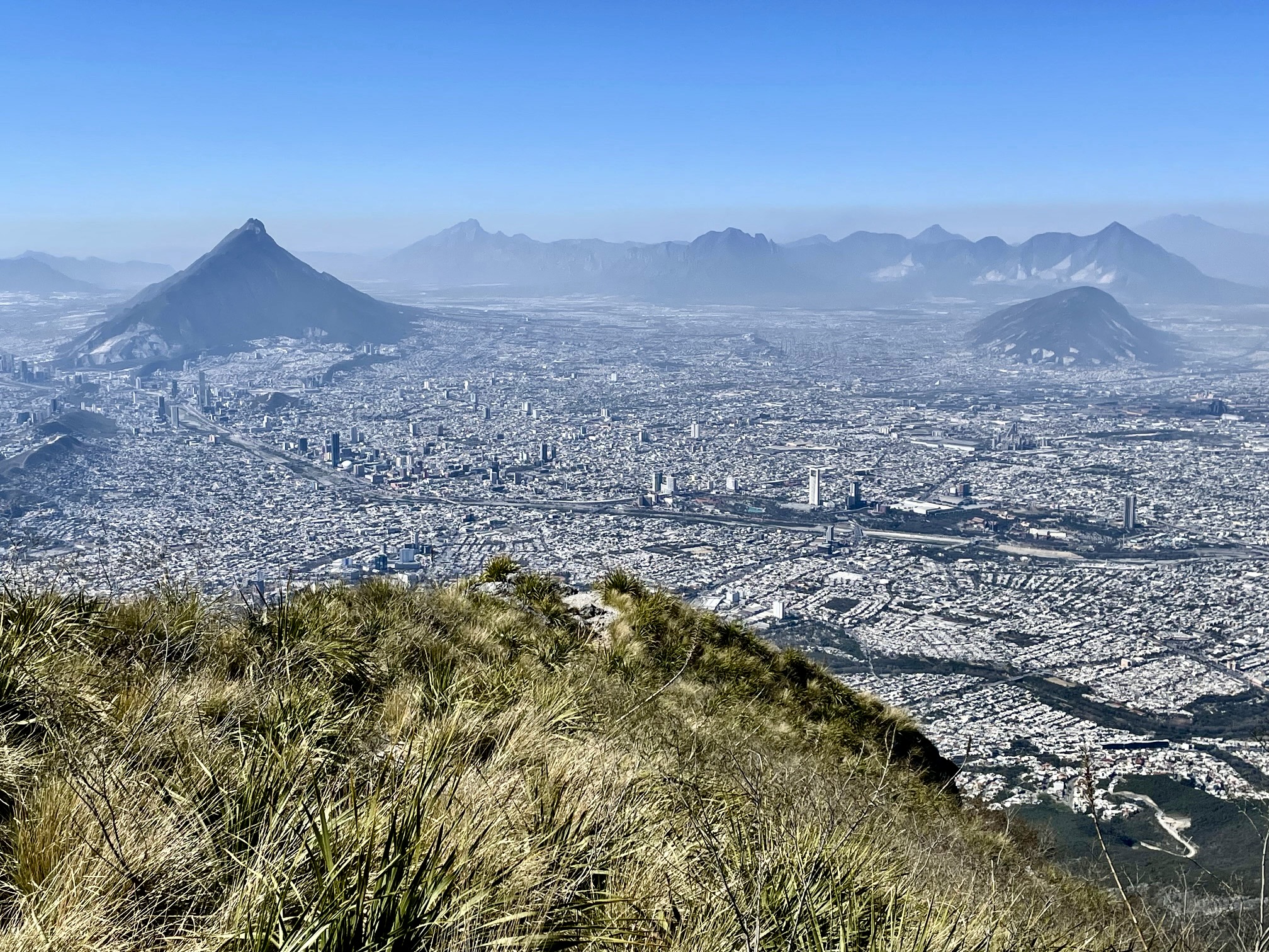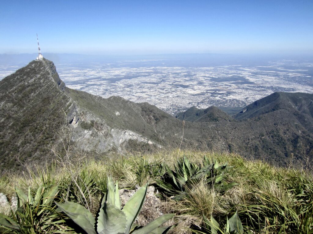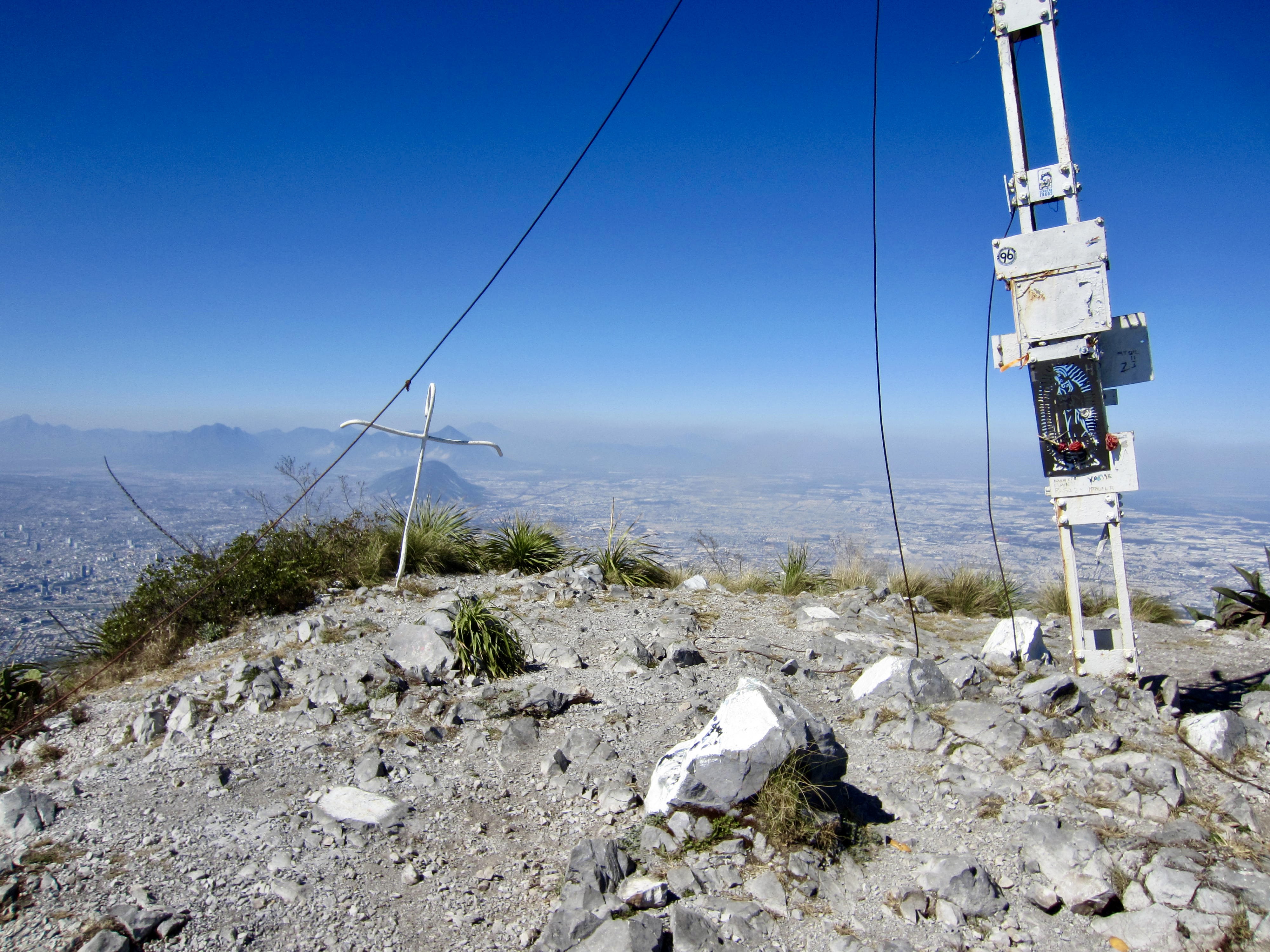 Thanks to its position on the southeastern fringe of Monterrey, this peak provides an outstanding vantage of the entire metropolitan area, which has a population exceeding 5 million. Amidst the urban sprawl, Cerro de las Mitras (“The Miters Mountains”) rise up like a breaking wave. Closely to my north and slightly lower, Pico Silla Antena displayed its summit communication structures.