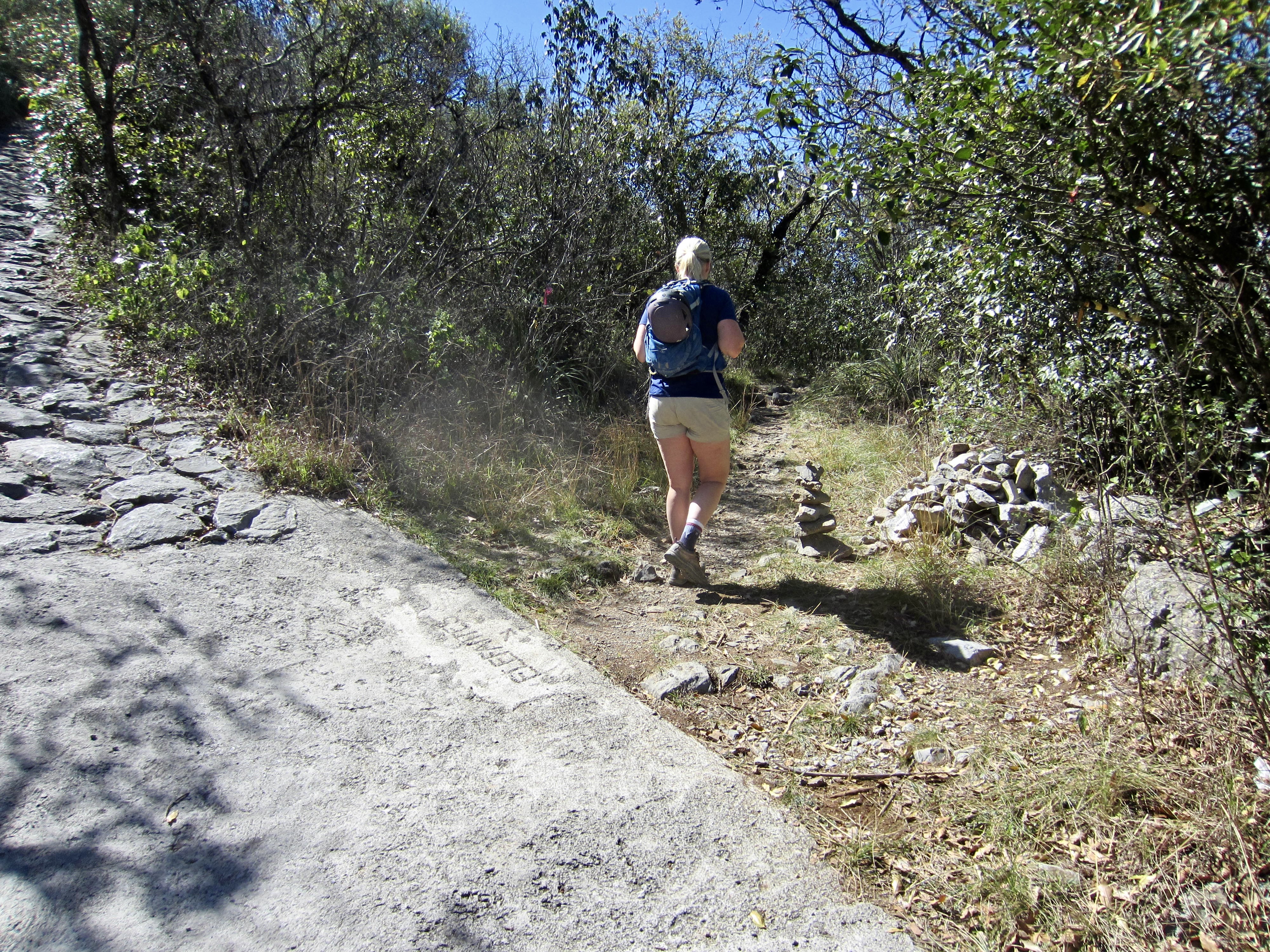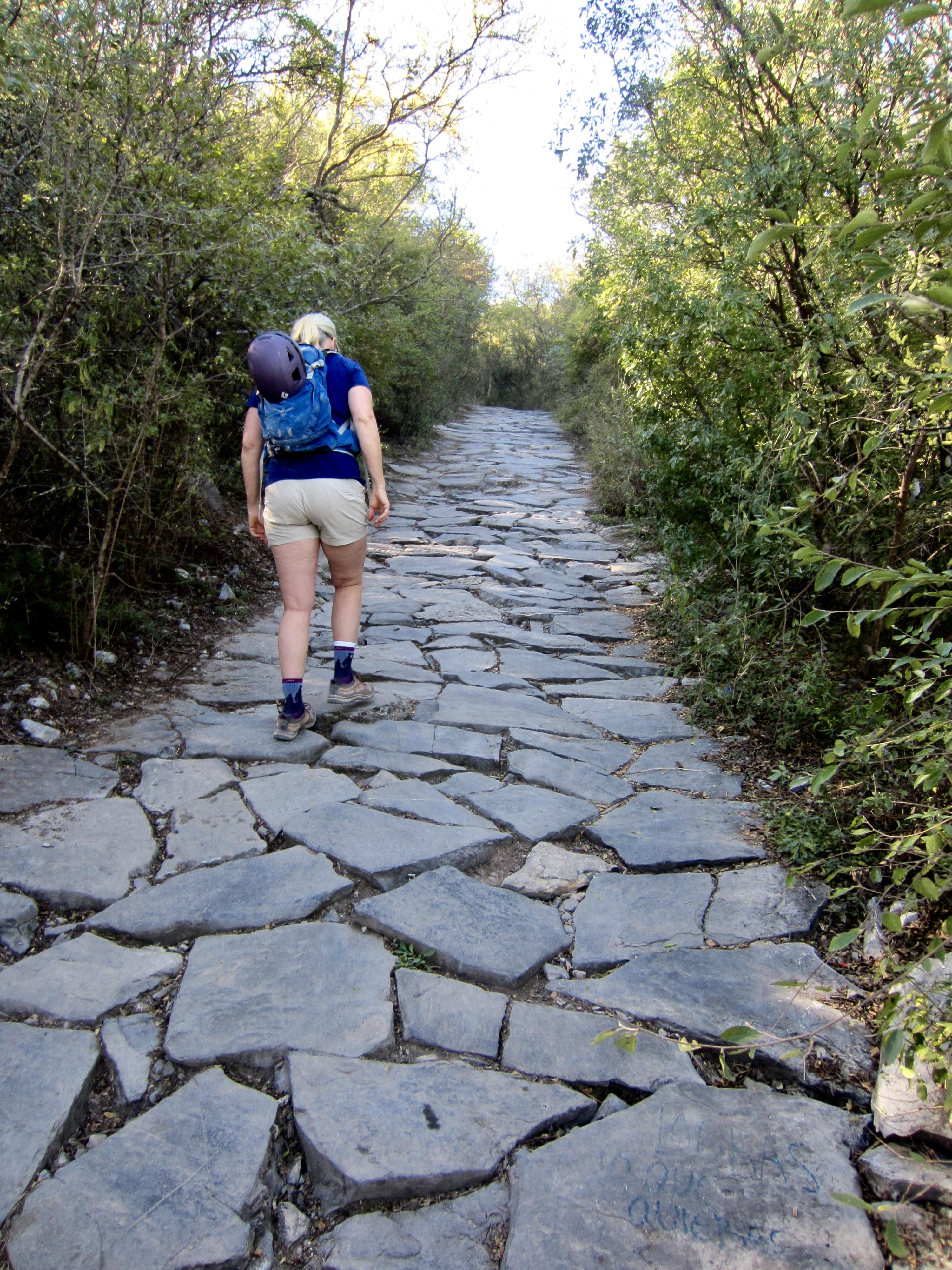 Eileen and I parked near the trailhead and began hiking up the Cerro de la Silla Trail on a mild, sunny Tuesday morning. The initial segment of this road-trail consists of lumpy limestone bedrock, but after the second switchback, most of the surface is paved with concrete or flagstones. We steadily gained elevation along with dozens of other trekkers. It became obvious that this is an extremely popular hike among Monterrey residents and tourists alike.