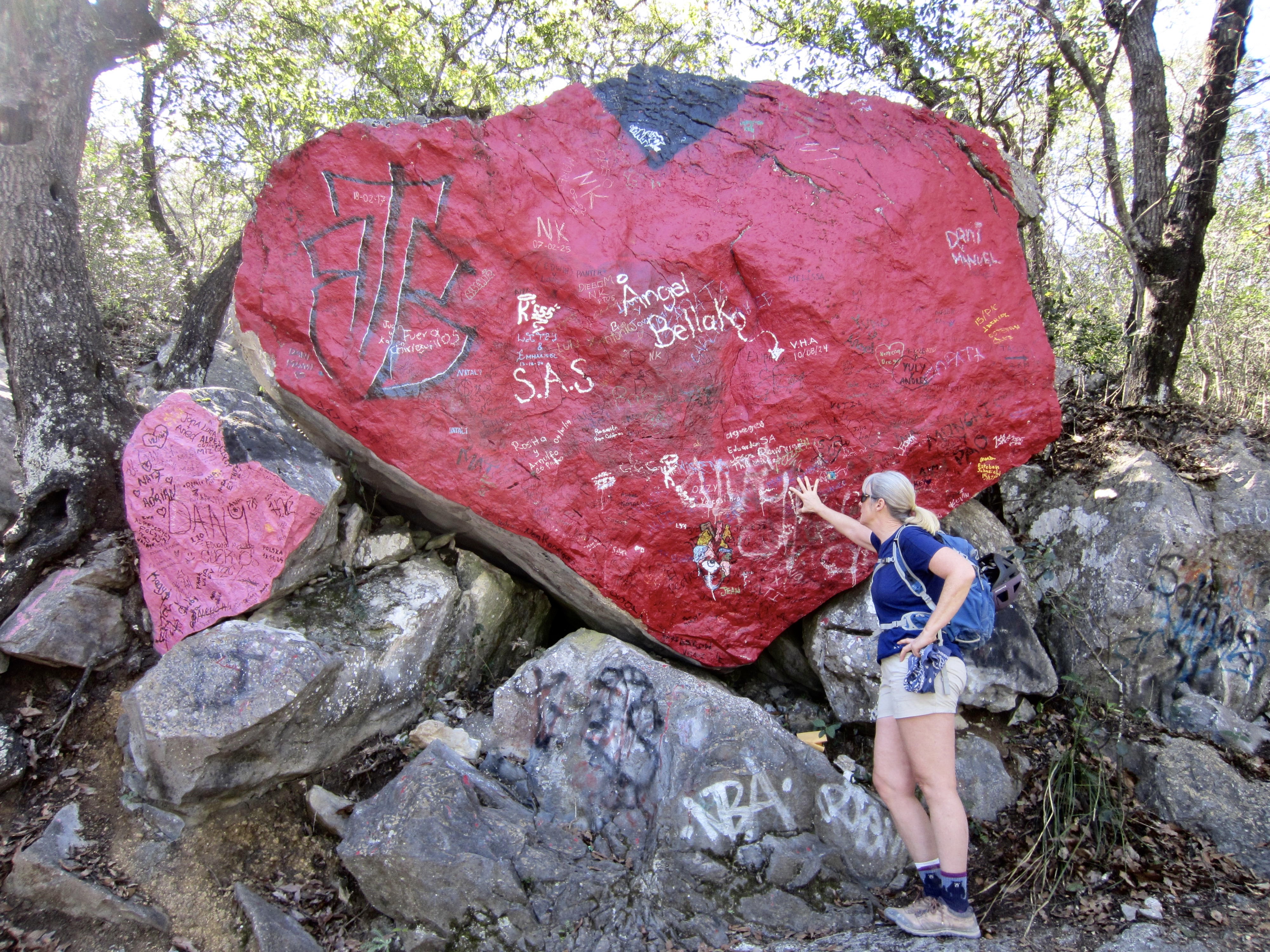 Beyond the gondola station, a series of tight switchbacks took us past a large, heart-shaped boulder sporting a flashy coat of scarlet paint. Soon after, we arrived at a junction with a primitive trail leading straight into the forest. This is the start of the Pico Silla Norte climber’s path.
