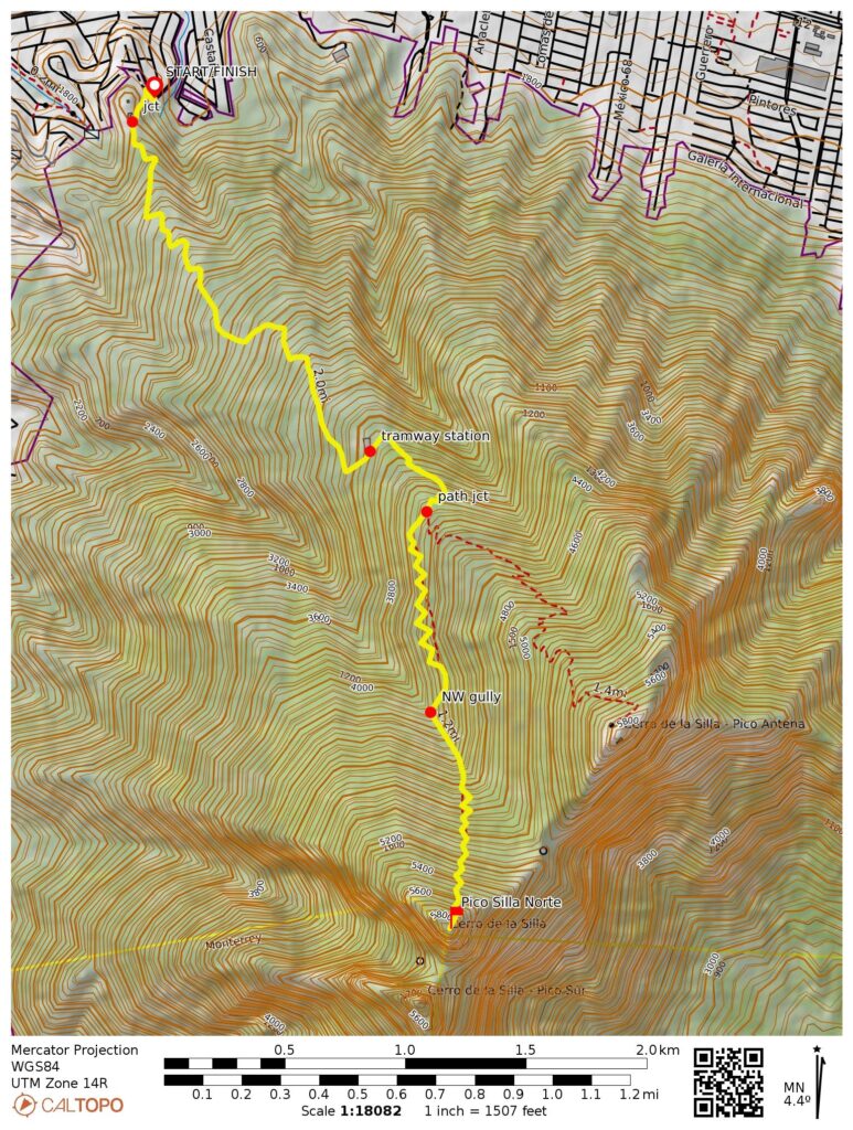 Way Points: 10 Commandments monument & abandoned teleferico/gondola station & Pico Silla Norte path junction & northwest gully invert & Pico Silla Norte summit (trail hike & trail scramble)