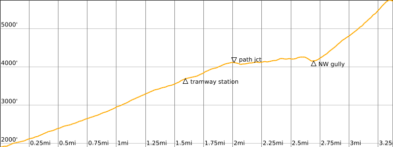 Our reward for the late descent was a stunning sunset view from the old gondola station. Dozens of other people were there to enjoy the same view, and we passed a hundred more hikers on the trail before we reached the trailhead long after dark (5.2 hours + 300 ft / 90 m from summit). It had been a long but very satisfying day, well worth the effort!