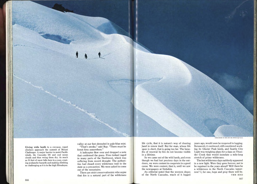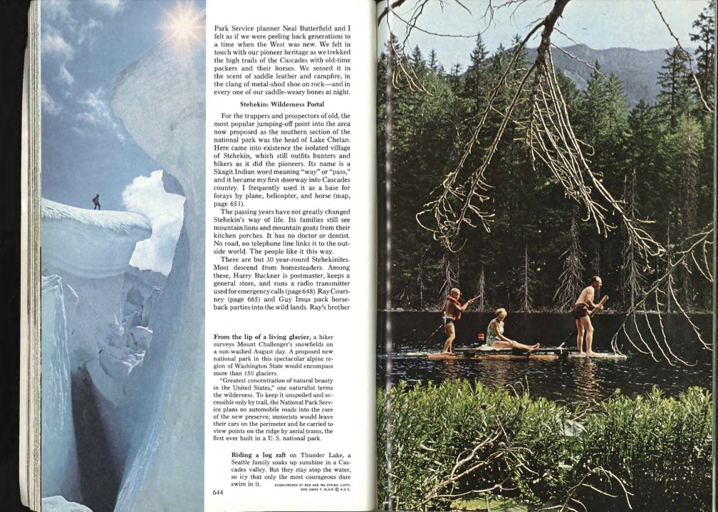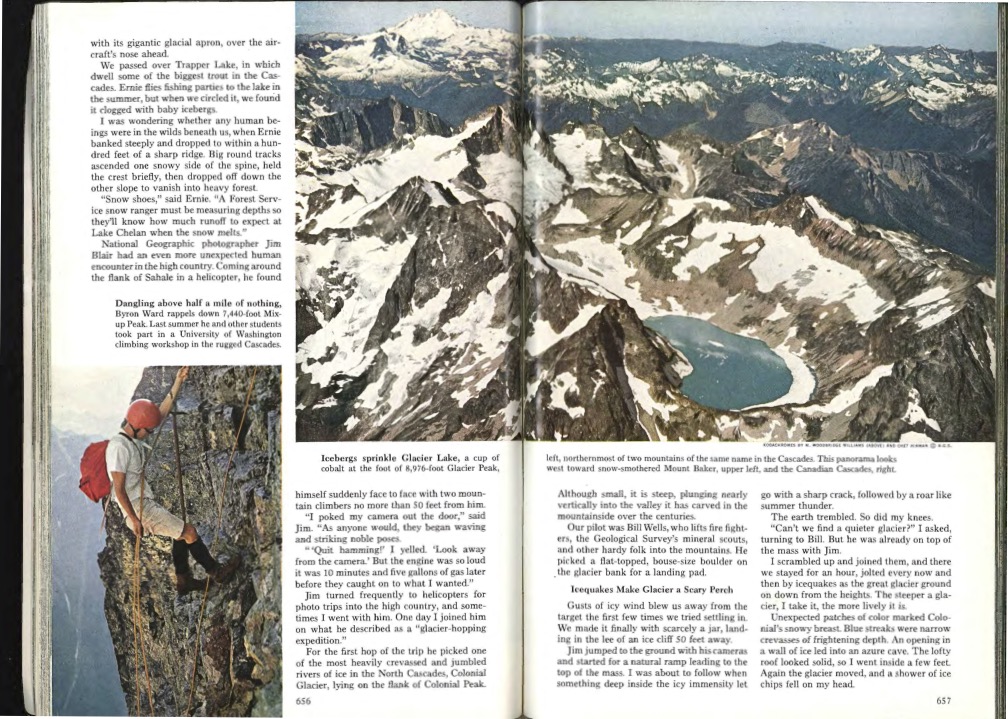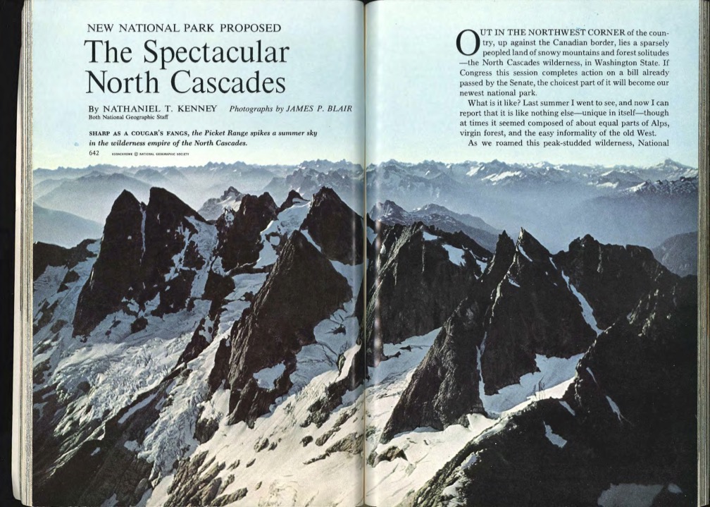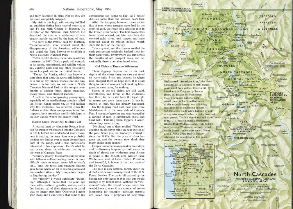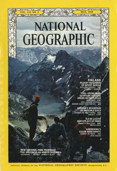 This article, published in a 1968 National Geographic magazine, describes a NatGeo staffer’s journey through various parts of the North Cascades to witness the mountain landscape that lay within the then-proposed North Cascades National Park. Shortly after publication, the U.S. Congress approved creation of the park.
