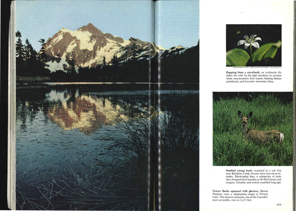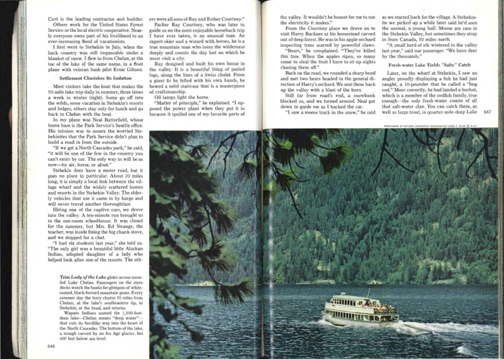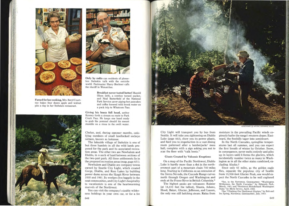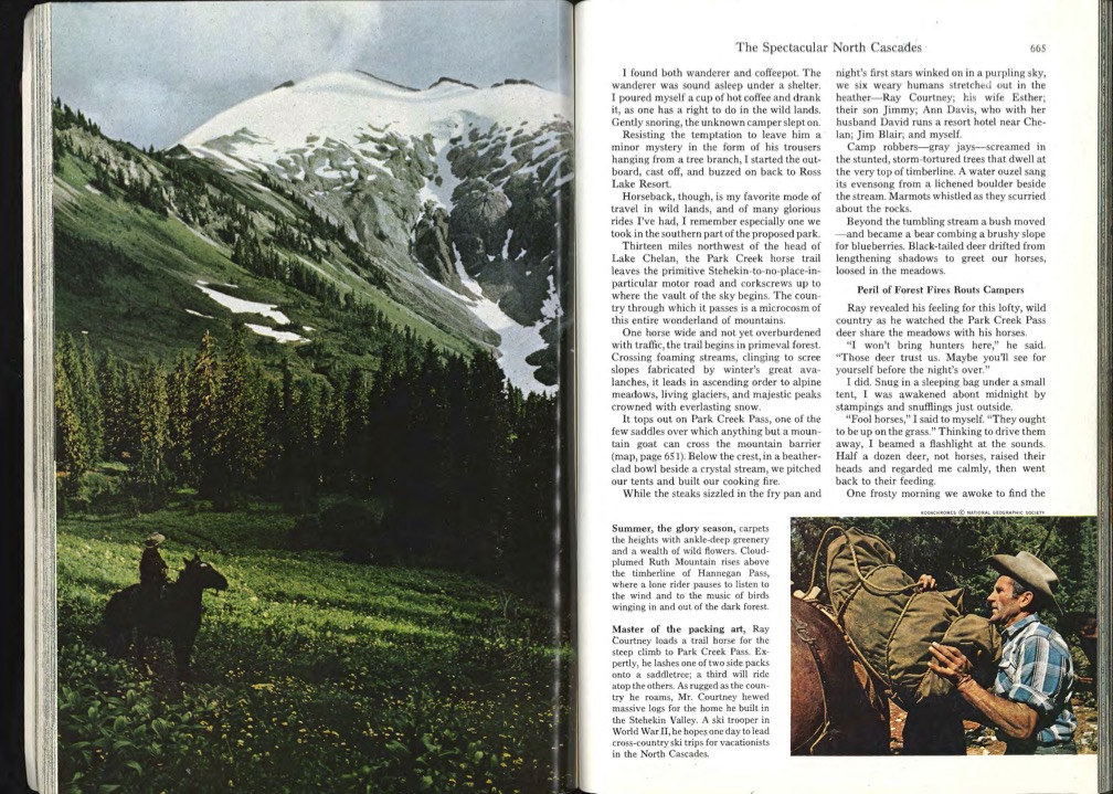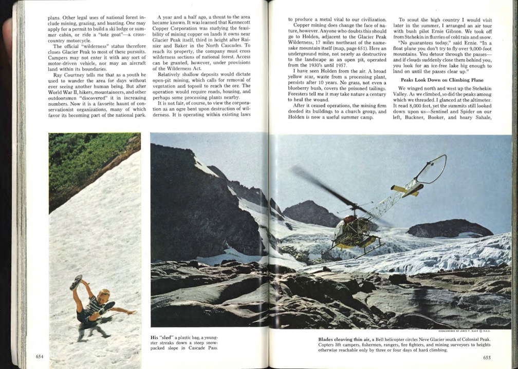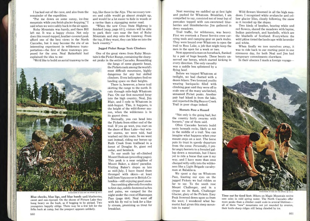 This article, published in a 1968 National Geographic magazine, describes a NatGeo staffer’s journey through various parts of the North Cascades to witness the mountain landscape that lay within the then-proposed North Cascades National Park. Shortly after publication, the U.S. Congress approved creation of the park.