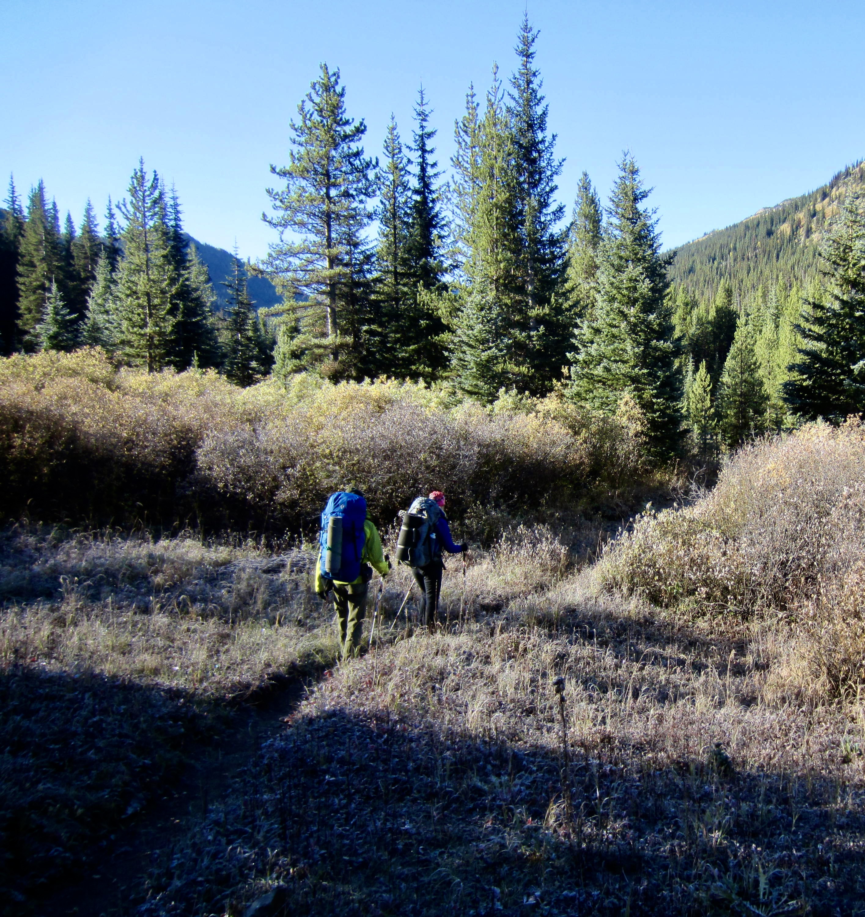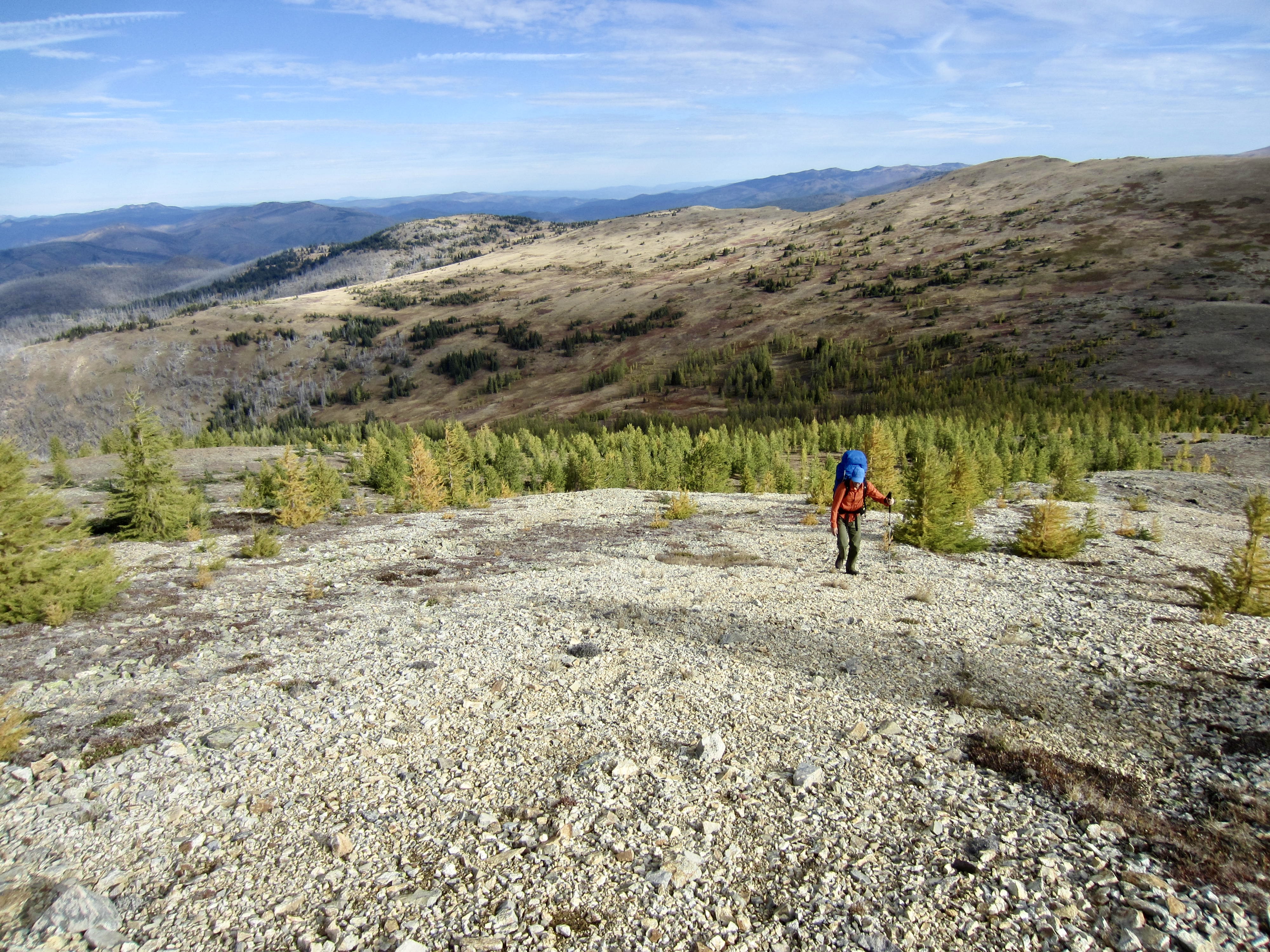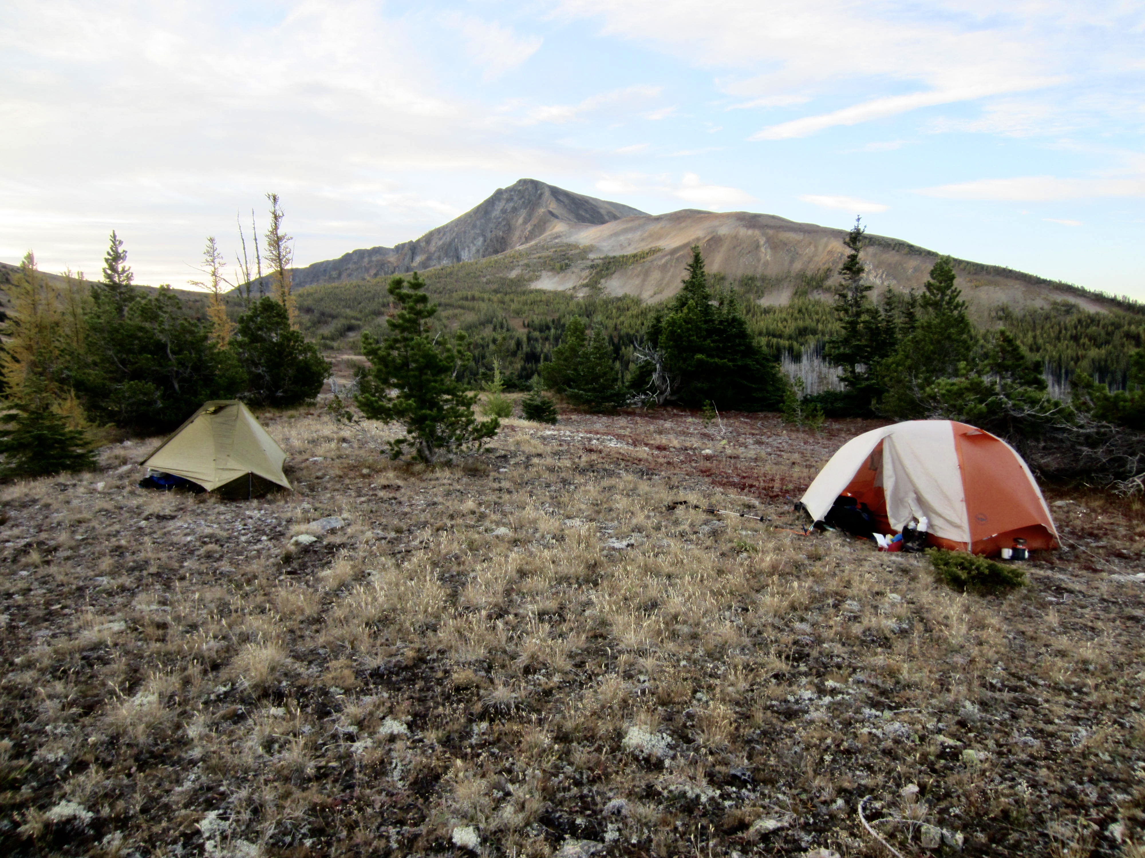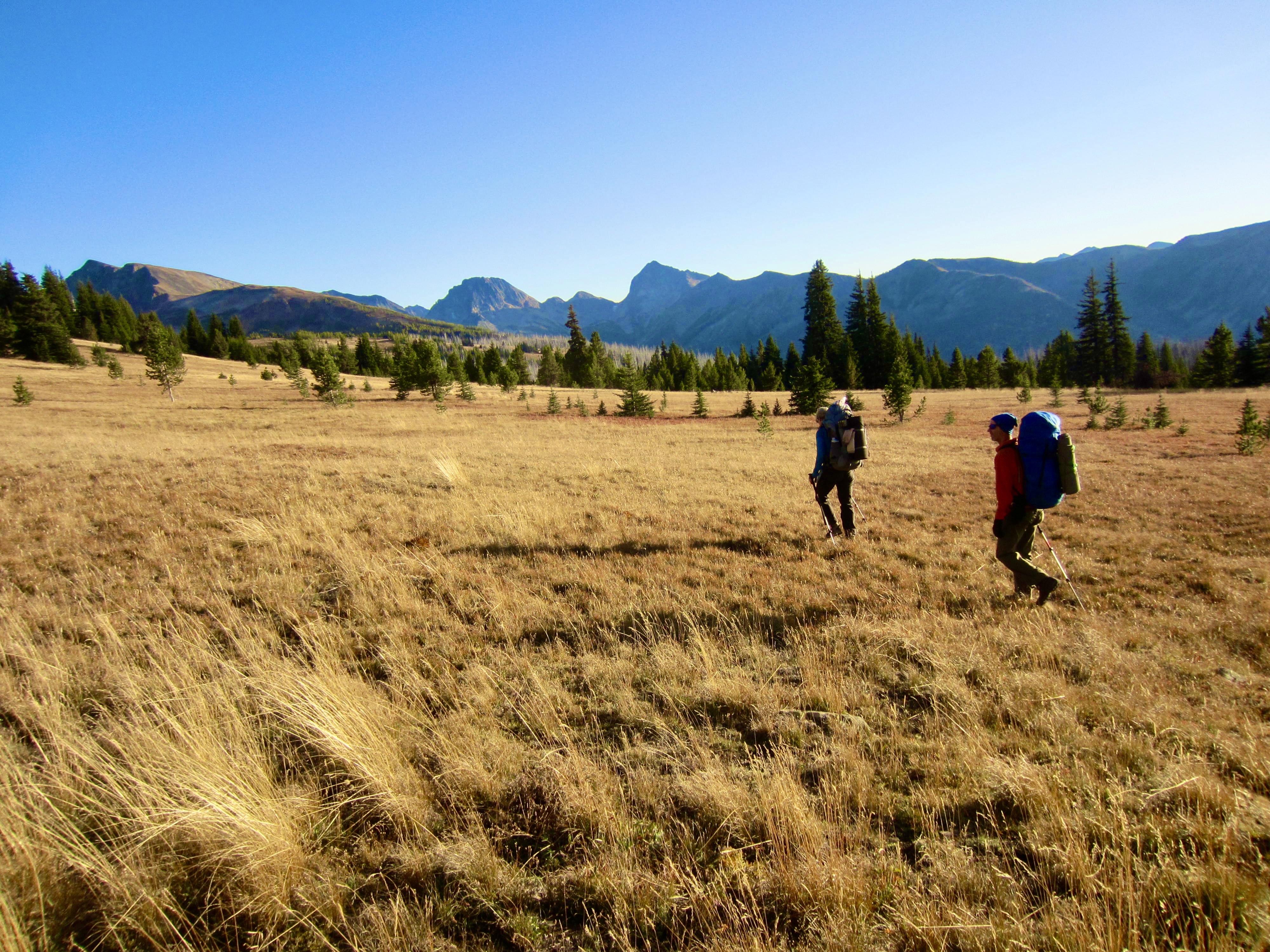 The night had been cold and clear, but clouds drifted over throughout the morning. From our camp on Tamarack Ridge, we contoured into a large, grassy basin at the head of Tamarack Creek. Here, we were happy to find a small creek that allowed us to refill our empty water bottles. This basin would provide a nice campsite without the need to haul water up from Lease Creek.
