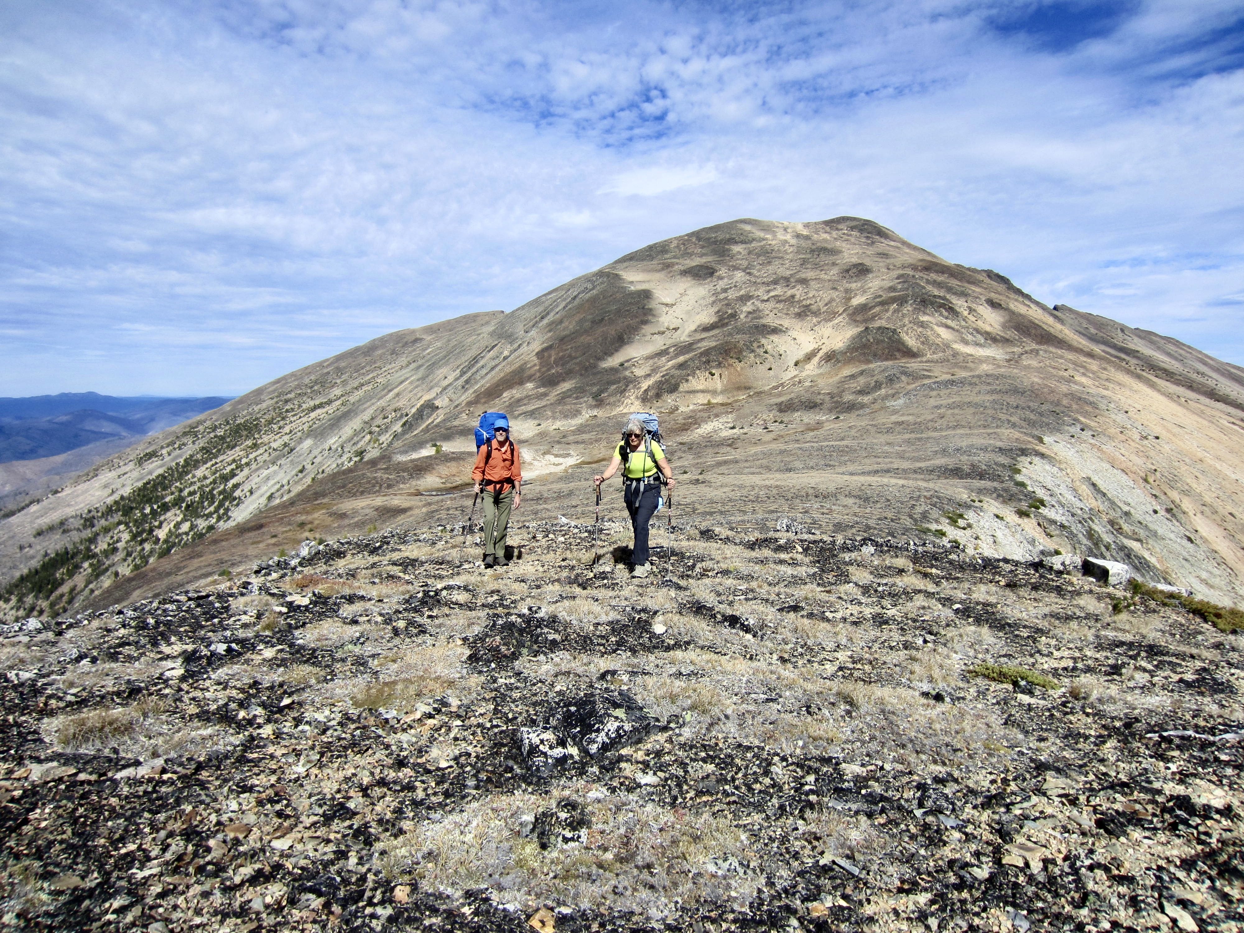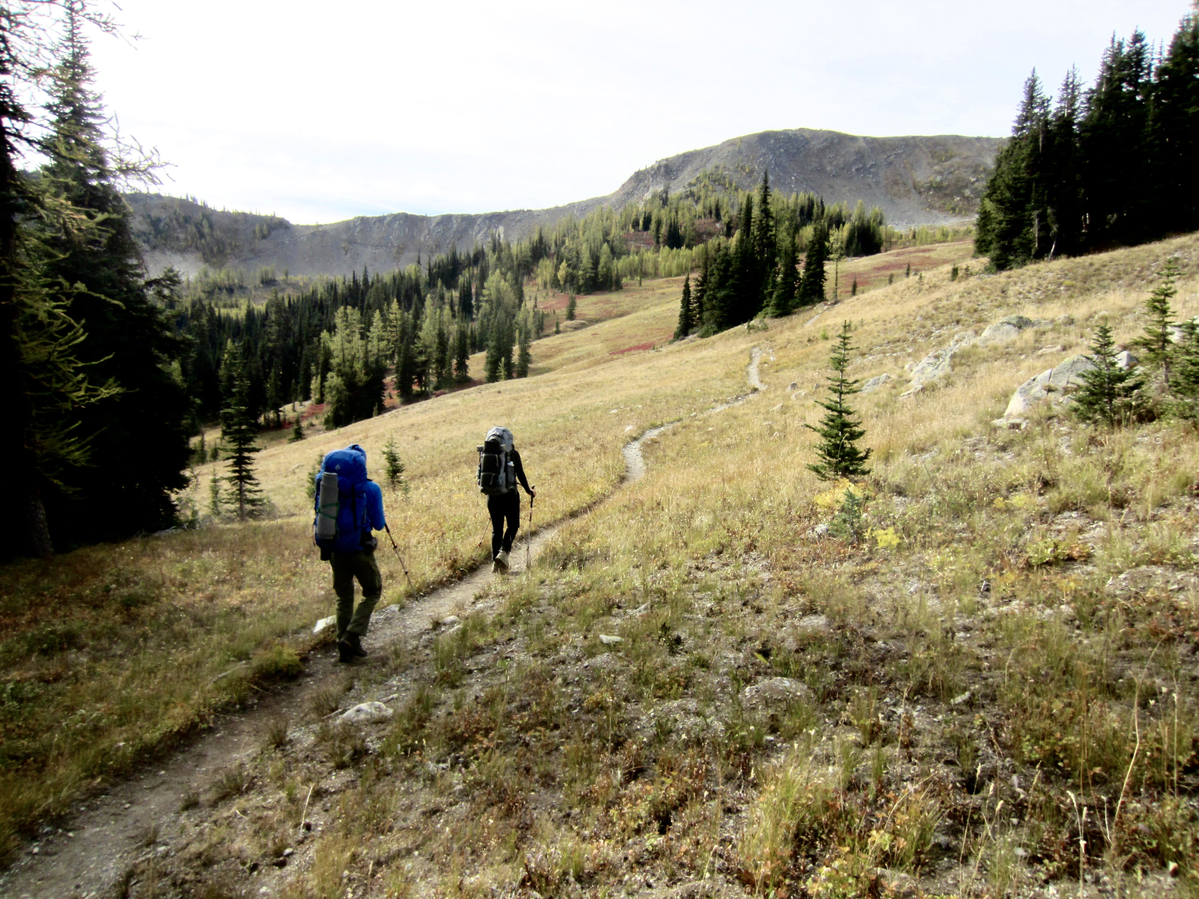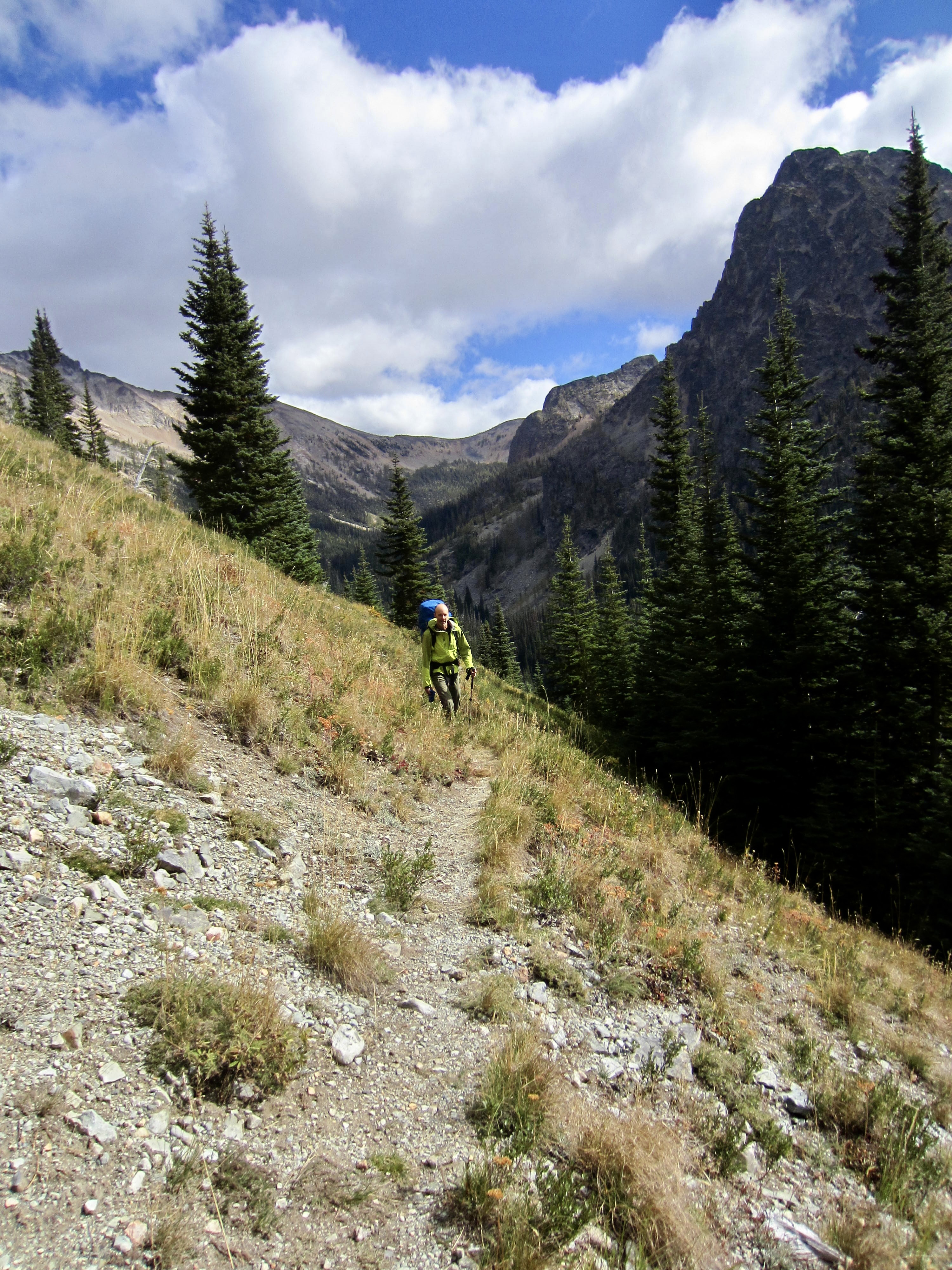 The night had been cold and clear, but clouds drifted over throughout the morning. From our camp on Tamarack Ridge, we contoured into a large, grassy basin at the head of Tamarack Creek. Here, we were happy to find a small creek that allowed us to refill our empty water bottles. This basin would provide a nice campsite without the need to haul water up from Lease Creek.