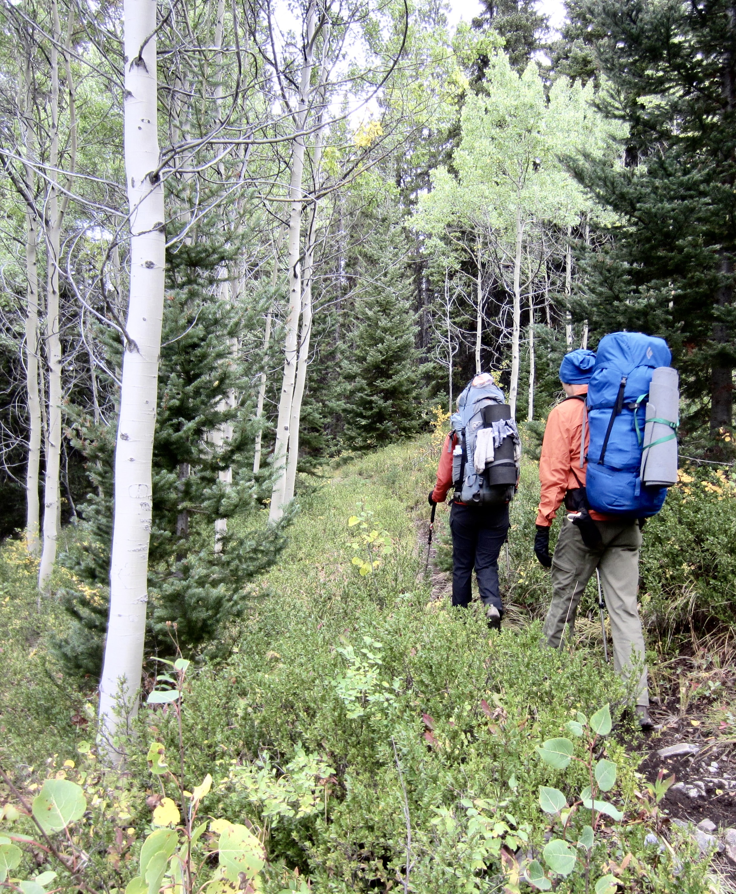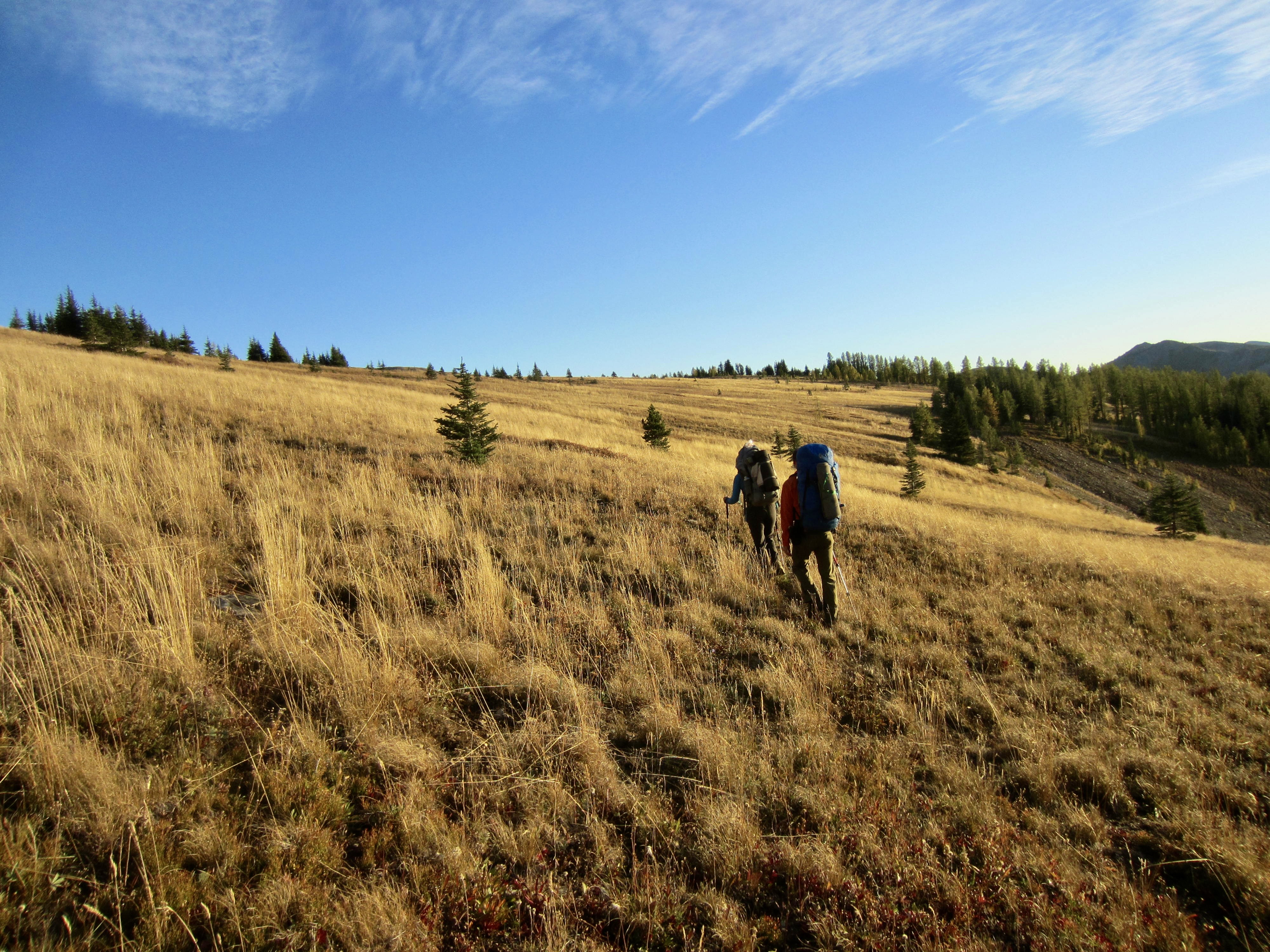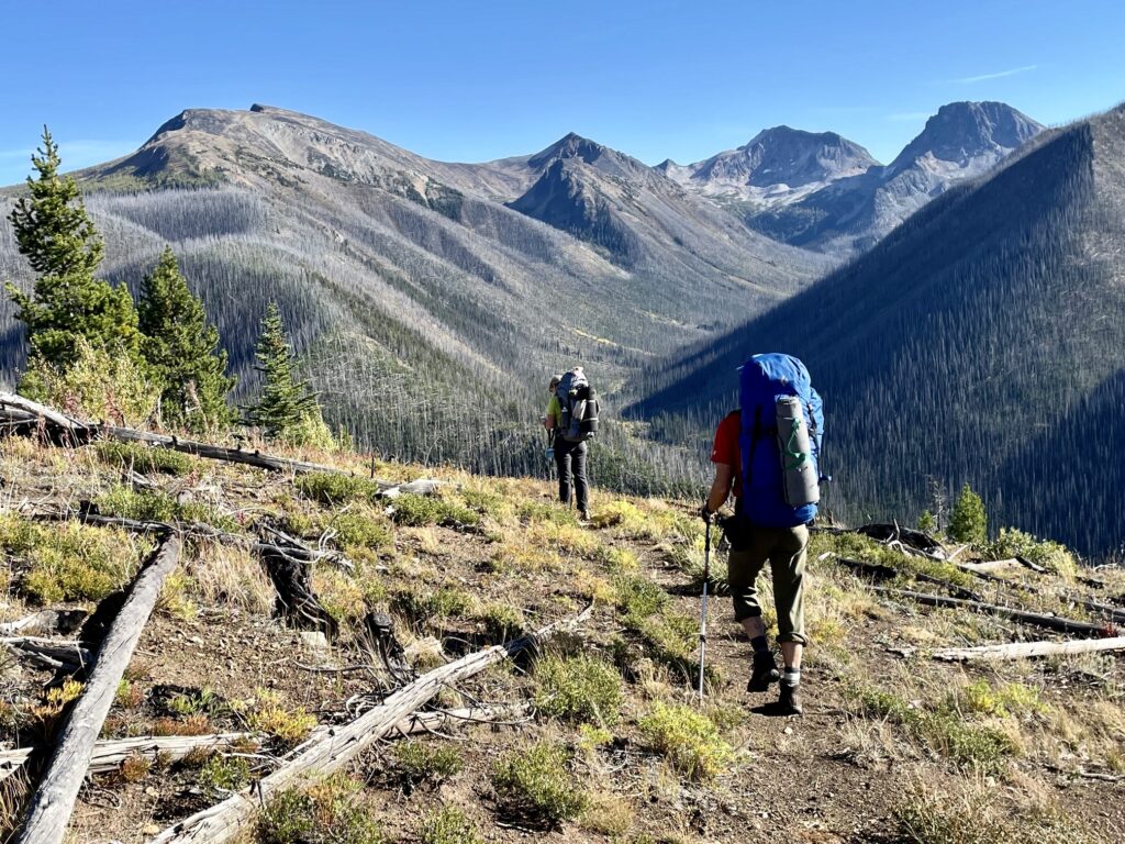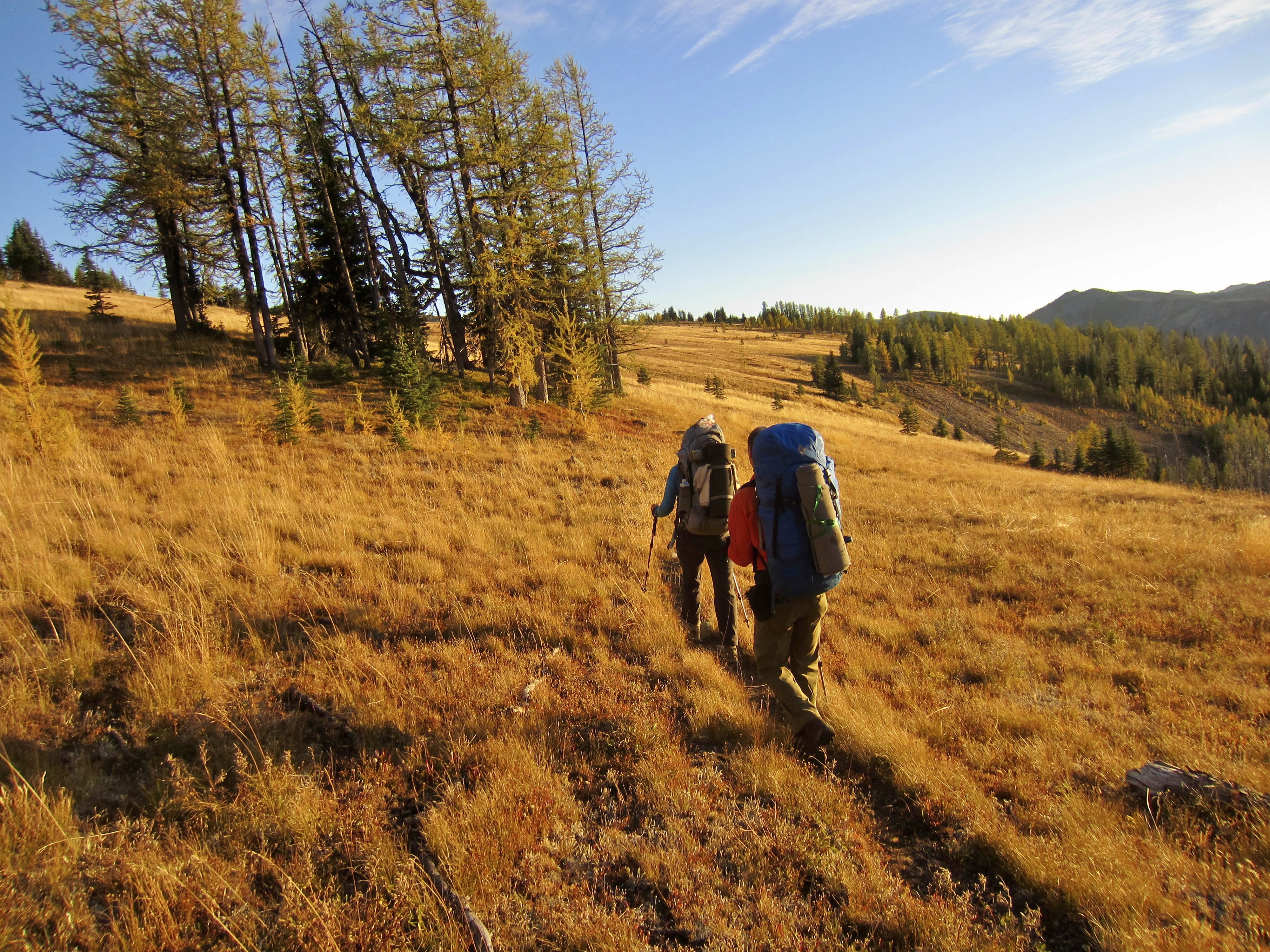 The night had been cold and clear, but clouds drifted over throughout the morning. From our camp on Tamarack Ridge, we contoured into a large, grassy basin at the head of Tamarack Creek. Here, we were happy to find a small creek that allowed us to refill our empty water bottles. This basin would provide a nice campsite without the need to haul water up from Lease Creek.