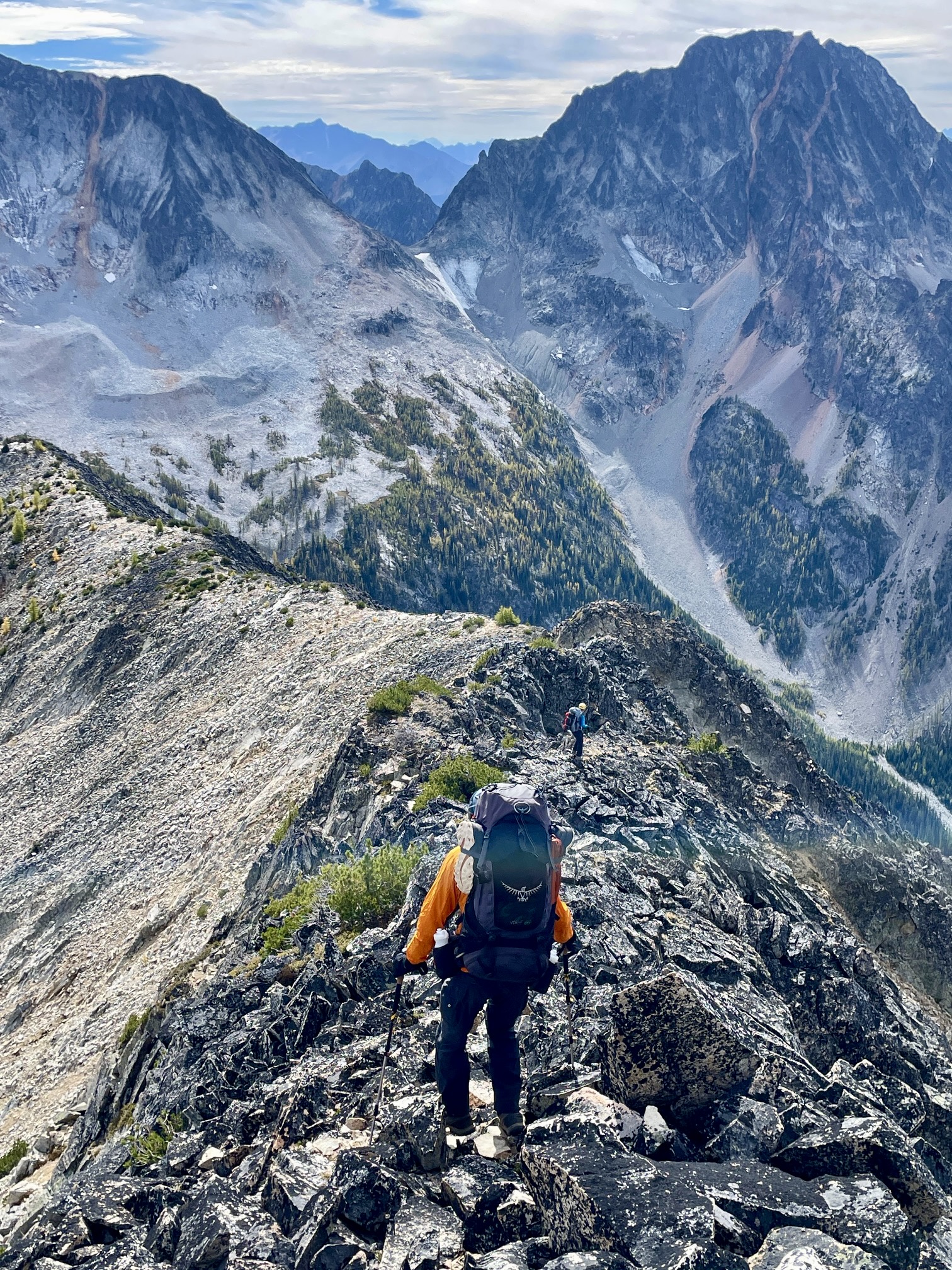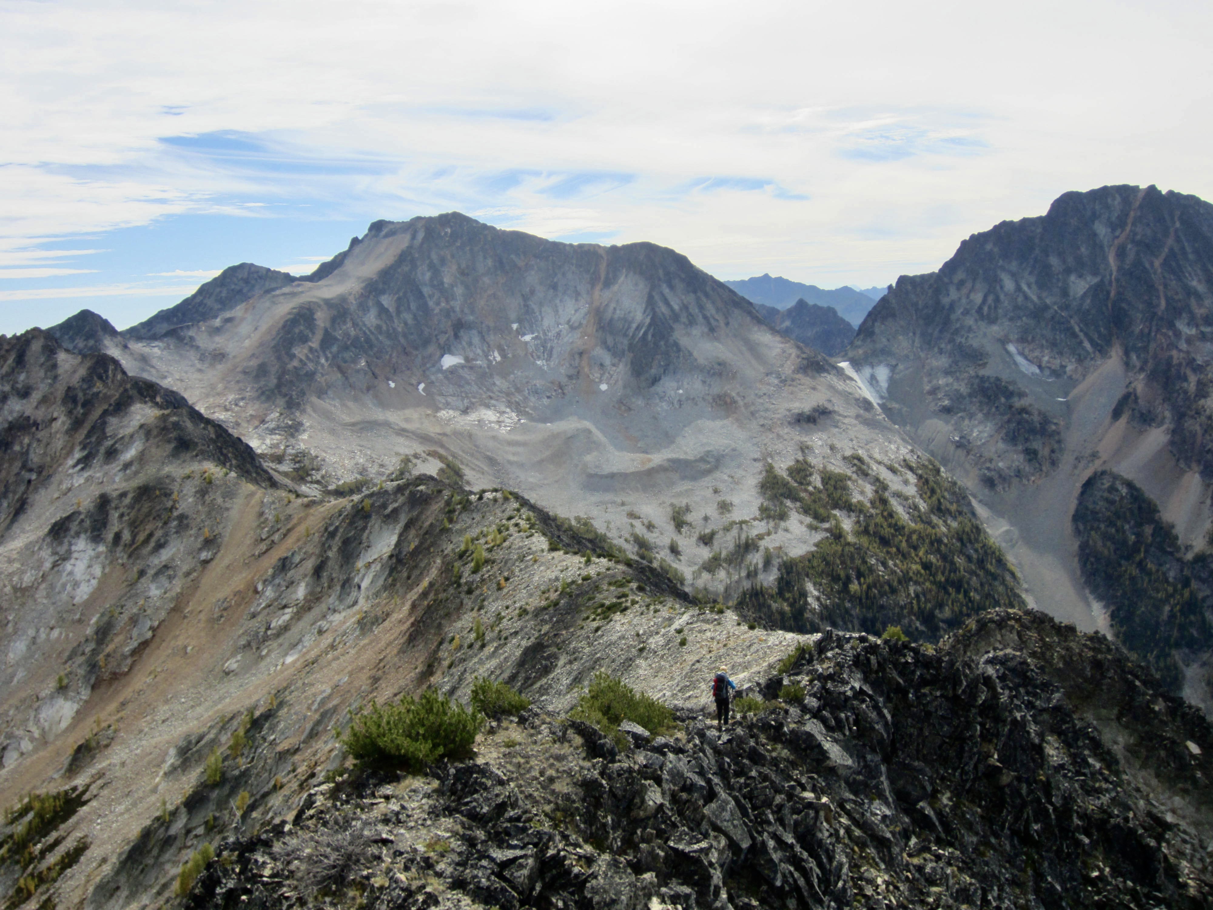 From the saddle, we easily ascended talus slopes to the summit of Dot Mountain (4.6 hours + 2200 feet from Camp 2). Things then got more exciting as we began descending Dot’s south ridge. This ridge is narrow and blocky, with considerable exposure on both sides, but the scrambling never exceeds Class 3.