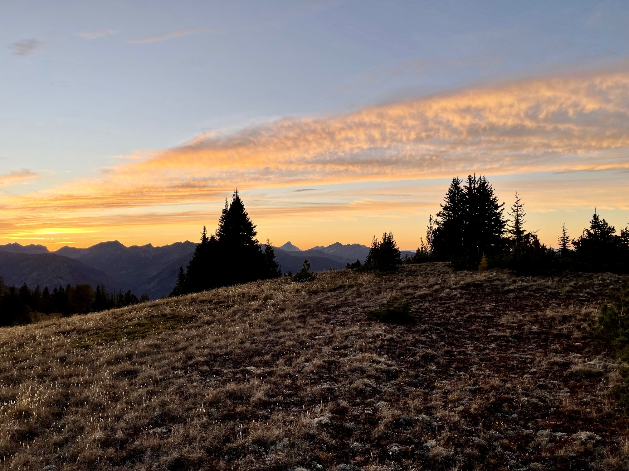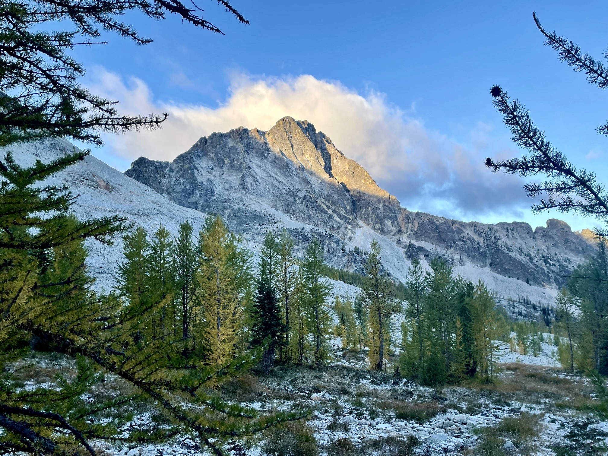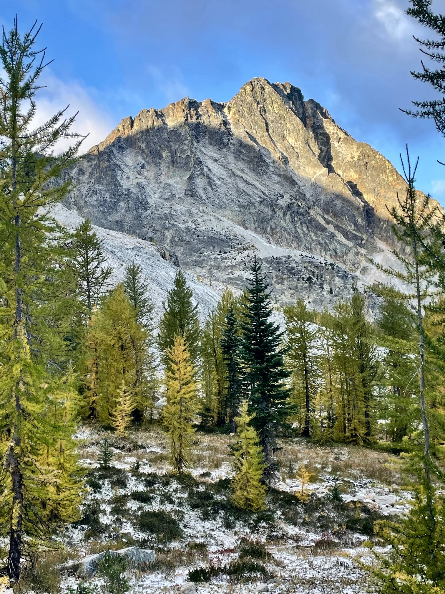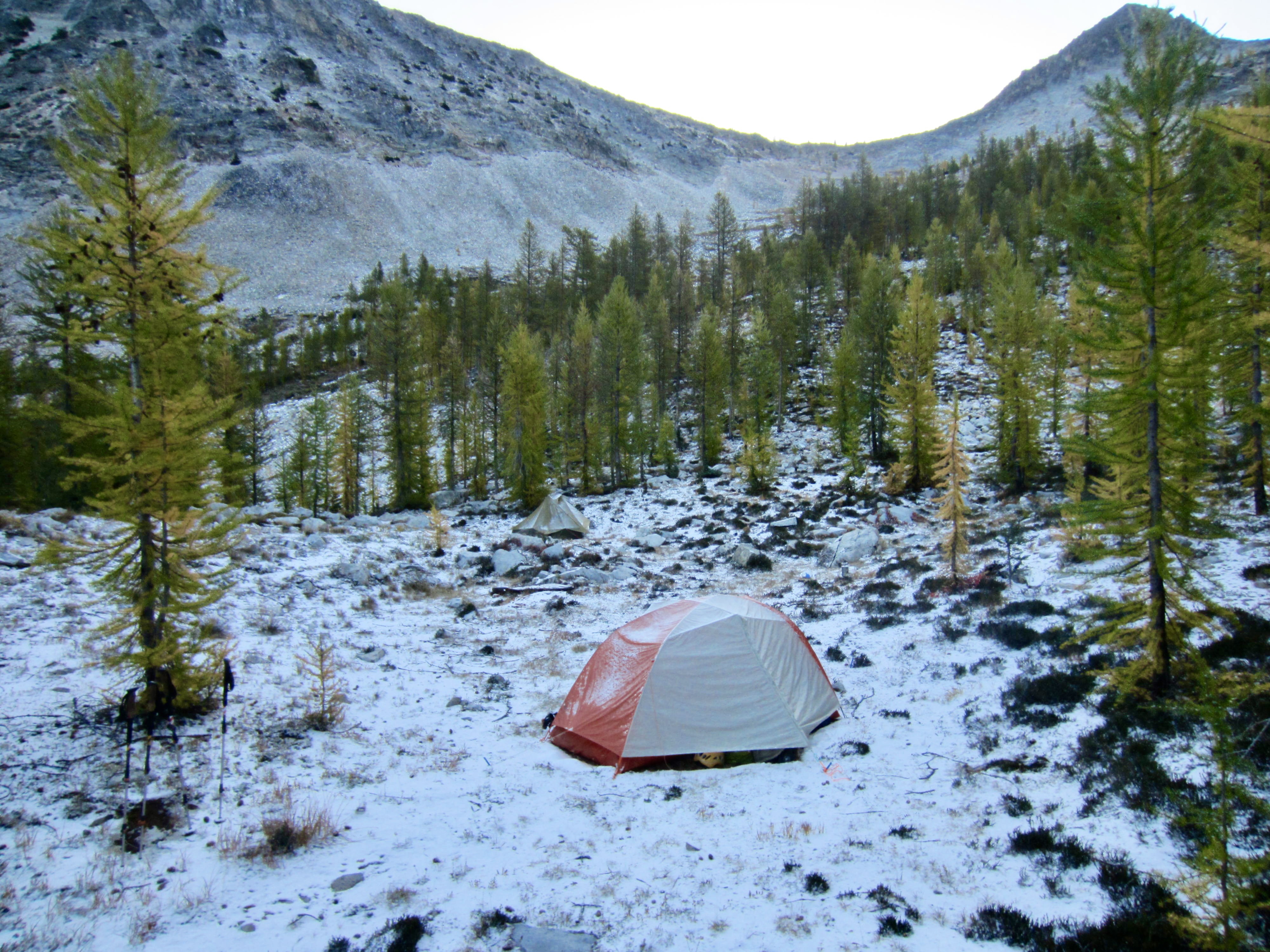 Following a cold night, we awoke to fresh snow on the ground. The contrast between white snow and golden larches created a beautiful autumn scene, but we wondered how this would affect our morning traverse over the Lago–Carru Col. It wouldn’t take long to find out.