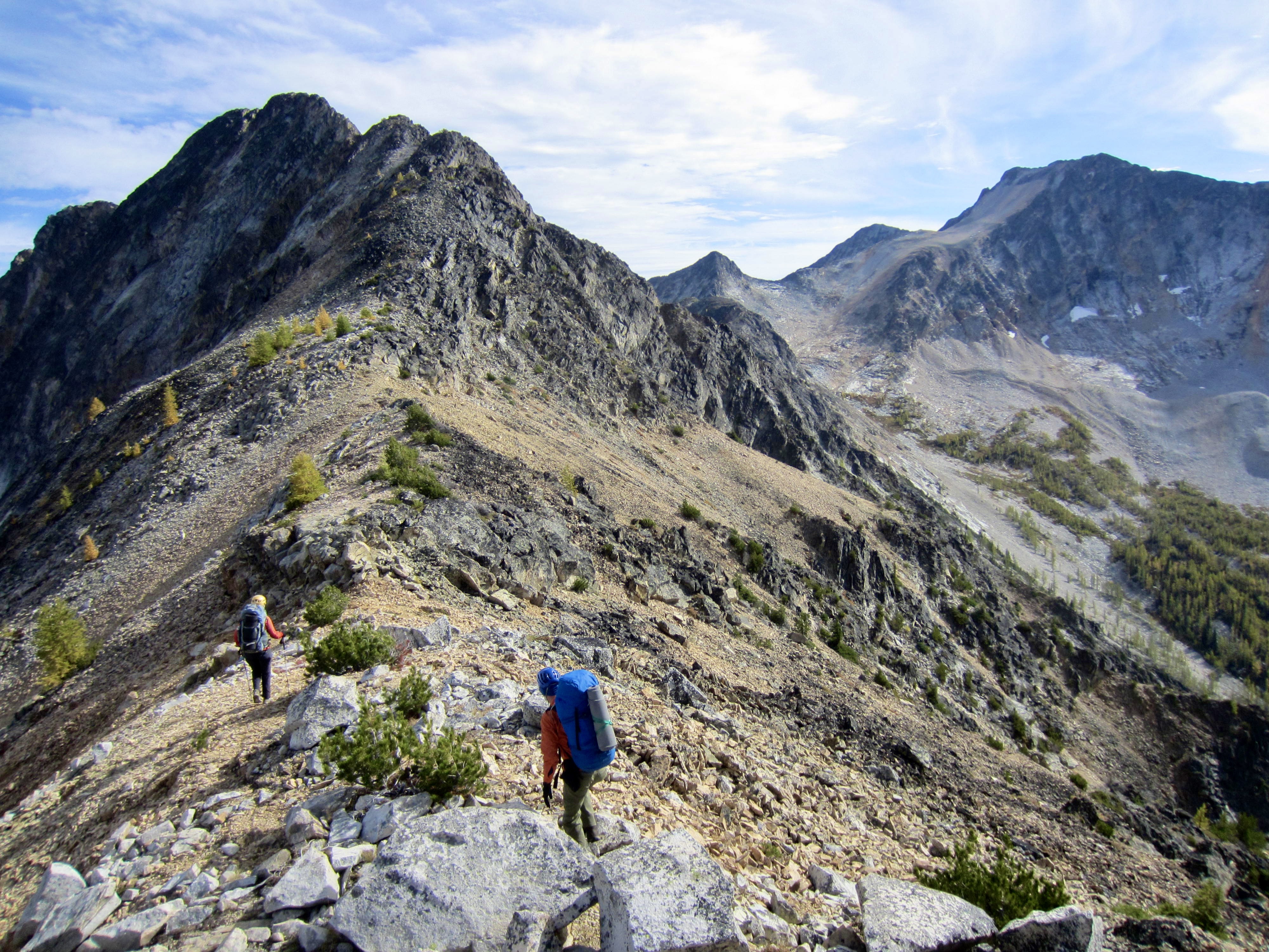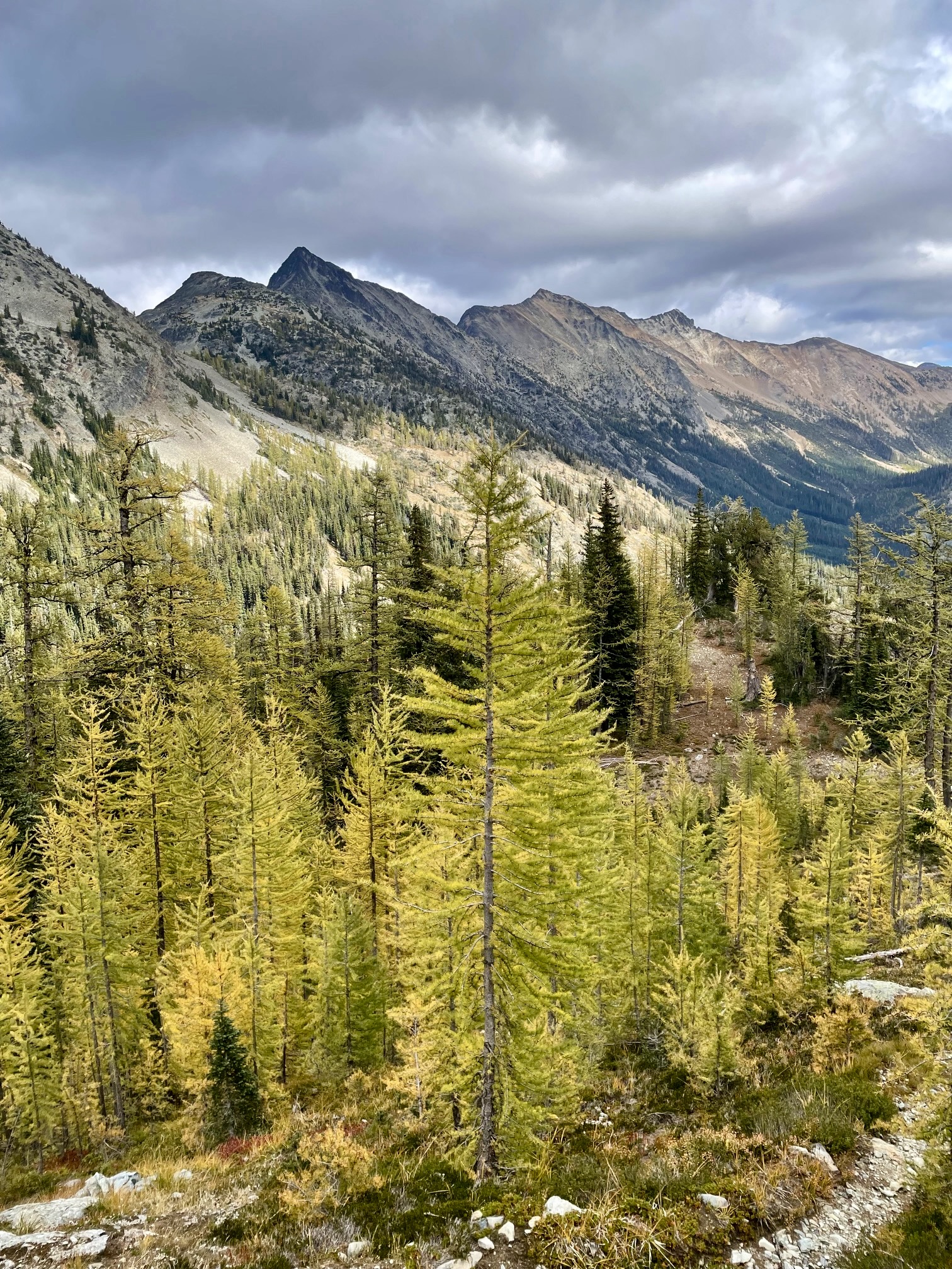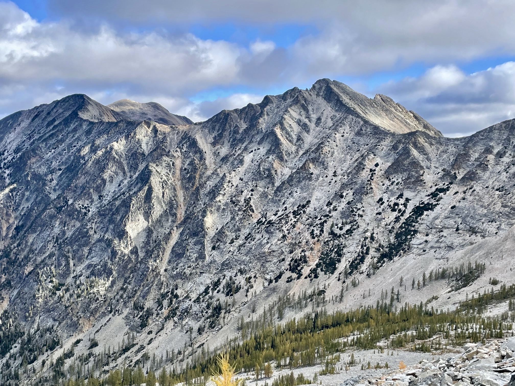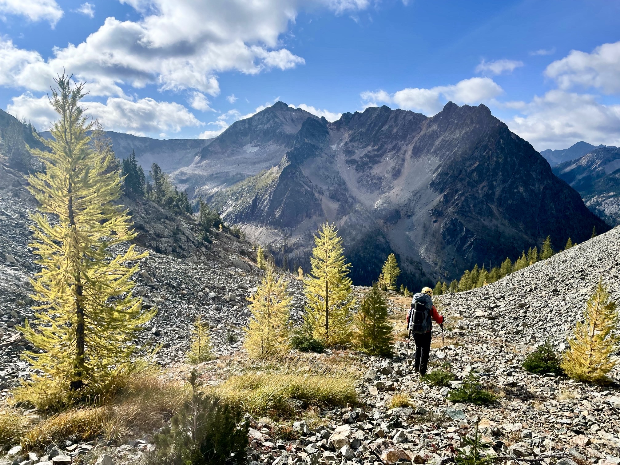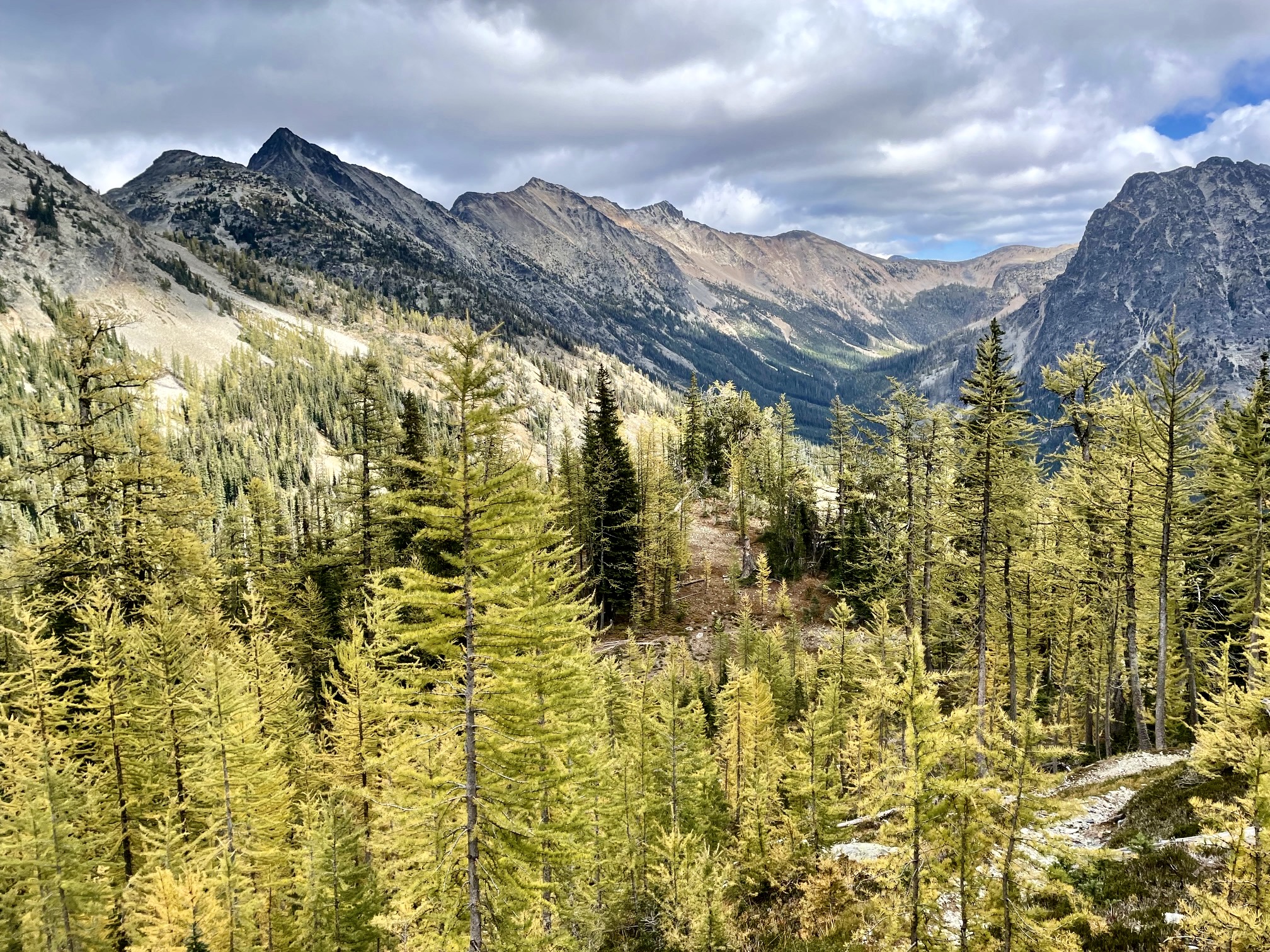 For this year’s Golden Larch Outing, Eileen, Todd, and I did a 40-mile loop through the Pasayten Mountains, starting at Slate Pass. The heart of our loop comprised a cross-country traverse up Tatoosh Ridge, over the summits of Ptarmigan Peak and Dot Mountain, between Mt. Lago and Mt. Carru, and down to Eureka Creek. Although most of the terrain offered pleasant and scenic travel, a few areas were unpleasant or just downright awful. Our weather ran the gamut from mild and sunny to cool and rainy to cold and snowy—all of which merely enhanced our adventure. We were a week or so too early for prime larch color but did find some golden zones.