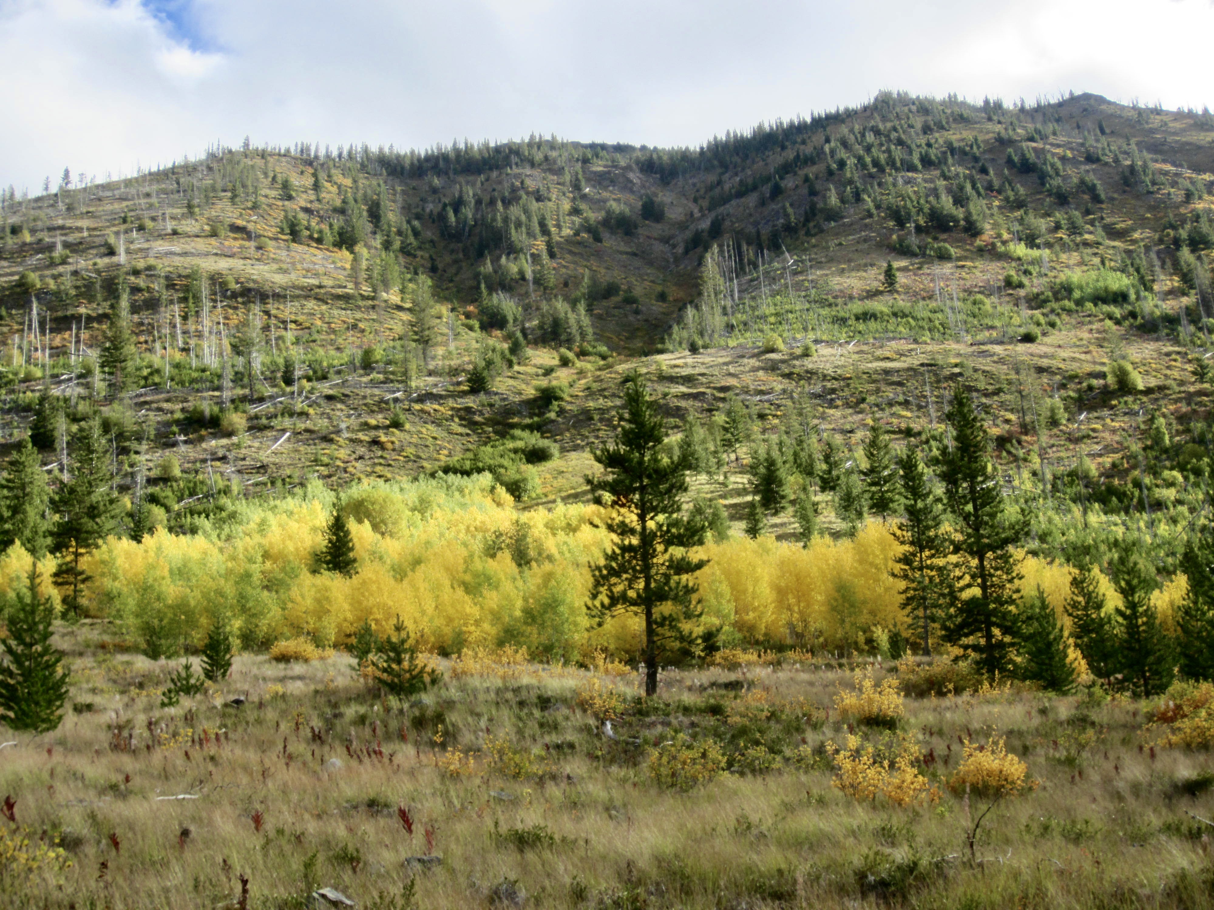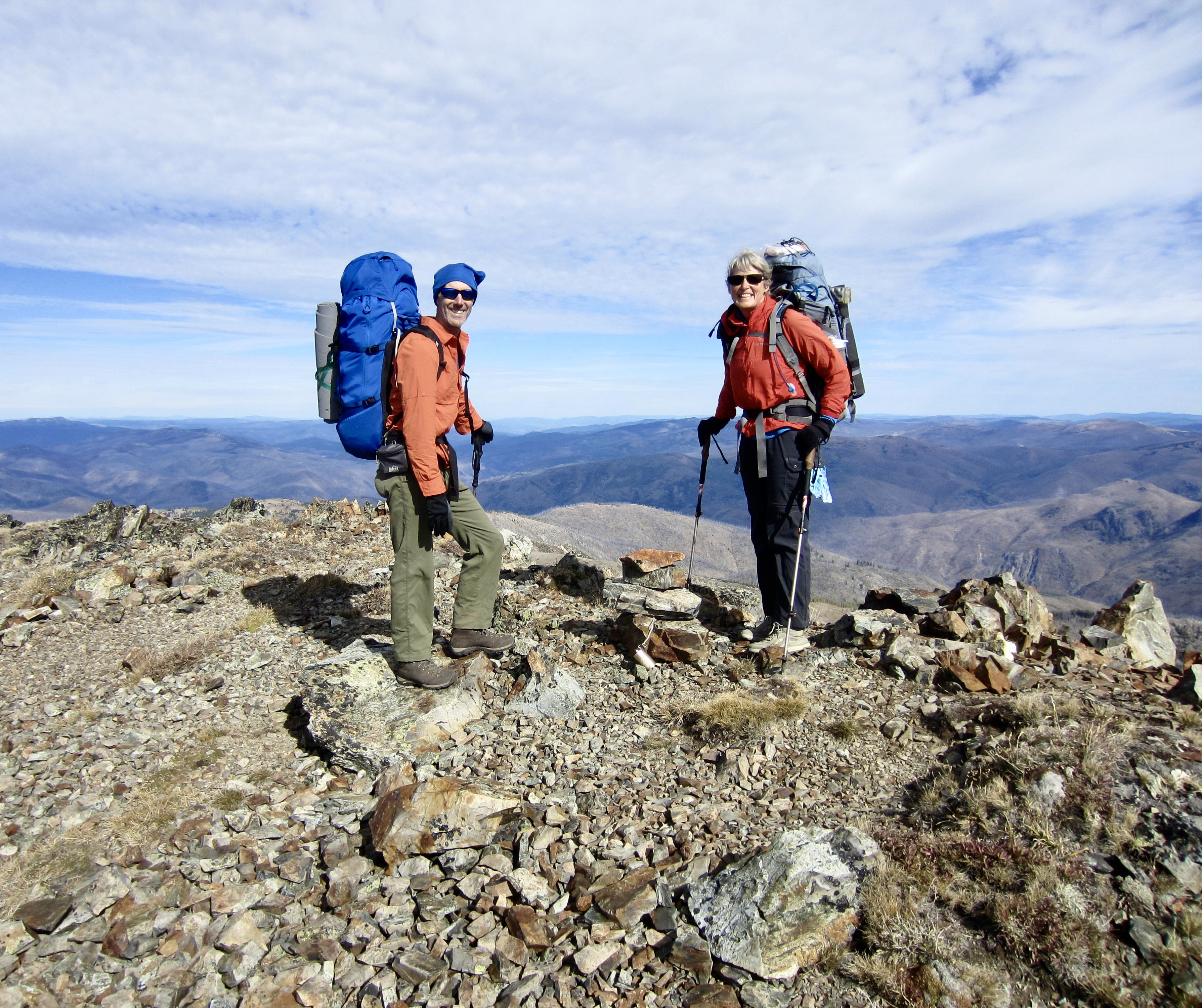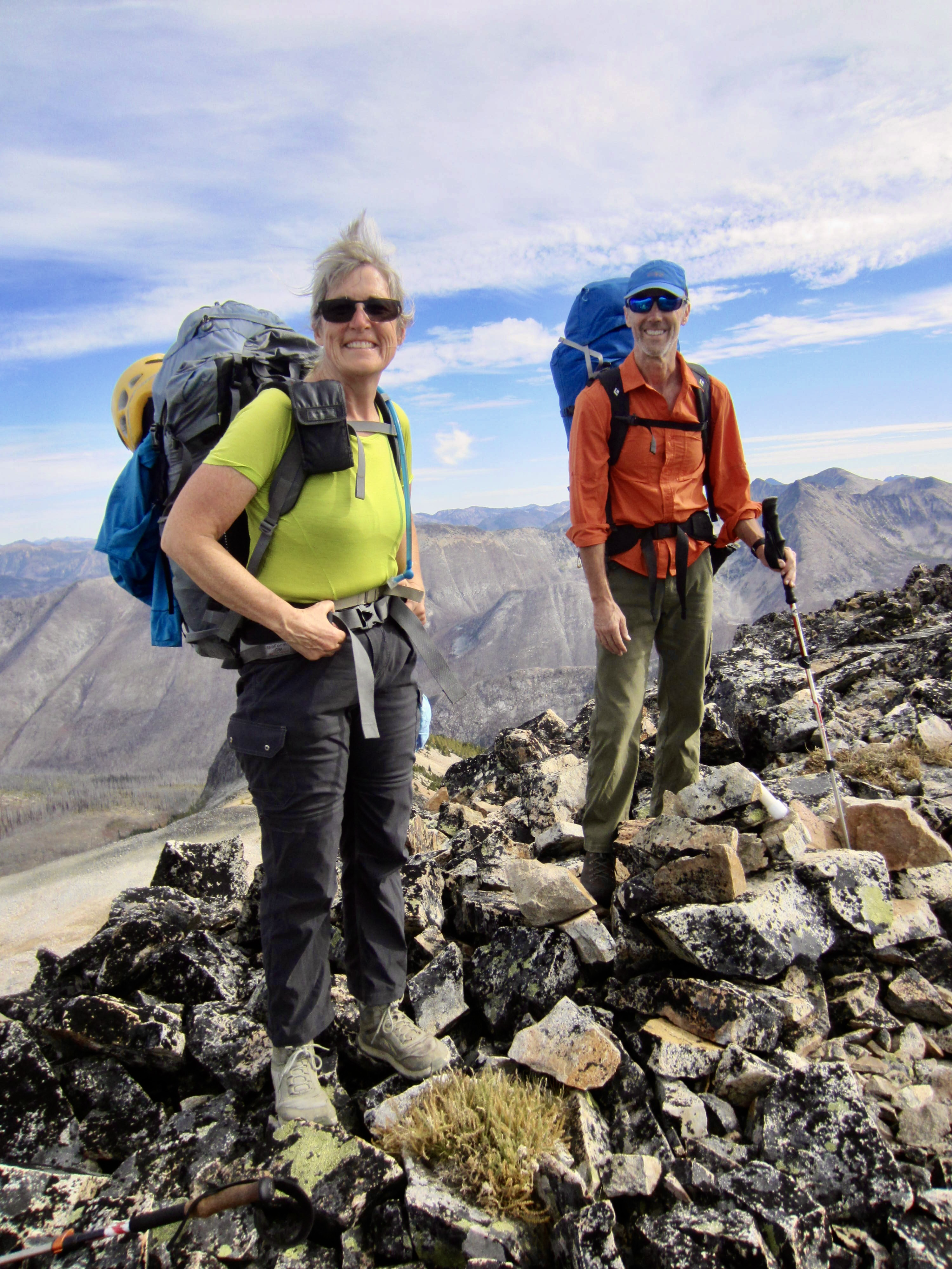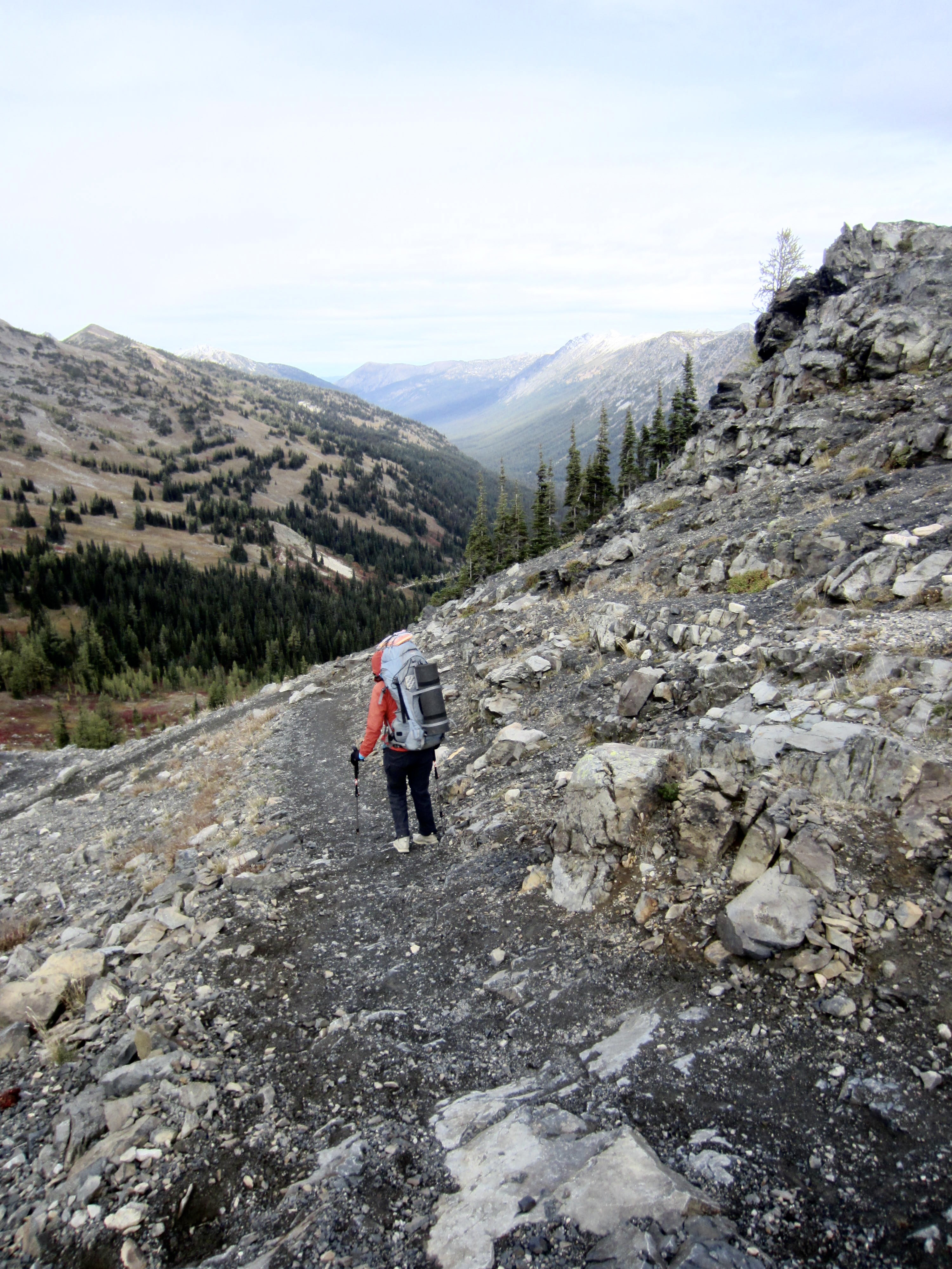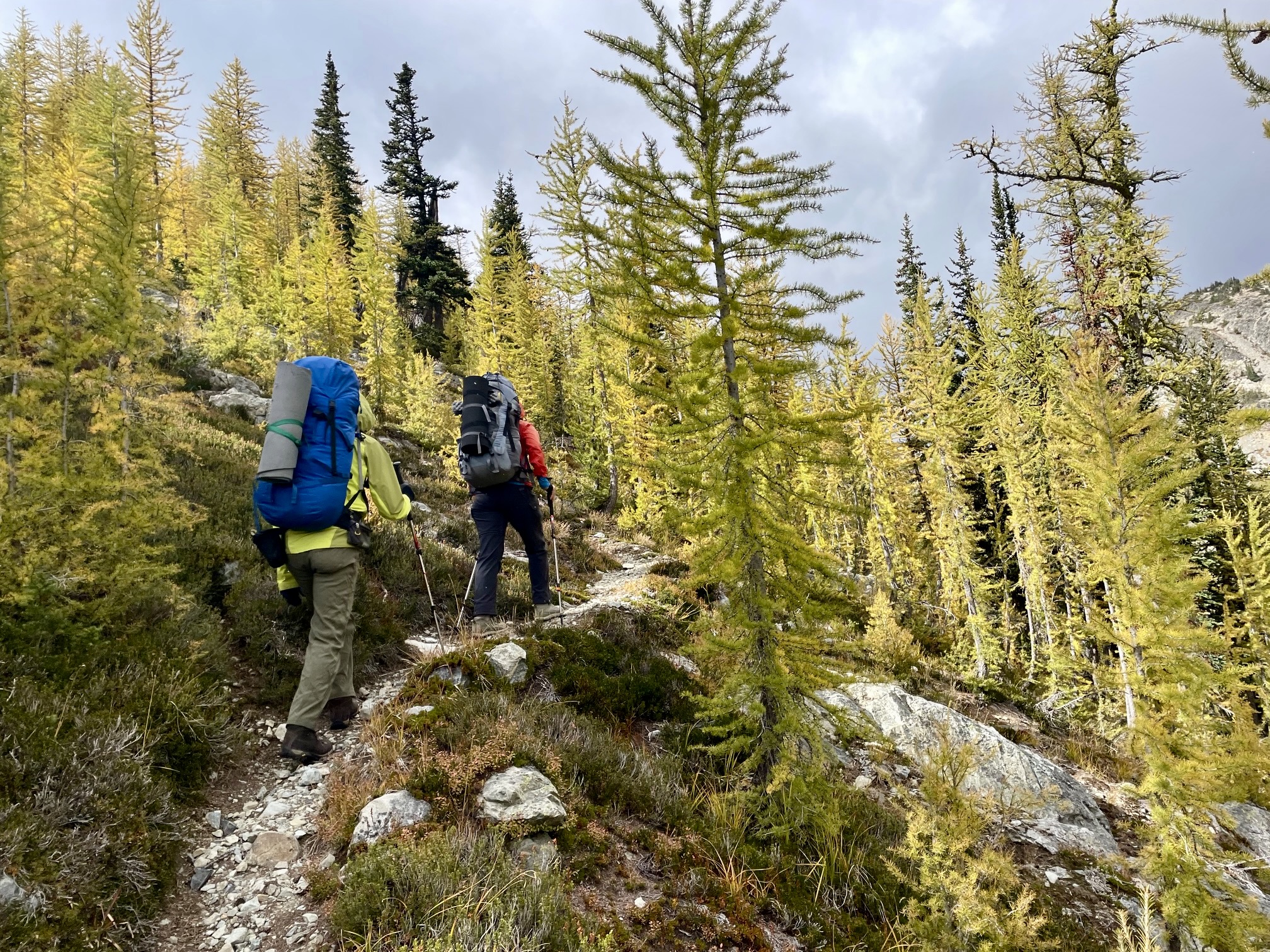 For this year’s Golden Larch Outing, Eileen, Todd, and I did a 40-mile loop through the Pasayten Mountains, starting at Slate Pass. The heart of our loop comprised a cross-country traverse up Tatoosh Ridge, over the summits of Ptarmigan Peak and Dot Mountain, between Mt. Lago and Mt. Carru, and down to Eureka Creek. Although most of the terrain offered pleasant and scenic travel, a few areas were unpleasant or just downright awful. Our weather ran the gamut from mild and sunny to cool and rainy to cold and snowy—all of which merely enhanced our adventure. We were a week or so too early for prime larch color but did find some golden zones.