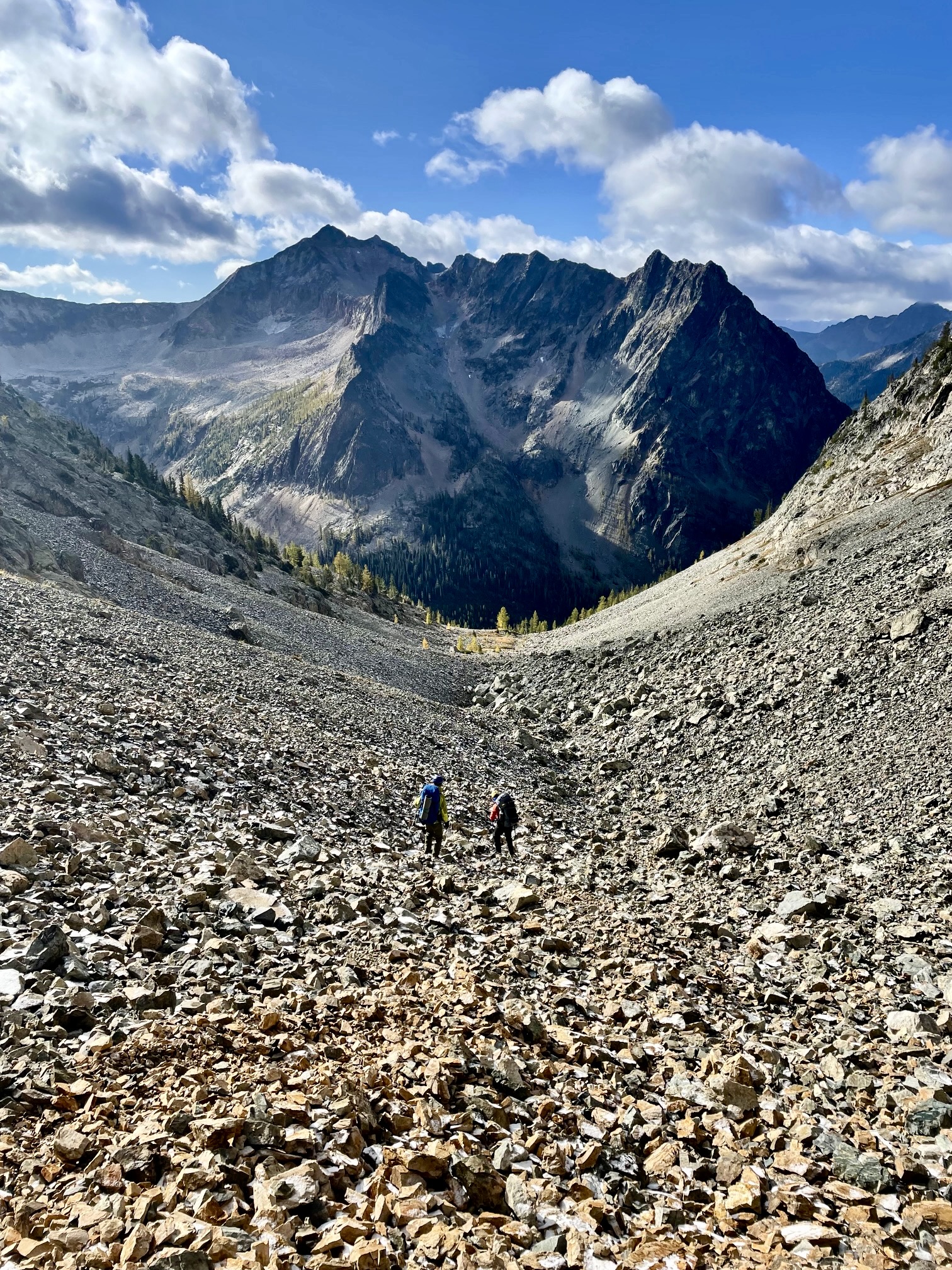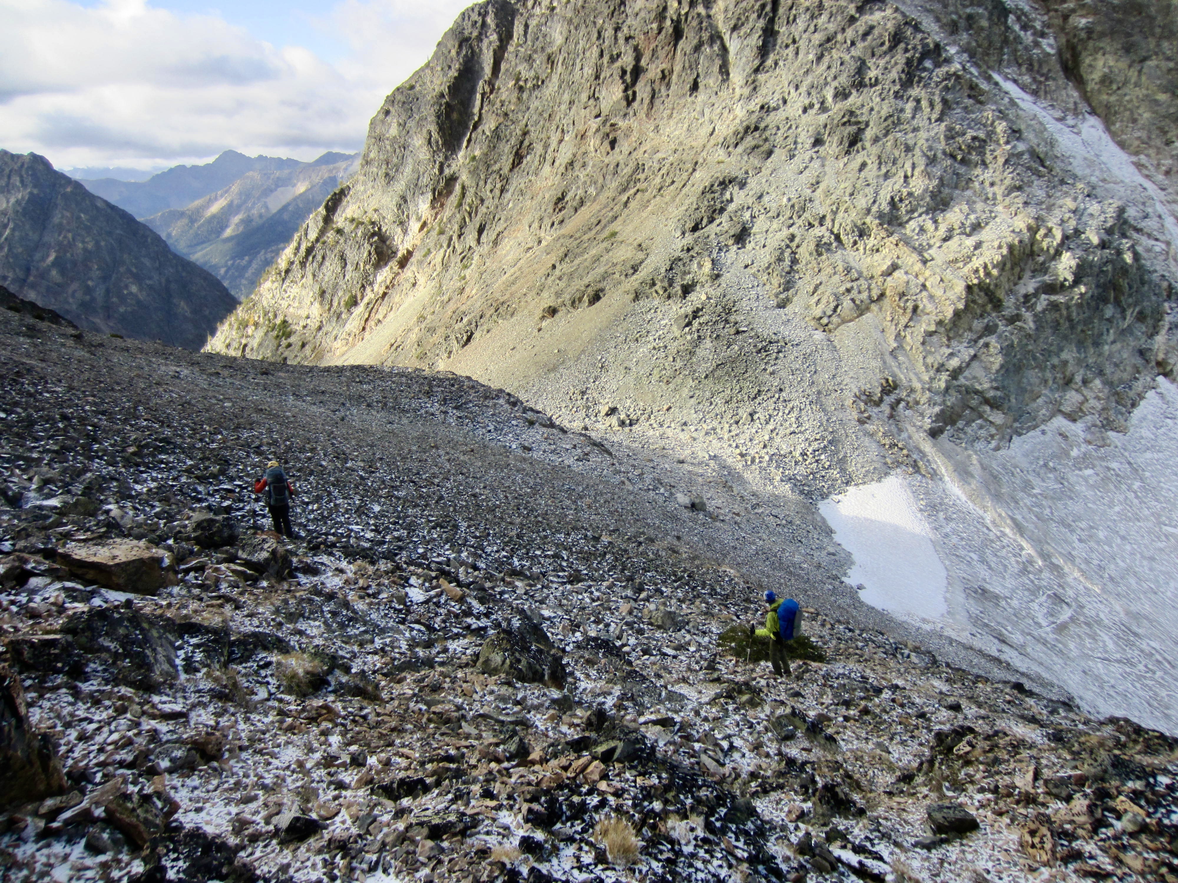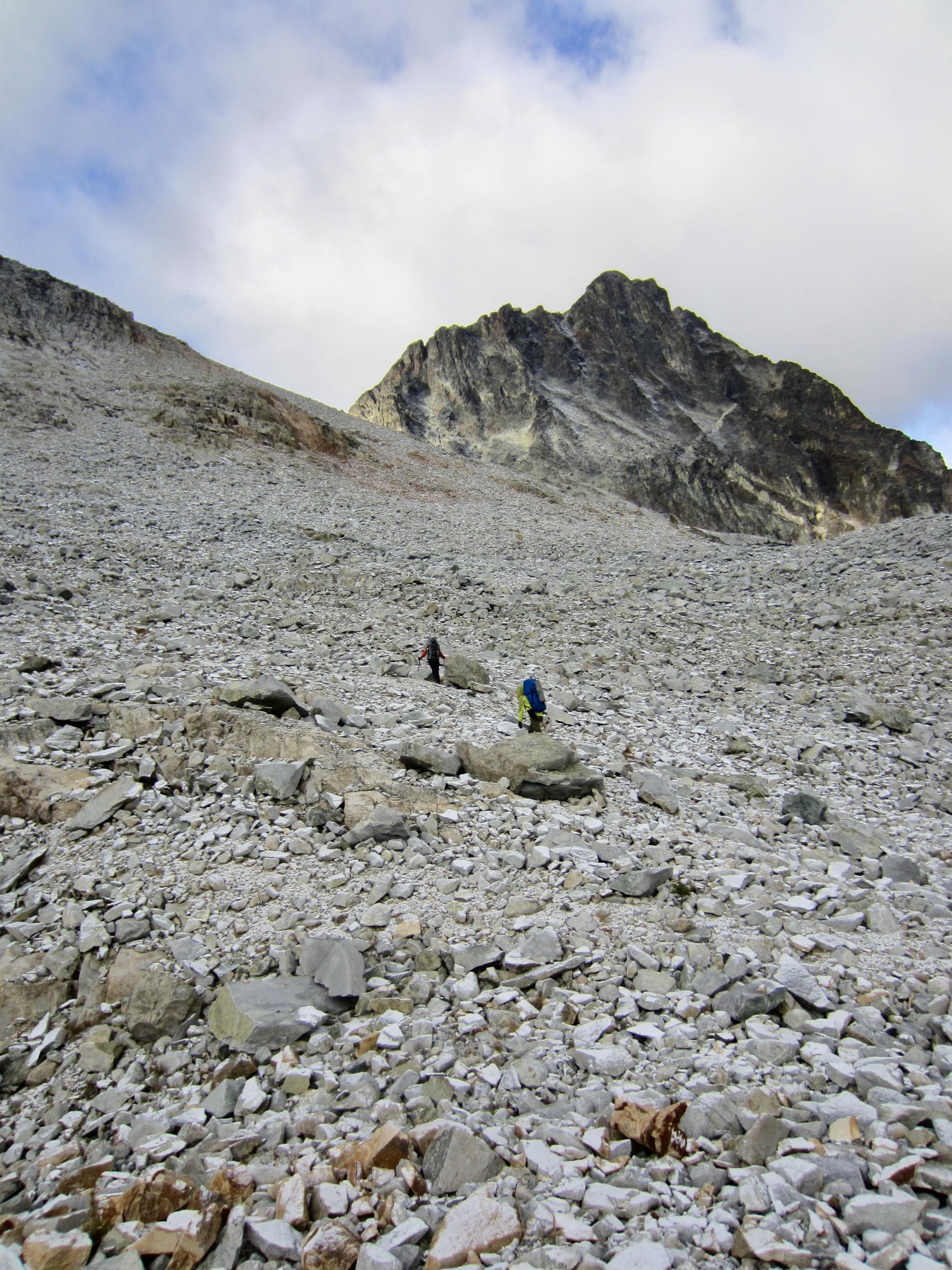 We crossed over the 7600-foot Lago–Carru Col in mid-morning and headed down a long, south-facing talus couloir. A cold wind was blowing through the couloir, but the sunshine helped to ease the chill. Rugged Monument Peak served as a beacon straight ahead.