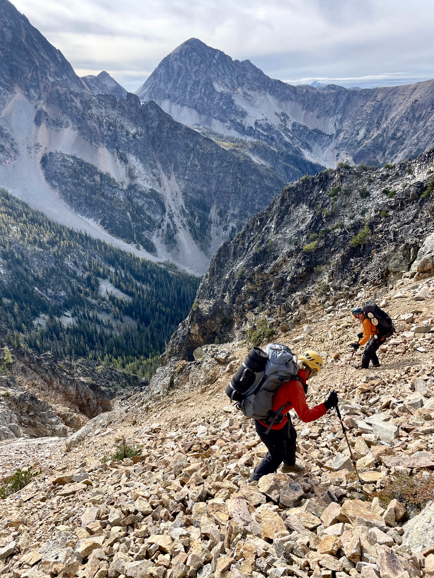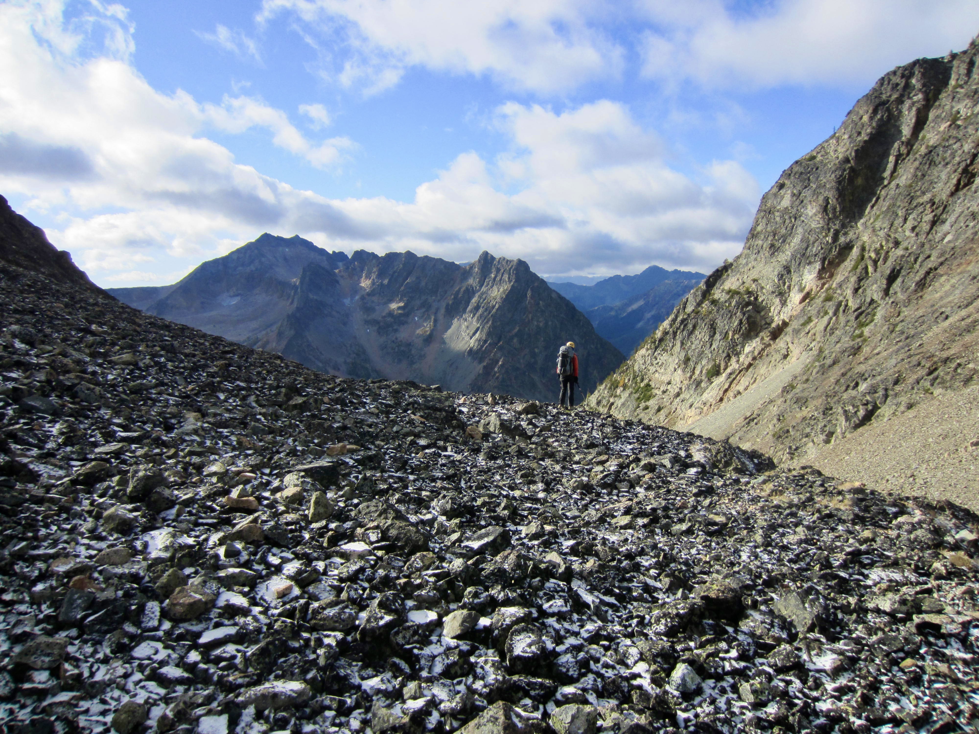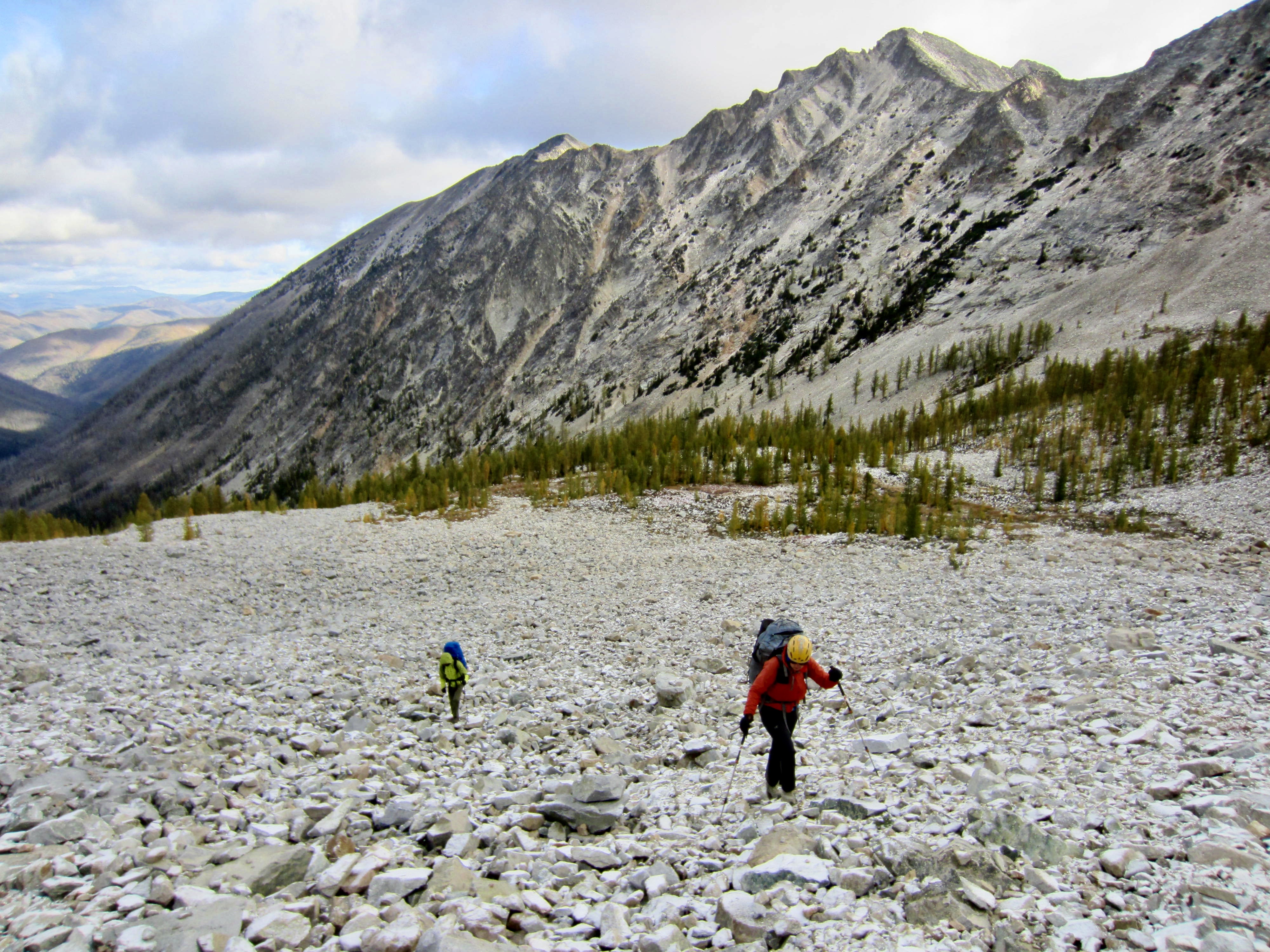 We crossed over the 7600-foot Lago–Carru Col in mid-morning and headed down a long, south-facing talus couloir. A cold wind was blowing through the couloir, but the sunshine helped to ease the chill. Rugged Monument Peak served as a beacon straight ahead.