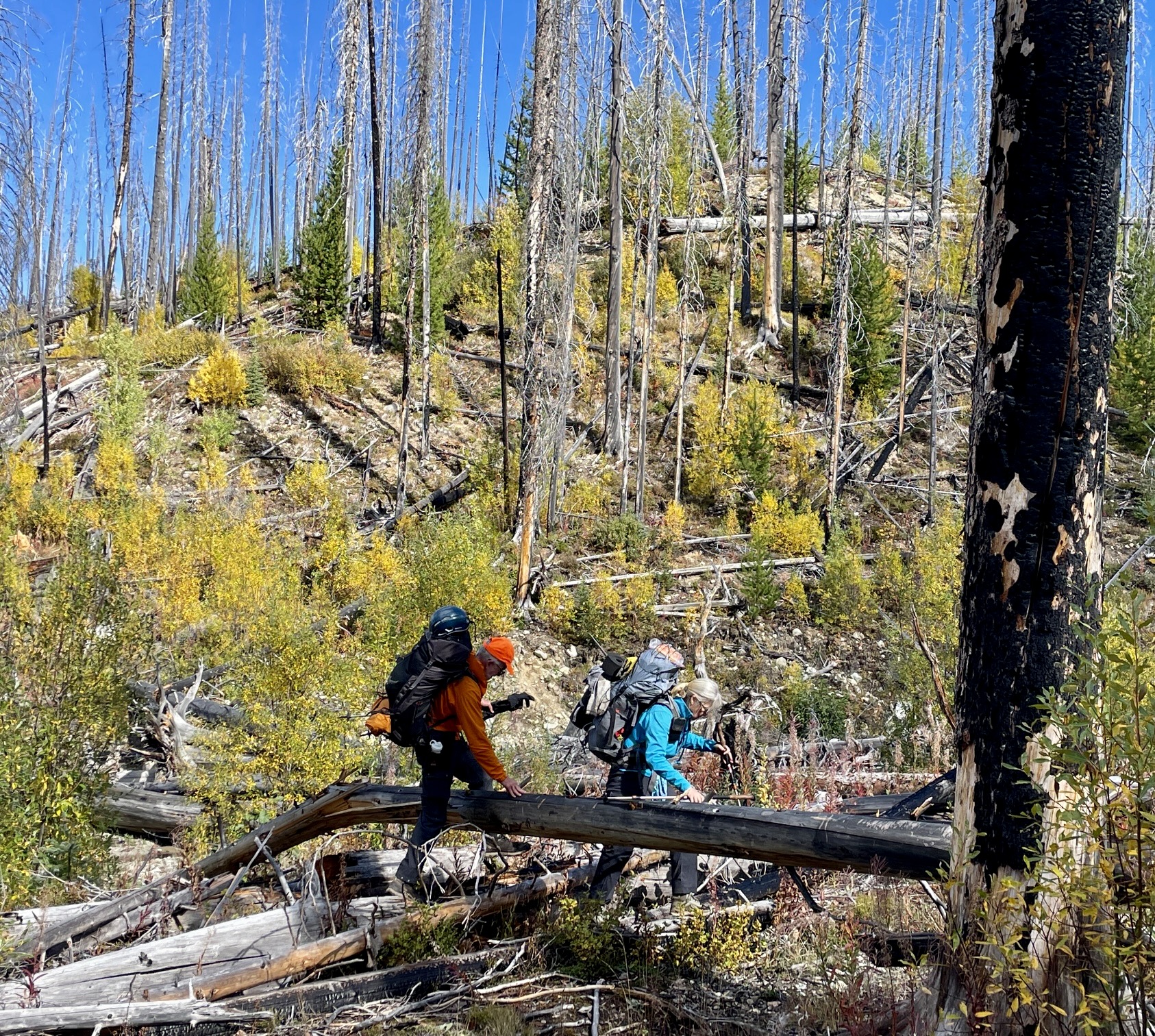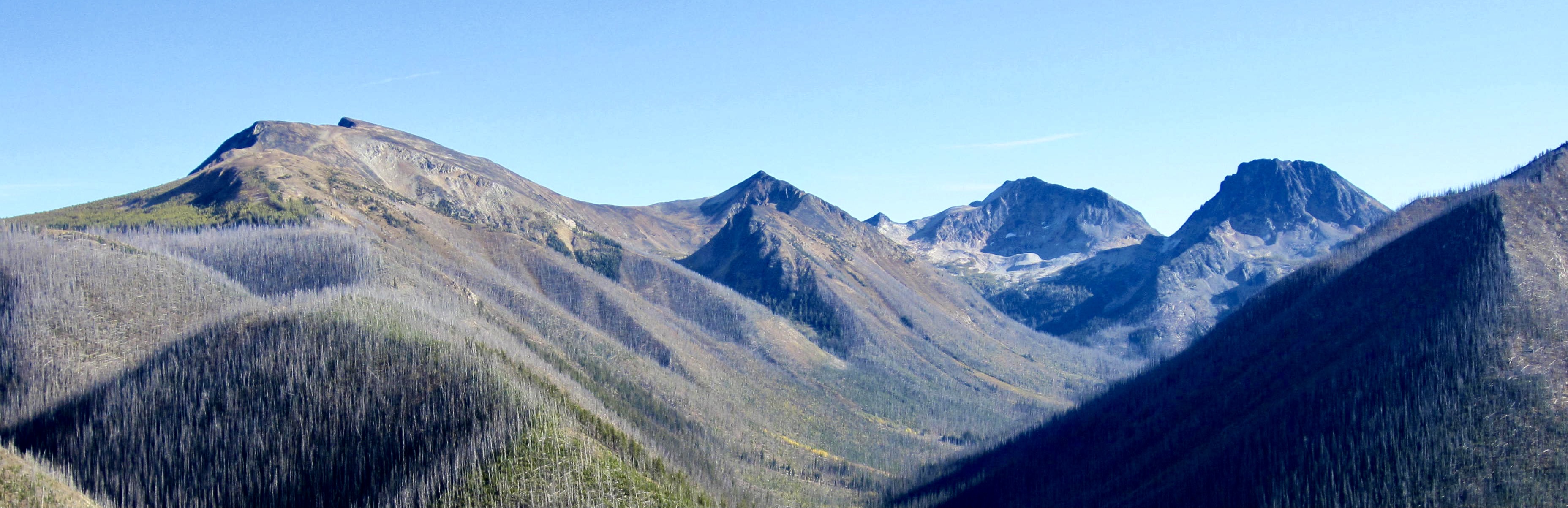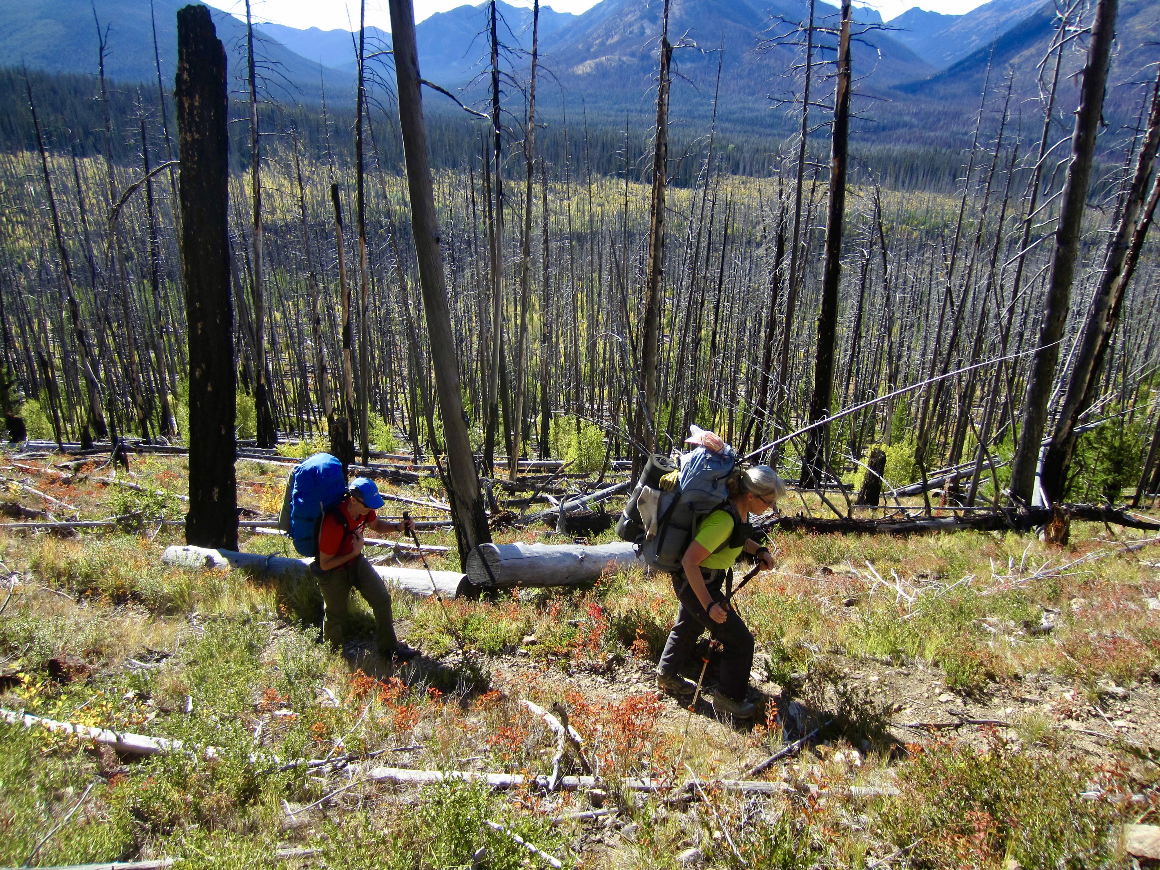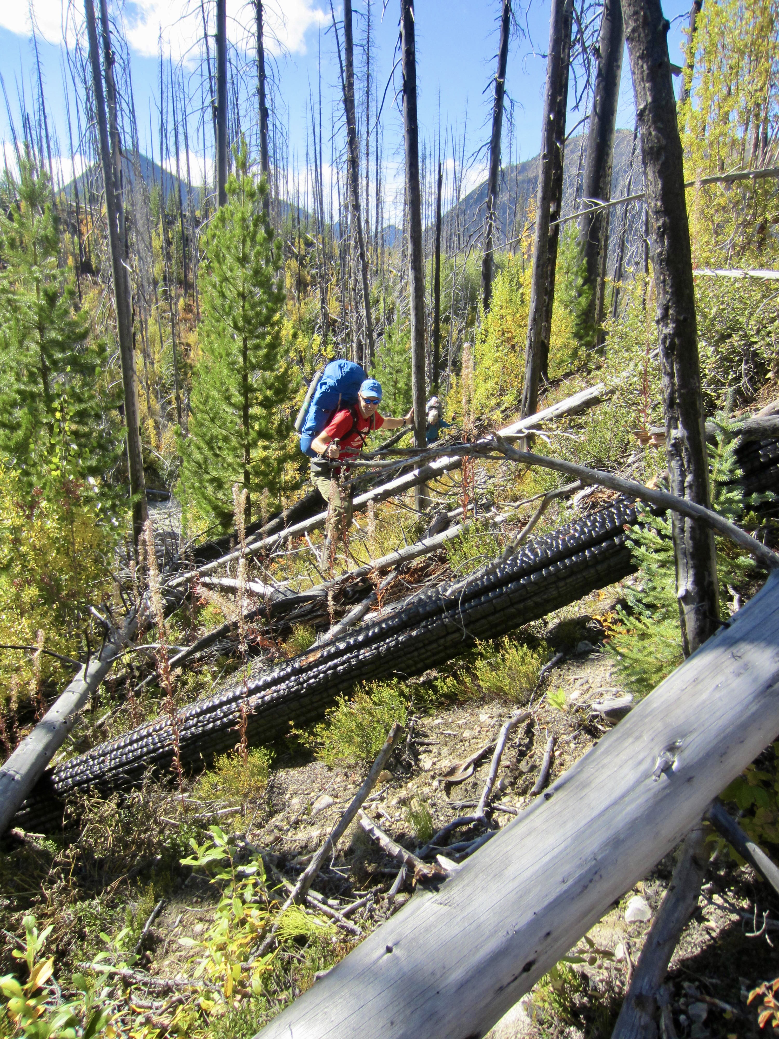 As we gradually gained elevation, the jackstraw forest thinned out and the travel improved. At 5900 feet, we rounded a corner and got an unobstructed view into the Lease Creek watershed. The entirety of Lease Creek Valley has been burned out, leaving a vast forest of dead snags and jackstraw trees. Ptarmigan Peak, Dot Mountain, Mt. Lago, and Mt. Carru were visible at the head of the valley—along with much of our planned cross-country traverse route.